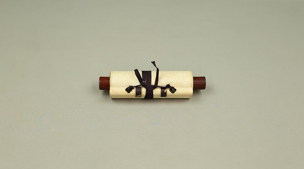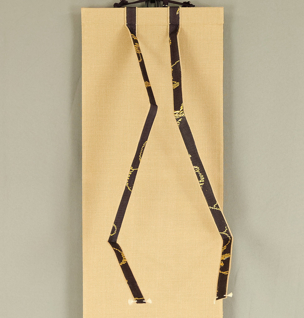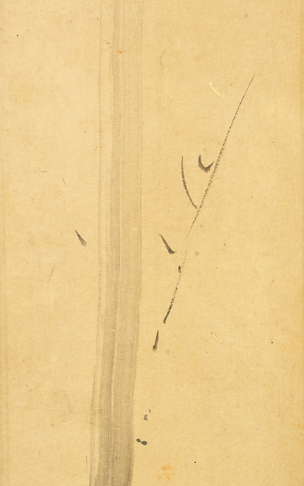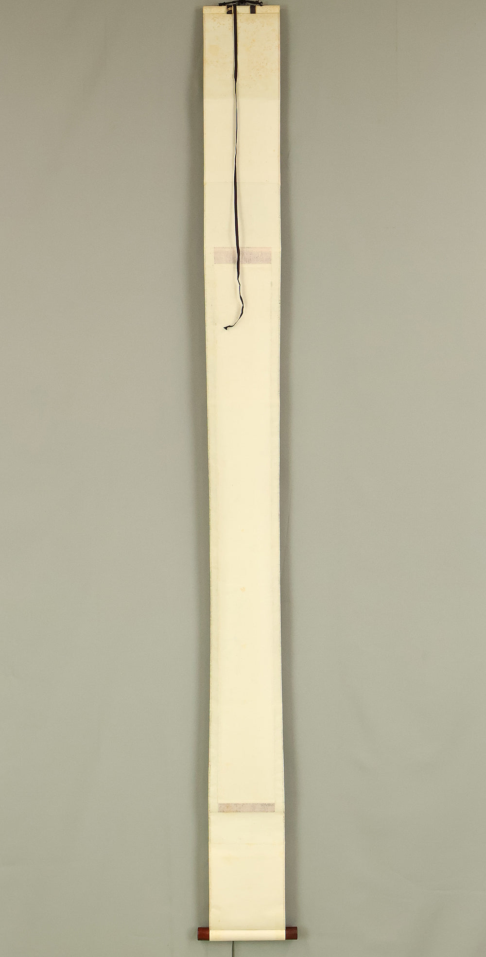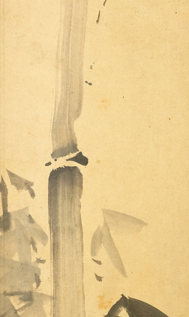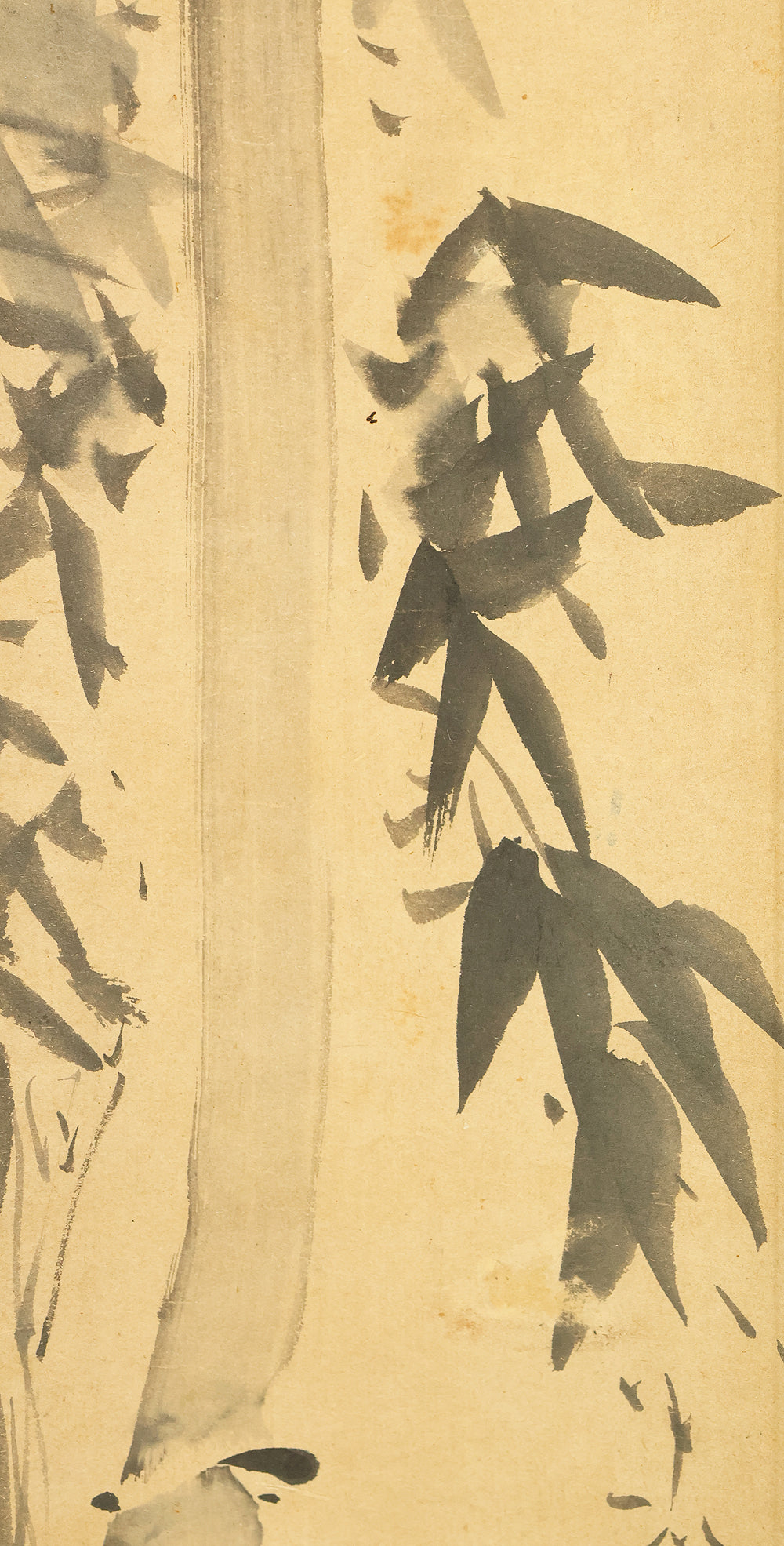 A rare and unusually slender hanging scroll attributed to Kano Tsunenobu (1636–1713), a prominent master of the Kano school. The work depicts a young bamboo stalk painted with superb economy of brushwork, capturing both the vitality and quiet dignity of the subject. The elongated vertical format enhances the sense of upward growth, making the bamboo appear elegant and weightless. Executed in soft ink tones typical of the Kano tradition, this scroll reflects the refined discipline and poetic sensitivity associated with court and shogunate painting of the Edo period. The brush handling is confident yet understated, allowing the natural beauty of the bamboo to speak for itself. Because of its extremely narrow proportions, this piece is particularly suitable for alcove display or intimate interior spaces, where its vertical rhythm adds a graceful architectural accent. A charming example of classical Japanese ink painting, and an appealing choice for collectors seeking works in rare and distinctive formats.