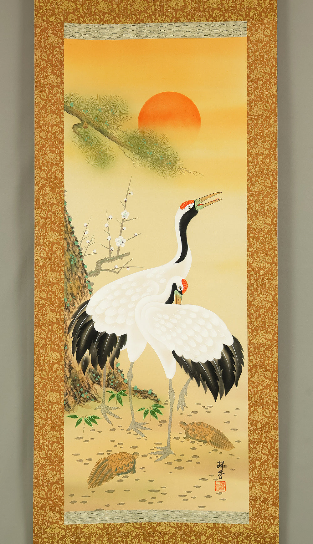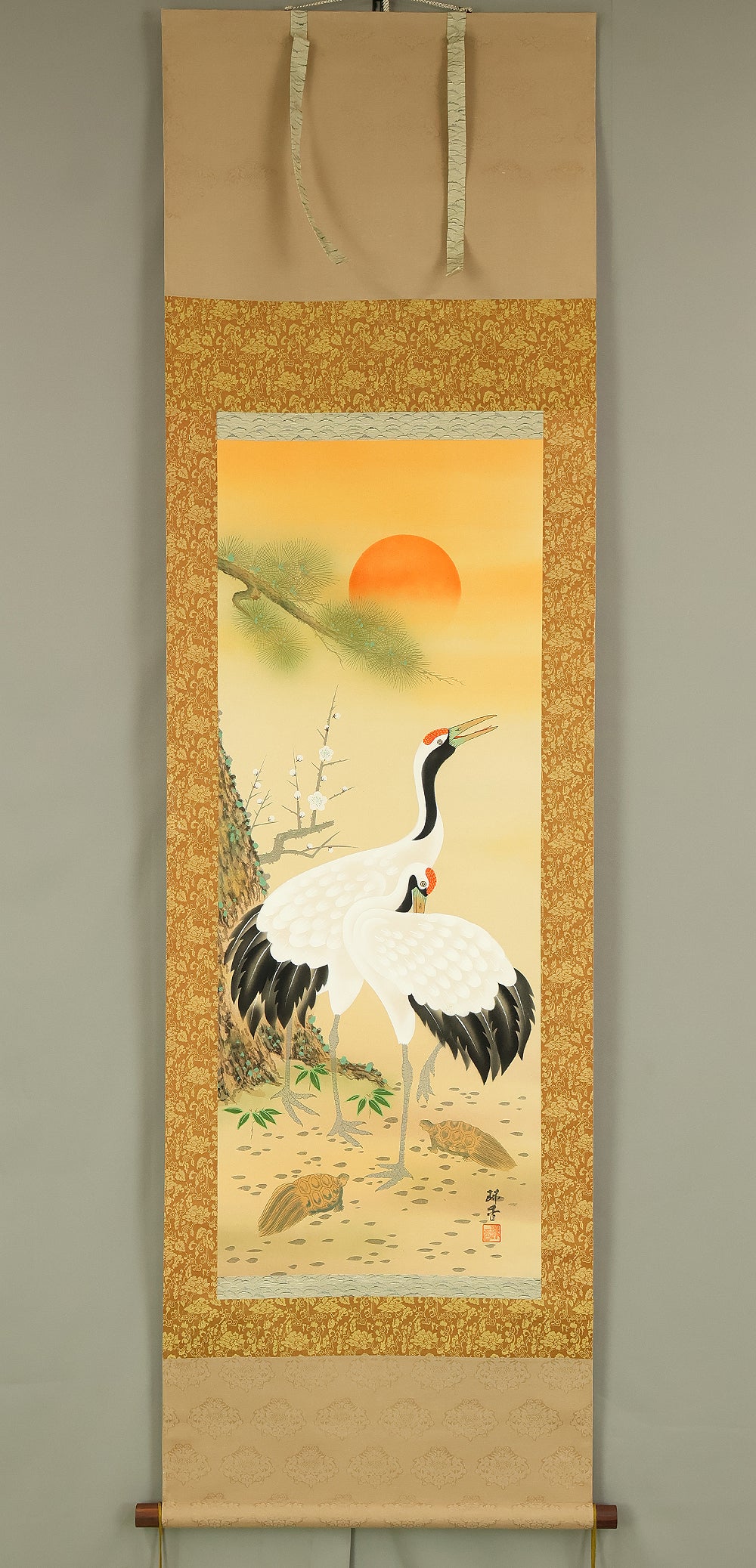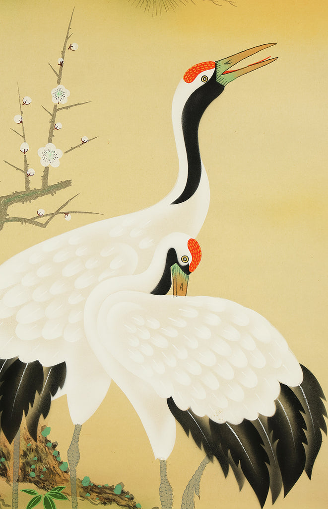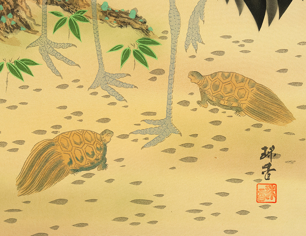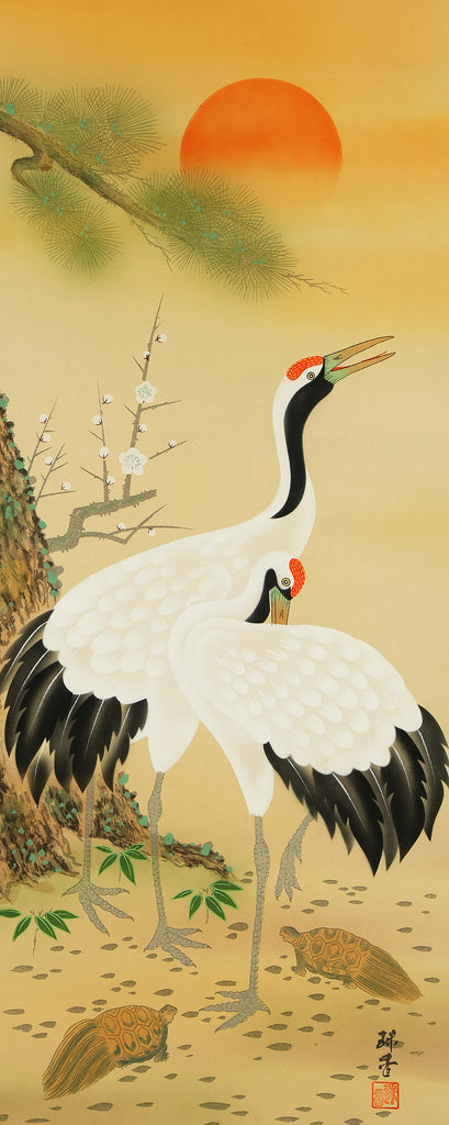 珠香 Juko Japanese art kakejiku kakemono wall hanging scroll / Cranes and Turtle Celebrating Longevity - The Symbol of Good Fortune with Original Box (Tomobako) RE373
