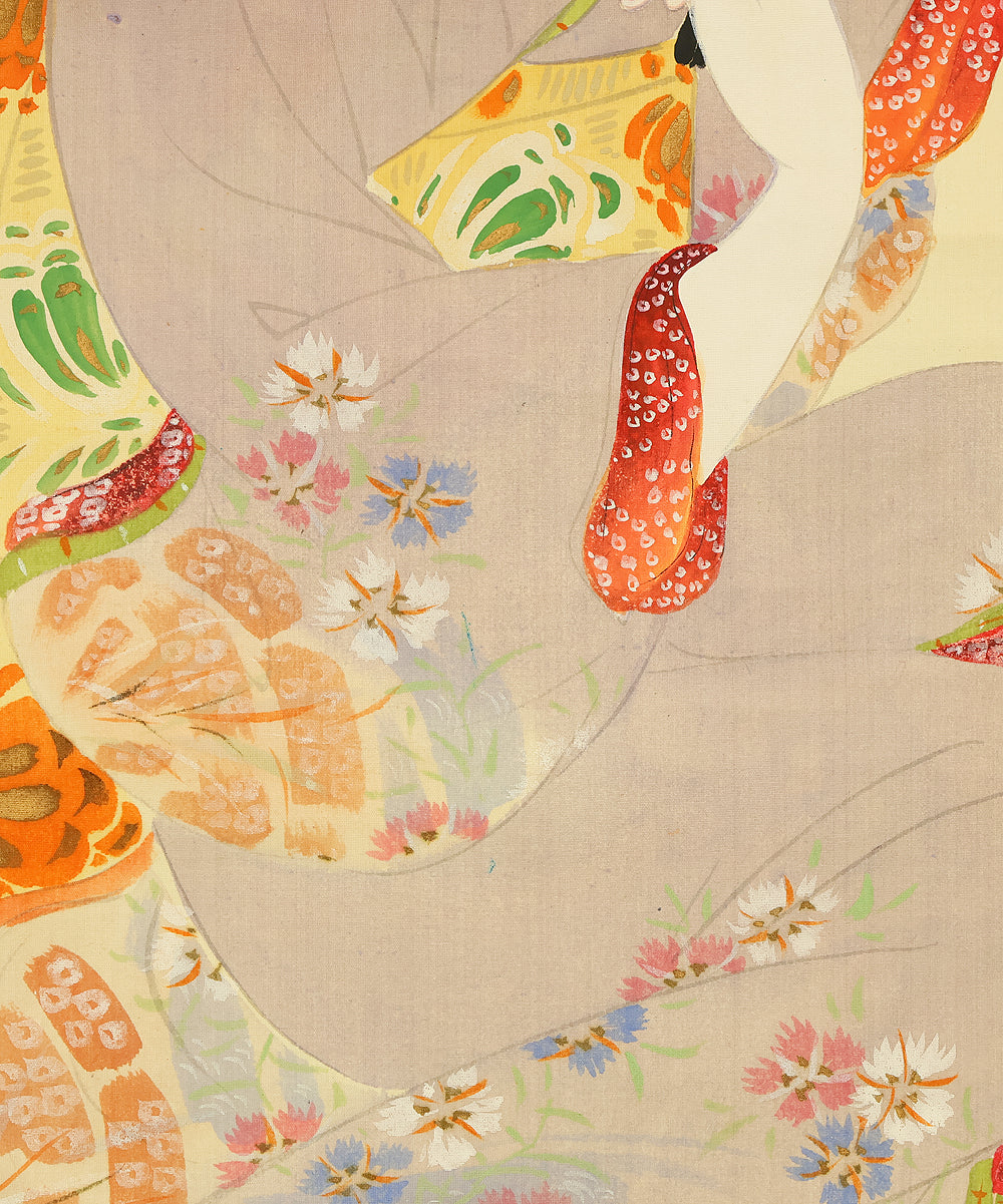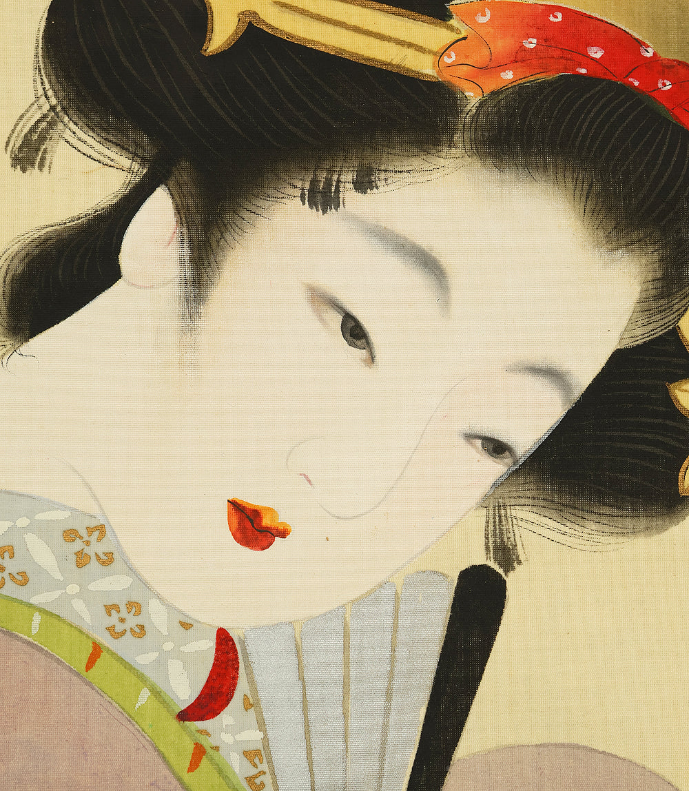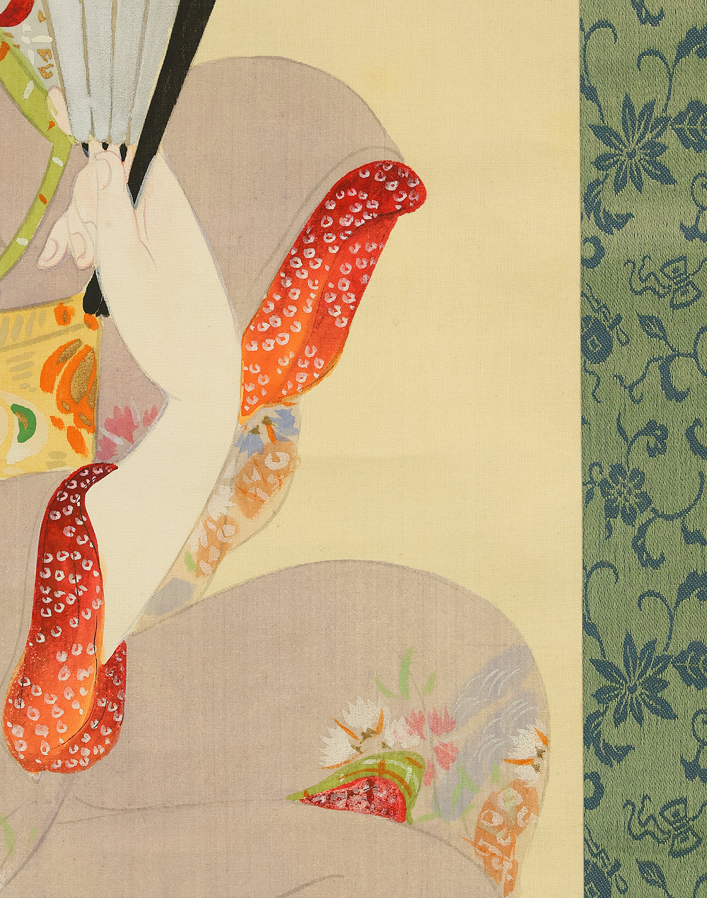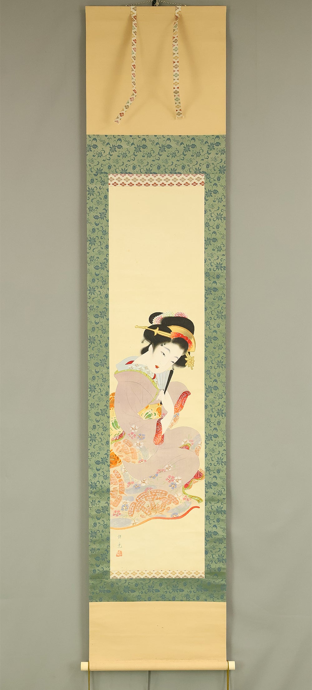 祥光 Shoko Japanese art kakejiku kakemono wall hanging scroll / Beautiful Woman in Kimono Holding Folding Fan with Original Box (Tomobako) RD963