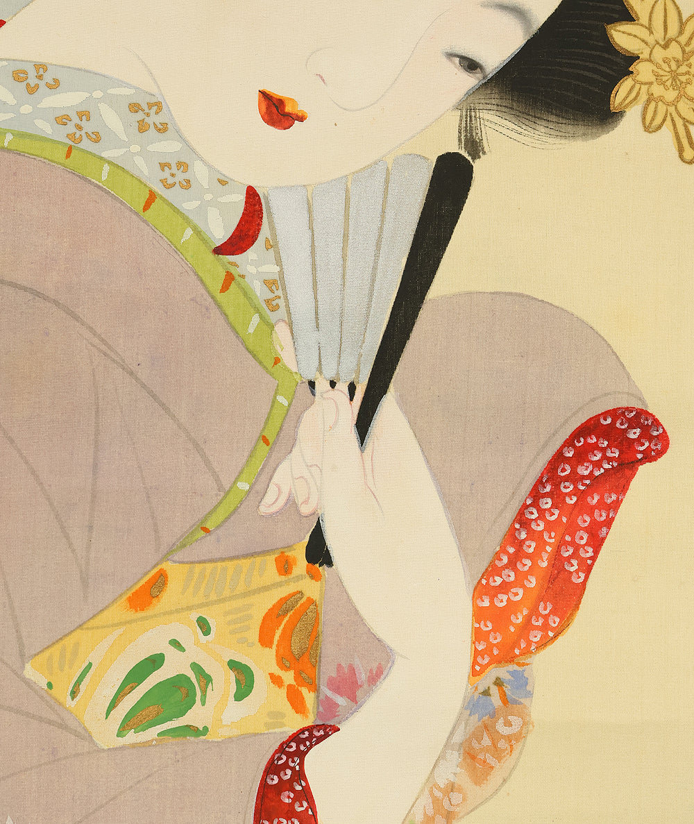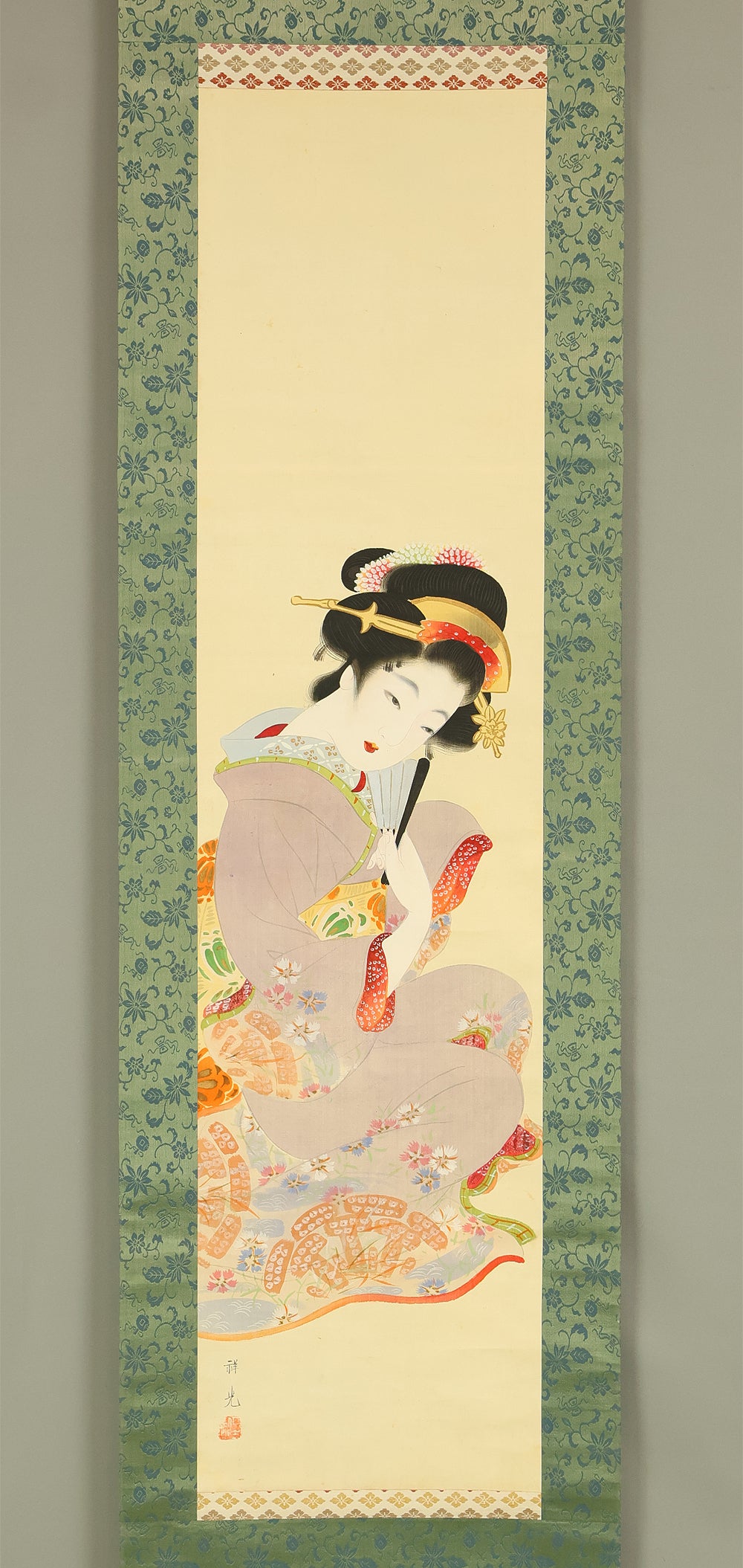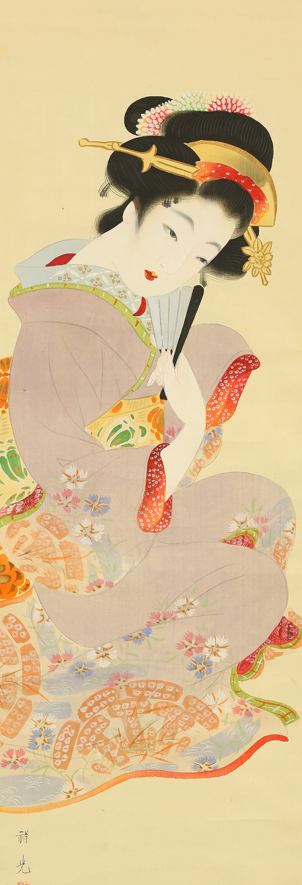 A refined bijin-ga hanging scroll by Shoko (祥光), depicting a beautifully dressed young woman seated gracefully while holding a folding fan. Rendered with delicate colors and soft brushwork, the composition highlights the elegance of her kimono, the detailed hair ornaments, and the gentle expression typical of modern Japanese beauty painting. The artist’s signature “Shoko” (祥光) and seal appear at the lower left. The work is accompanied by its original tomobako (wooden storage box), also signed and sealed by the artist. A charming and decorative piece of Japanese art, ideal for interior display and for collectors of bijin-ga or modern nihonga.