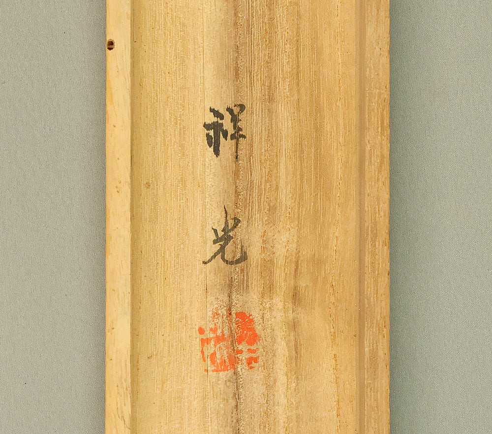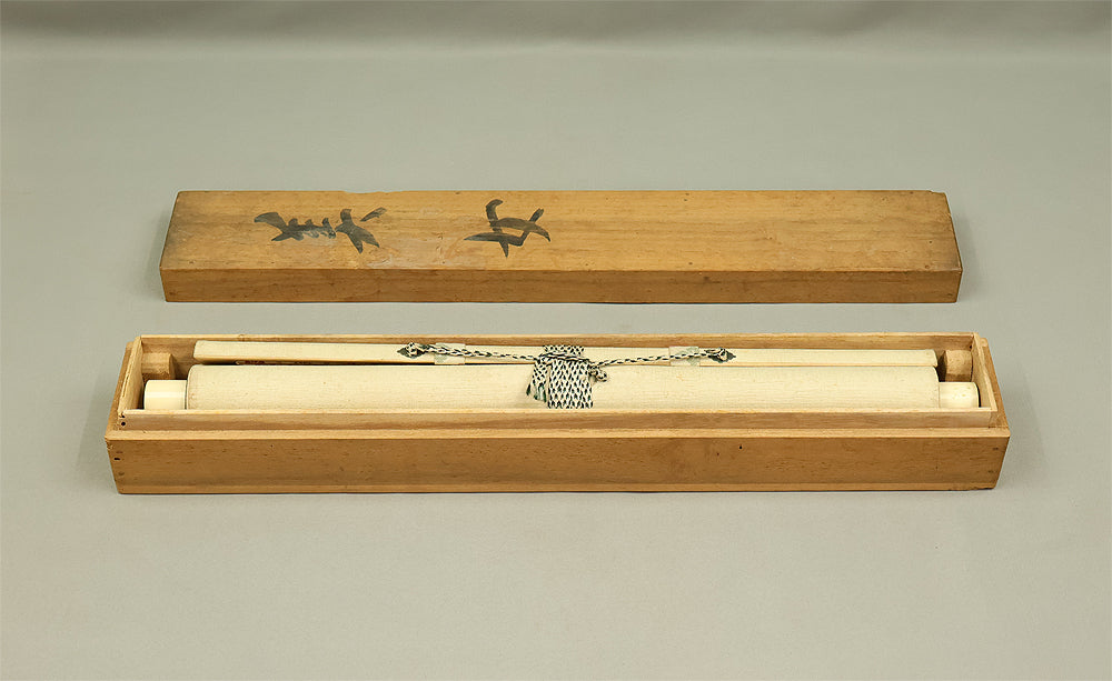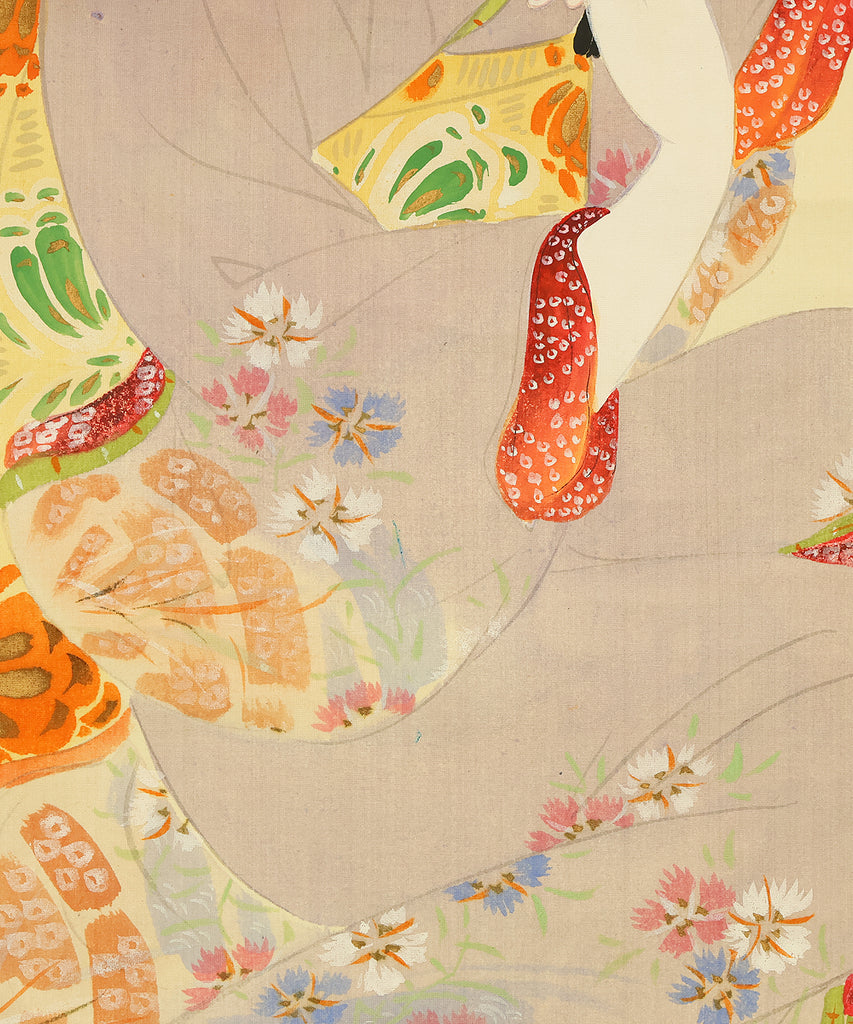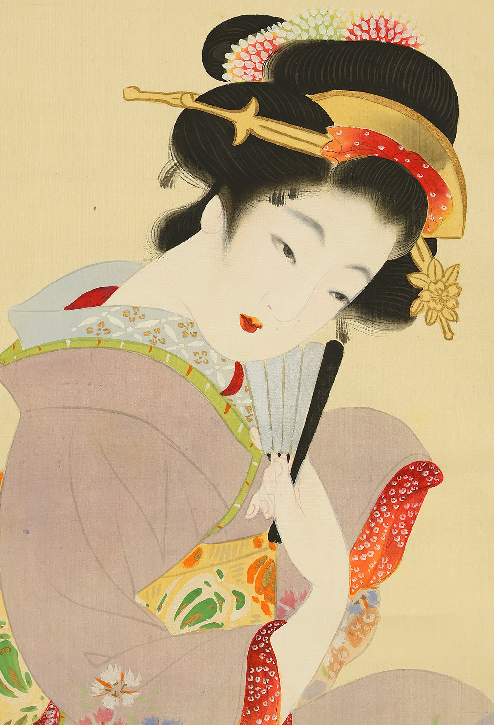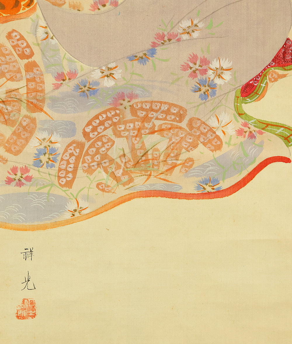 A refined bijin-ga hanging scroll by Shoko (祥光), depicting a beautifully dressed young woman seated gracefully while holding a folding fan. Rendered with delicate colors and soft brushwork, the composition highlights the elegance of her kimono, the detailed hair ornaments, and the gentle expression typical of modern Japanese beauty painting. The artist’s signature “Shoko” (祥光) and seal appear at the lower left. The work is accompanied by its original tomobako (wooden storage box), also signed and sealed by the artist. A charming and decorative piece of Japanese art, ideal for interior display and for collectors of bijin-ga or modern nihonga.