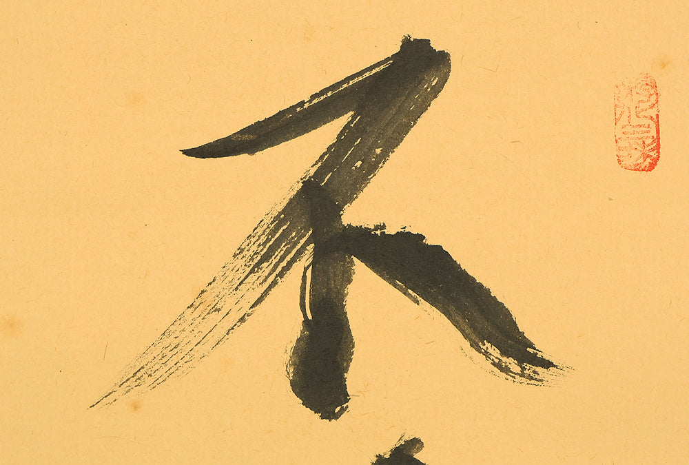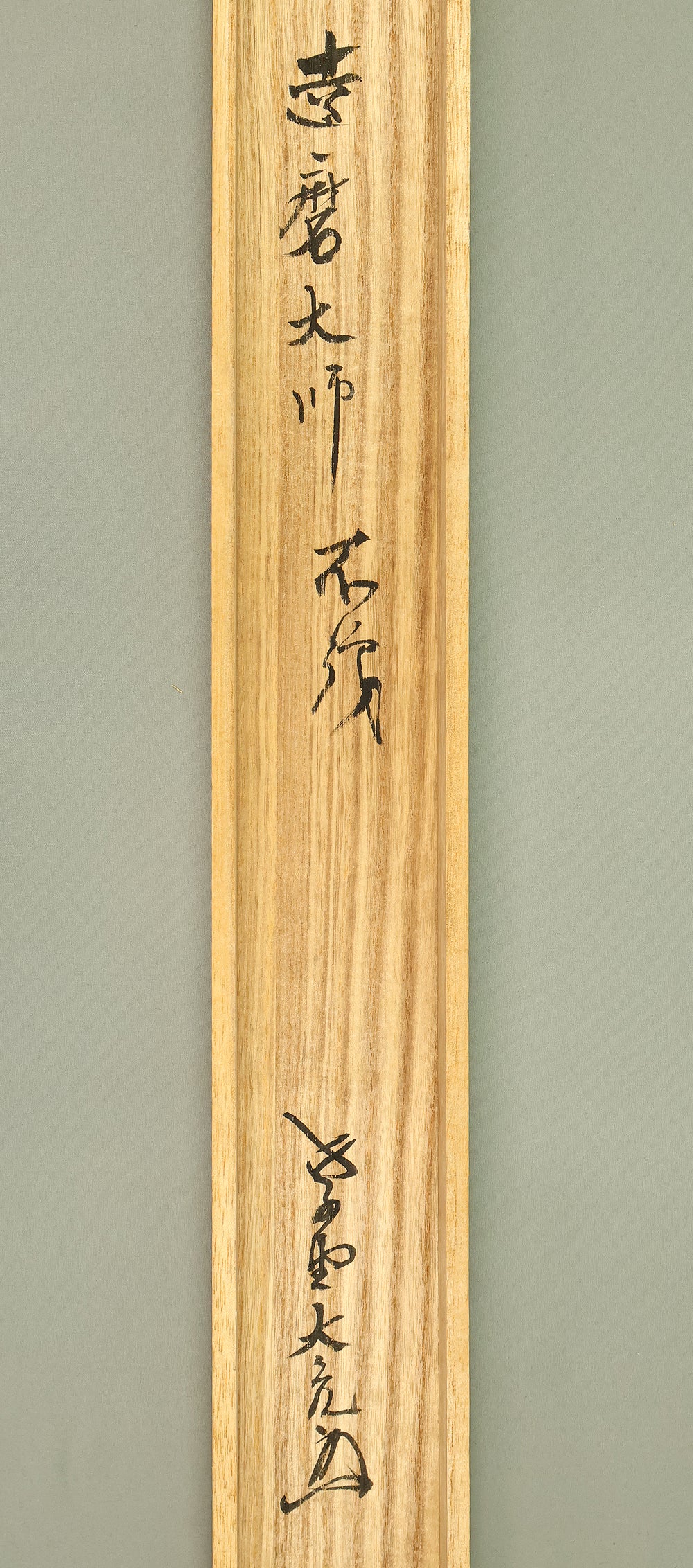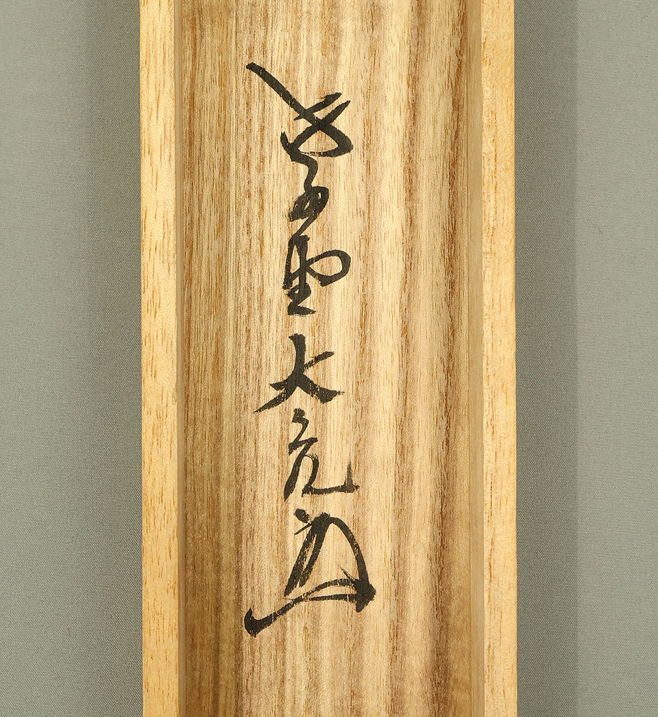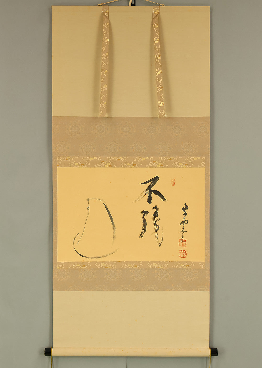 Rendered with an immediacy that reflects both Zen insight and personal conviction, this hanging scroll by Tachibana Daiki (1899–2005) presents the bold character “Fushiki”—a declaration of “not knowing,” a stance that frees one from fixed ideas and opens the way to genuine understanding. Daiki’s brush moves with a seasoned confidence shaped by decades at Daitoku‑ji, where he served as monk, tea master, and trusted advisor to figures across Japan’s political and business worlds. The accompanying image of Daruma, founder of Zen, reinforces the spirit of directness and independence embodied in the phrase. Signed “Murasakino Daiki” and sealed with his distinctive marks, the work carries the quiet authority of a lifetime devoted to practice. The scroll is housed in its original tomobako, completing a piece that unites Zen teaching, expressive calligraphy, and Daiki’s unmistakable presence.