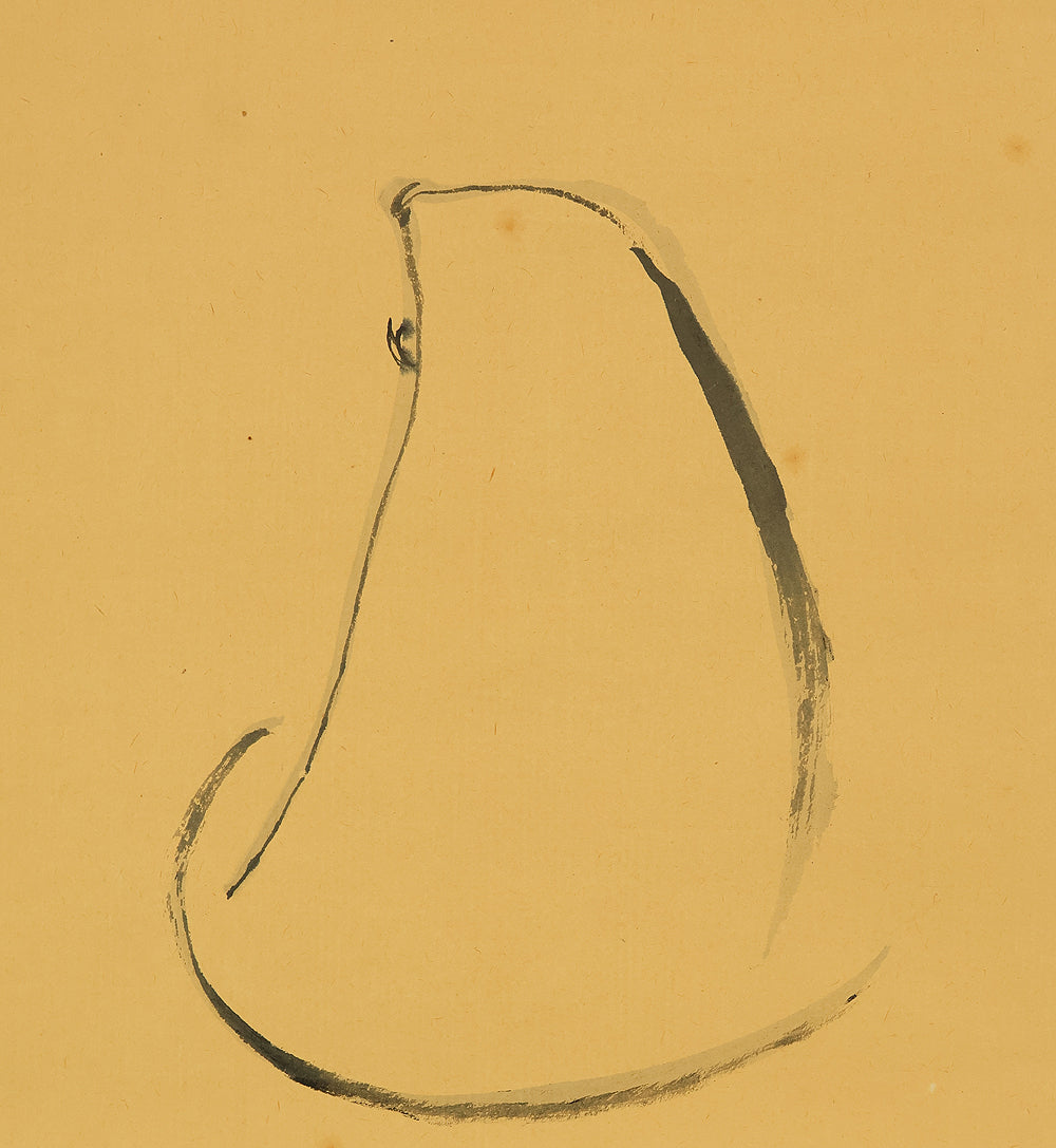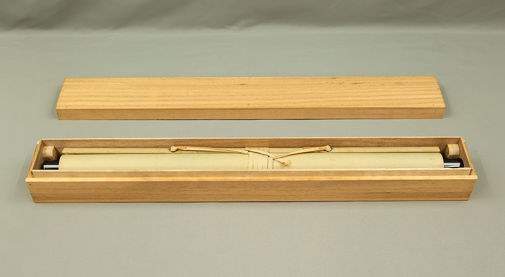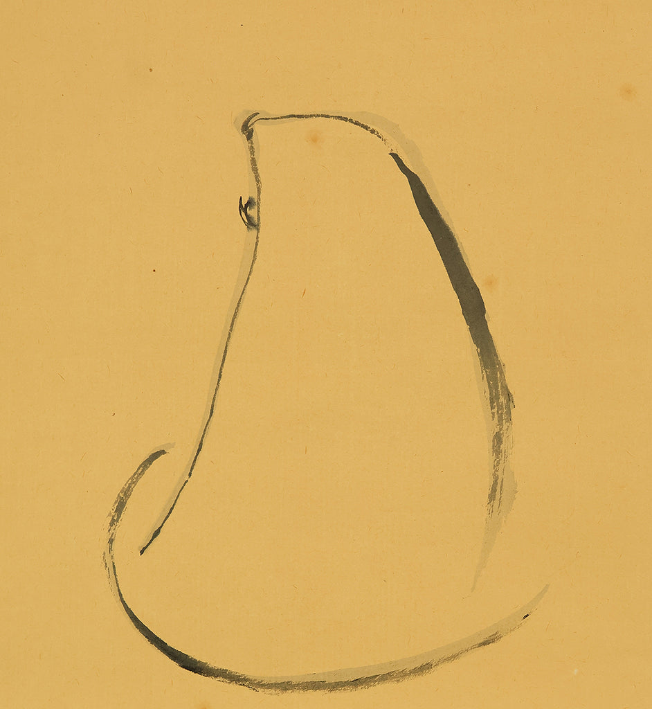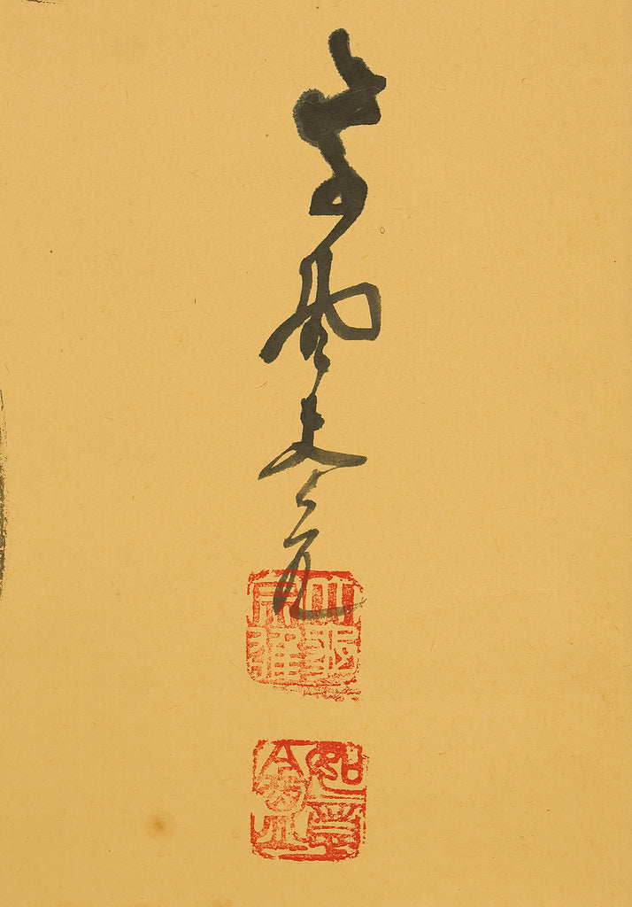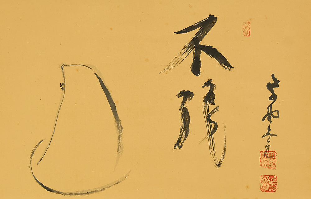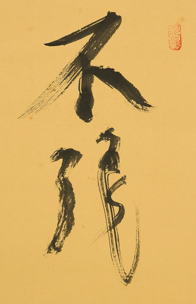Rendered with an immediacy that reflects both Zen insight and personal conviction, this hanging scroll by Tachibana Daiki (1899–2005) presents the bold character “Fushiki”—a declaration of “not knowing,” a stance that frees one from fixed ideas and opens the way to genuine understanding. Daiki’s brush moves with a seasoned confidence shaped by decades at Daitoku‑ji, where he served as monk, tea master, and trusted advisor to figures across Japan’s political and business worlds. The accompanying image of Daruma, founder of Zen, reinforces the spirit of directness and independence embodied in the phrase. Signed “Murasakino Daiki” and sealed with his distinctive marks, the work carries the quiet authority of a lifetime devoted to practice. The scroll is housed in its original tomobako, completing a piece that unites Zen teaching, expressive calligraphy, and Daiki’s unmistakable presence.