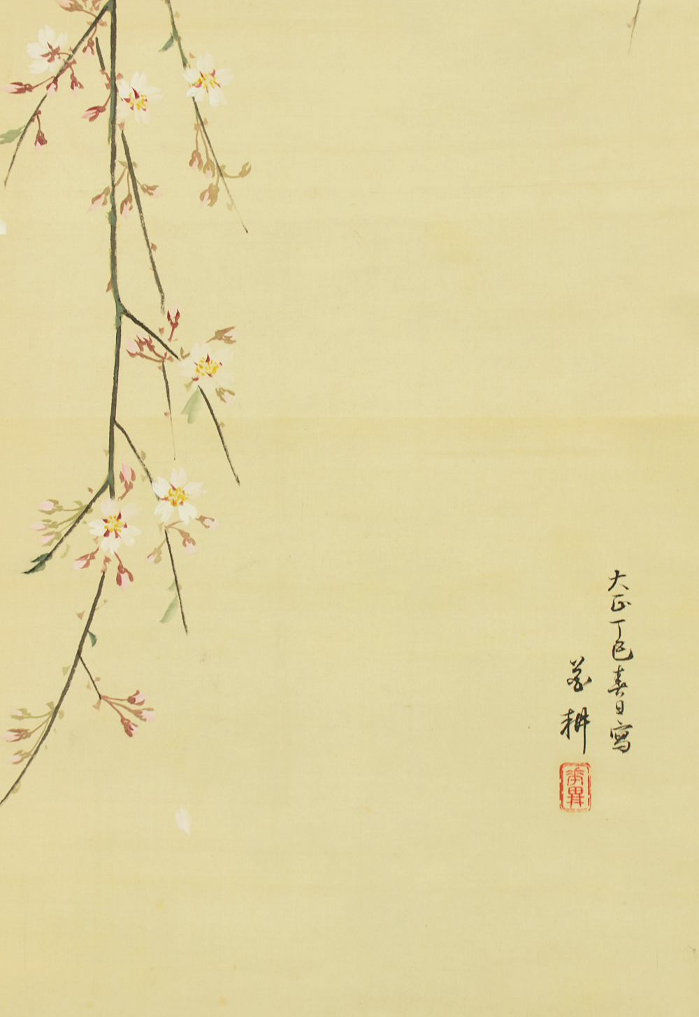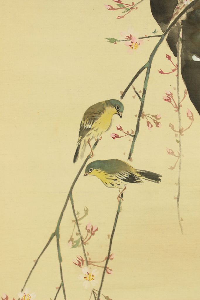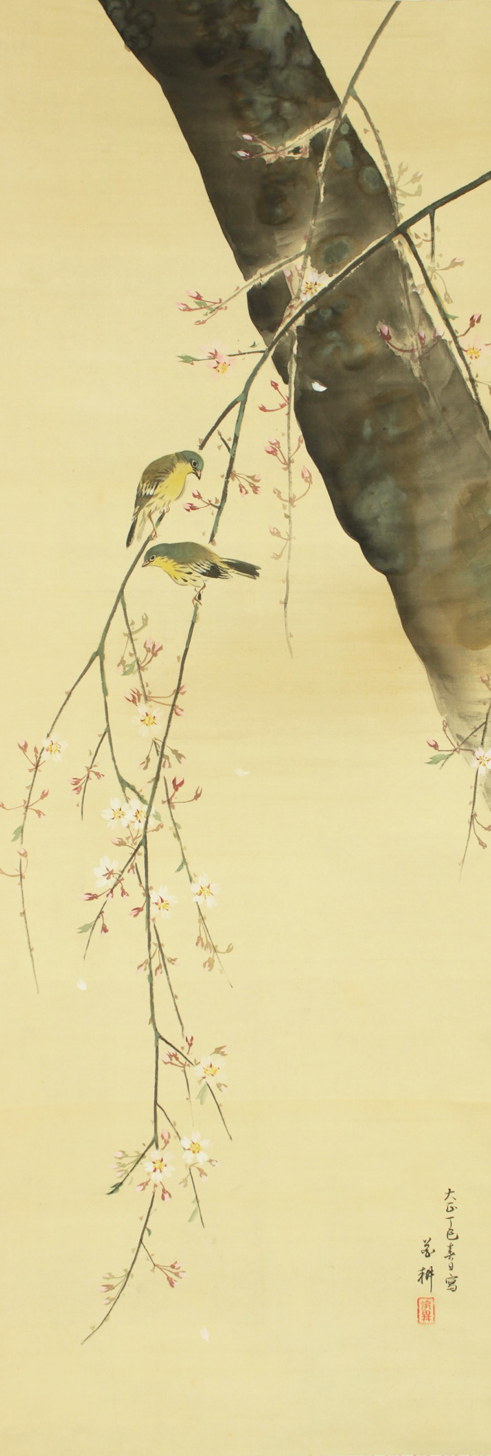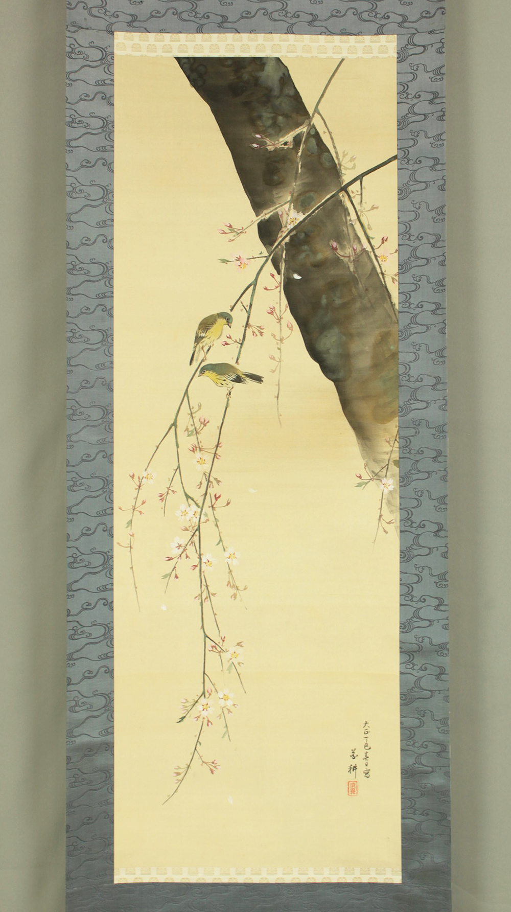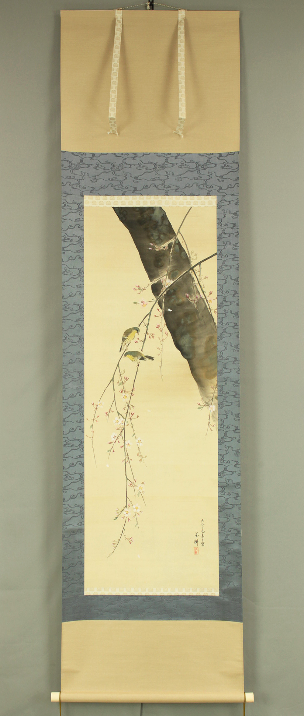 花耕 Kako Japanese art kakejiku kakemono wall hanging scroll / Weeping Cherry Tree and Little Bird with Original Box (Tomobako) RD554