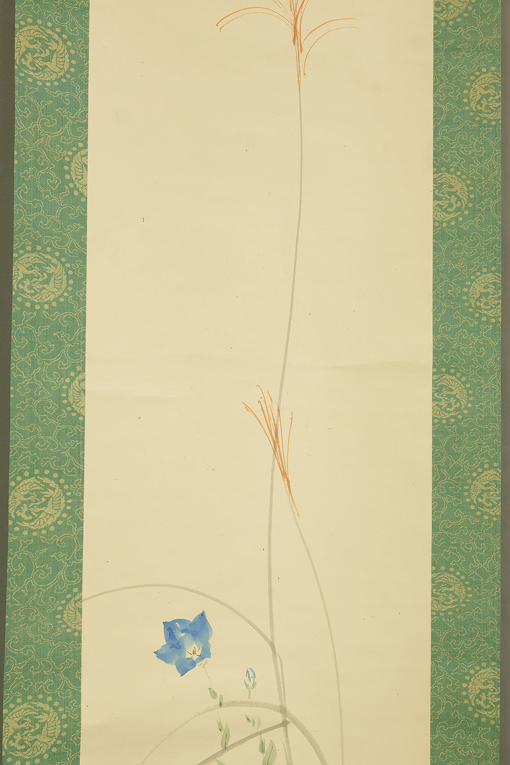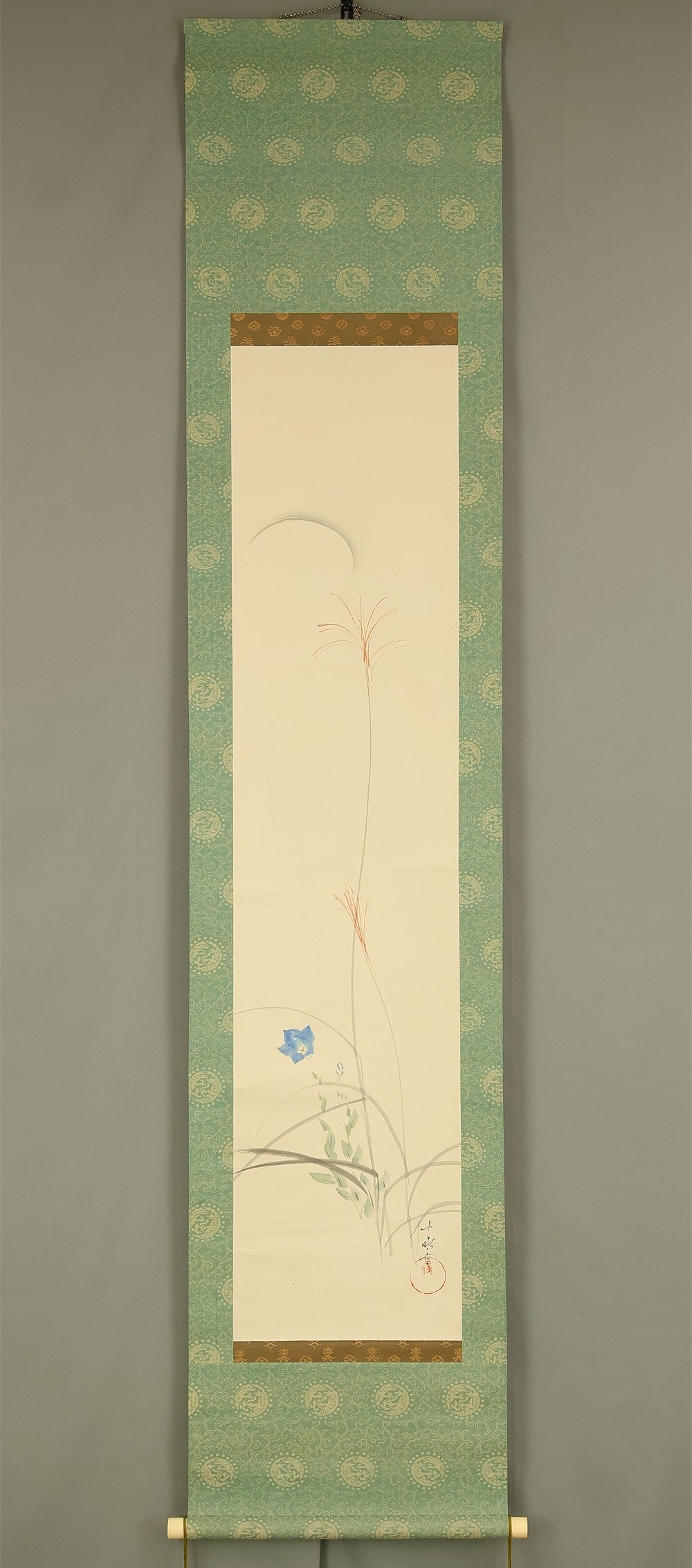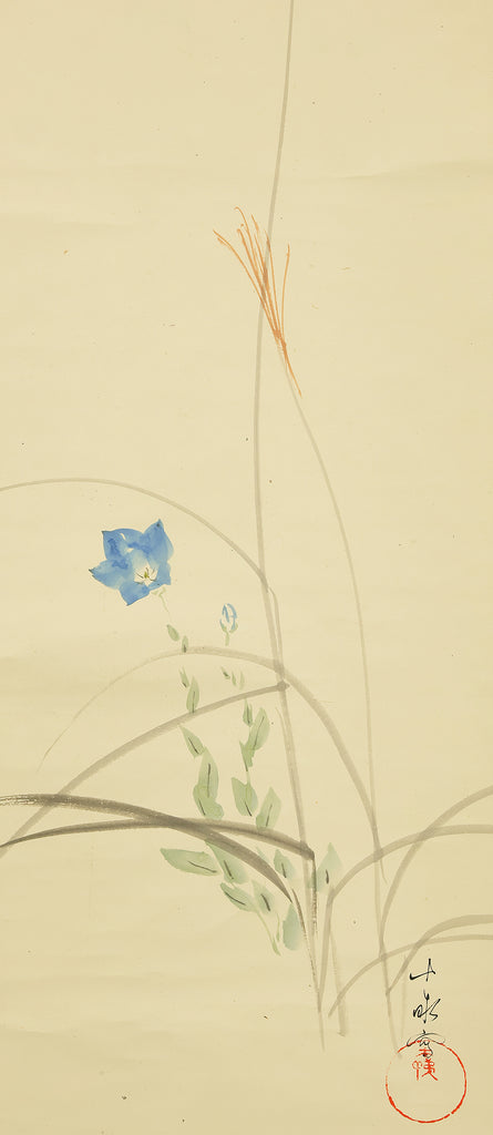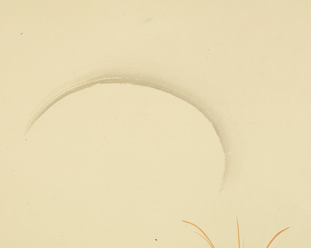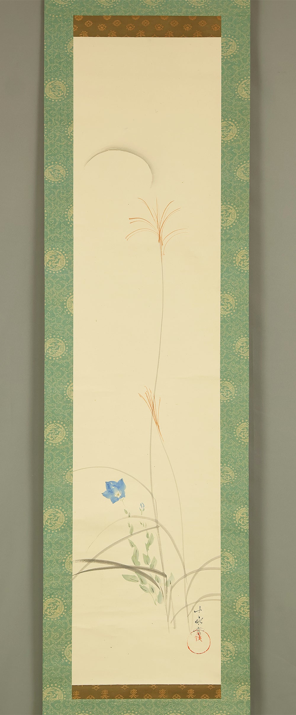This refined hanging scroll by Araki Jippo (1872–1944)—a leading painter of the Kyoto art world and a pivotal figure of the Shijō school—offers a serene and poetic vision of the Japanese autumn. With effortless brushwork and exquisite restraint, Jippo depicts a delicate spray of autumn grasses, a single blue bellflower, and a gracefully arching crescent moon, creating a composition that is both spacious and deeply atmospheric. Jippo’s characteristic elegance is fully present here: the extremely fine ink lines, the soft modulation of color, and the generous negative space evoke the quiet beauty of early autumn nights. The scene embodies the classical Japanese aesthetic of wabi-sabi—a sense of tranquility, seasonality, and refined simplicity. The scroll is accompanied by its original signed tomobako (wooden storage box), bearing the artist’s inscription and seal. This enhances both the artwork's authenticity and its value for collectors. A graceful and contemplative work that brings the poetry of the Japanese seasons into any interior.