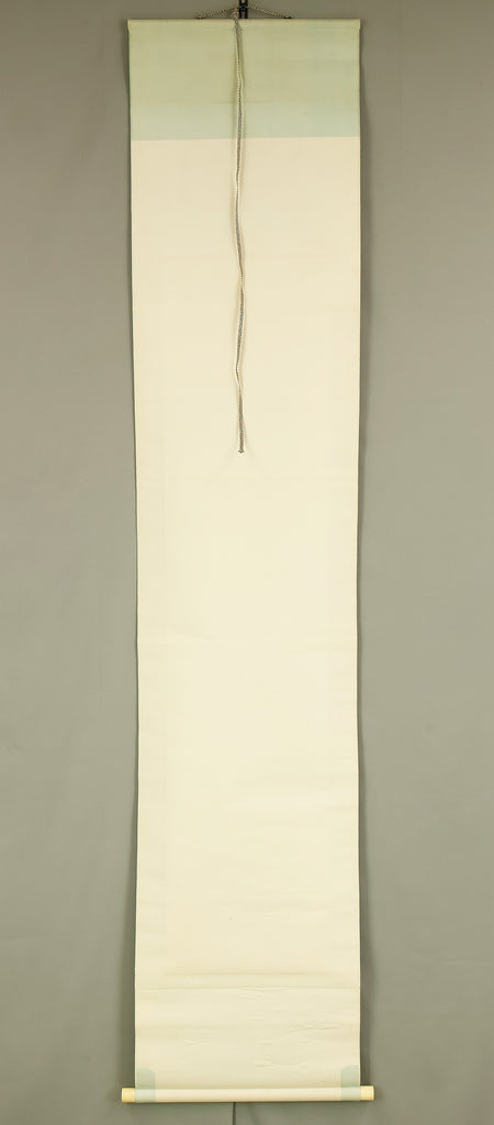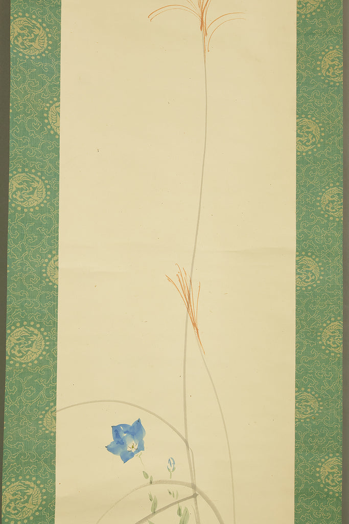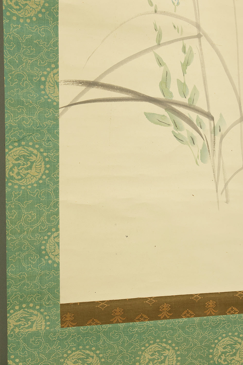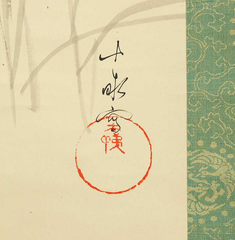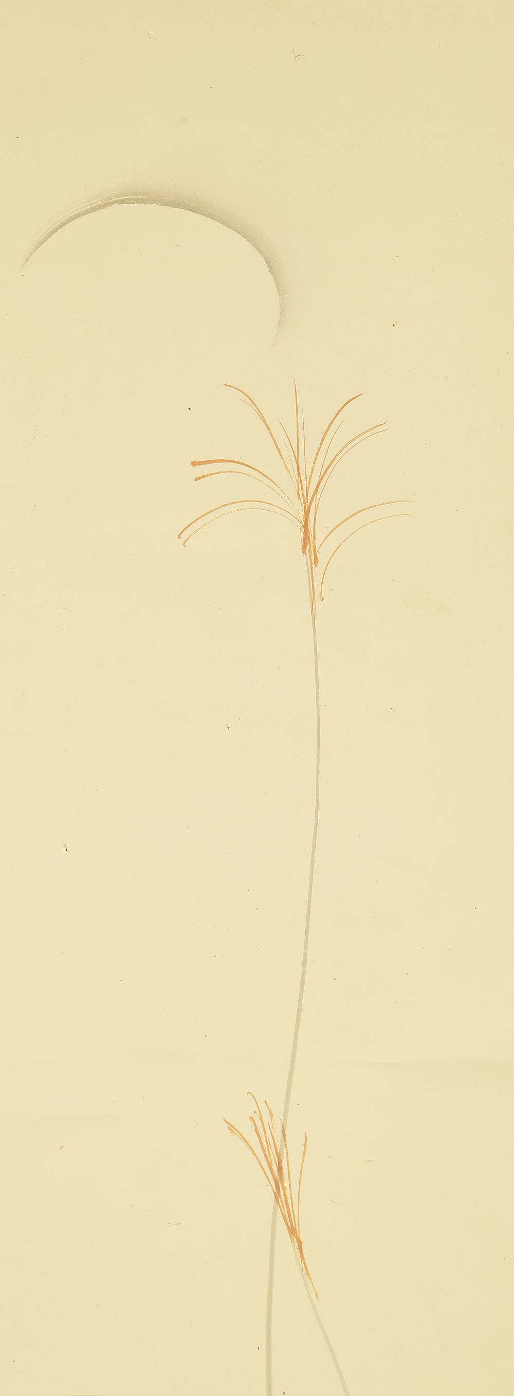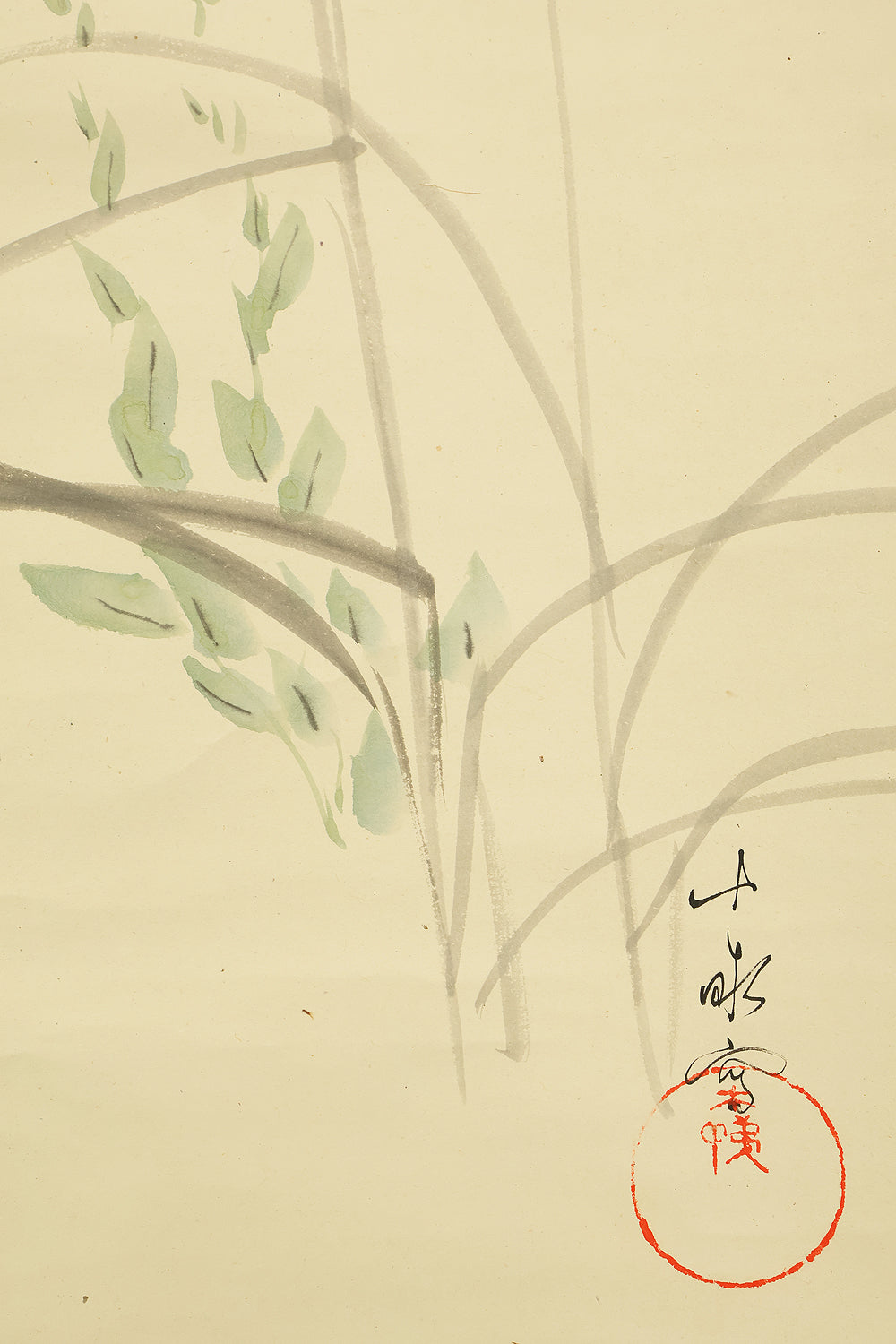 This refined hanging scroll by Araki Jippo (1872–1944)—a leading painter of the Kyoto art world and a pivotal figure of the Shijō school—offers a serene and poetic vision of the Japanese autumn. With effortless brushwork and exquisite restraint, Jippo depicts a delicate spray of autumn grasses, a single blue bellflower, and a gracefully arching crescent moon, creating a composition that is both spacious and deeply atmospheric. Jippo’s characteristic elegance is fully present here: the extremely fine ink lines, the soft modulation of color, and the generous negative space evoke the quiet beauty of early autumn nights. The scene embodies the classical Japanese aesthetic of wabi-sabi—a sense of tranquility, seasonality, and refined simplicity. The scroll is accompanied by its original signed tomobako (wooden storage box), bearing the artist’s inscription and seal. This enhances both the artwork's authenticity and its value for collectors. A graceful and contemplative work that brings the poetry of the Japanese seasons into any interior.