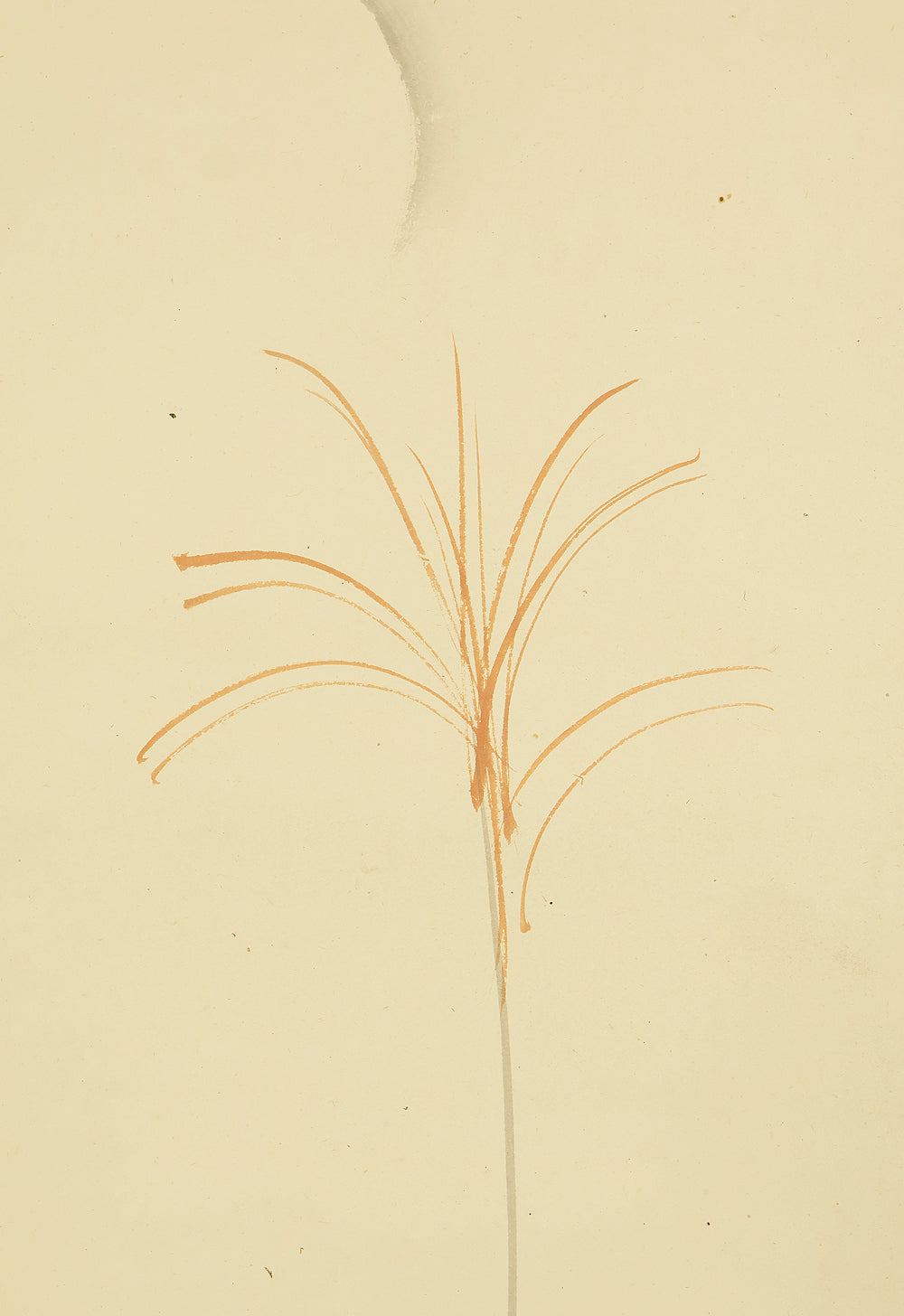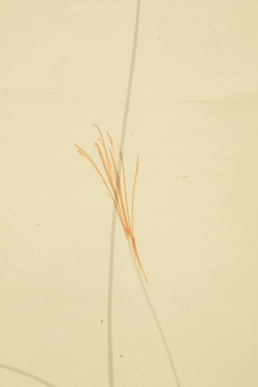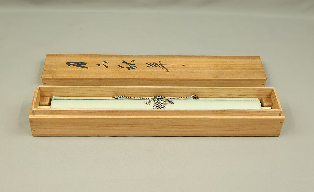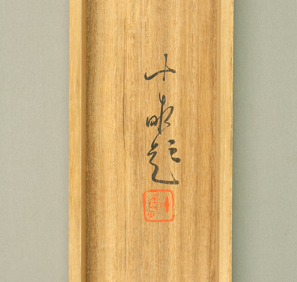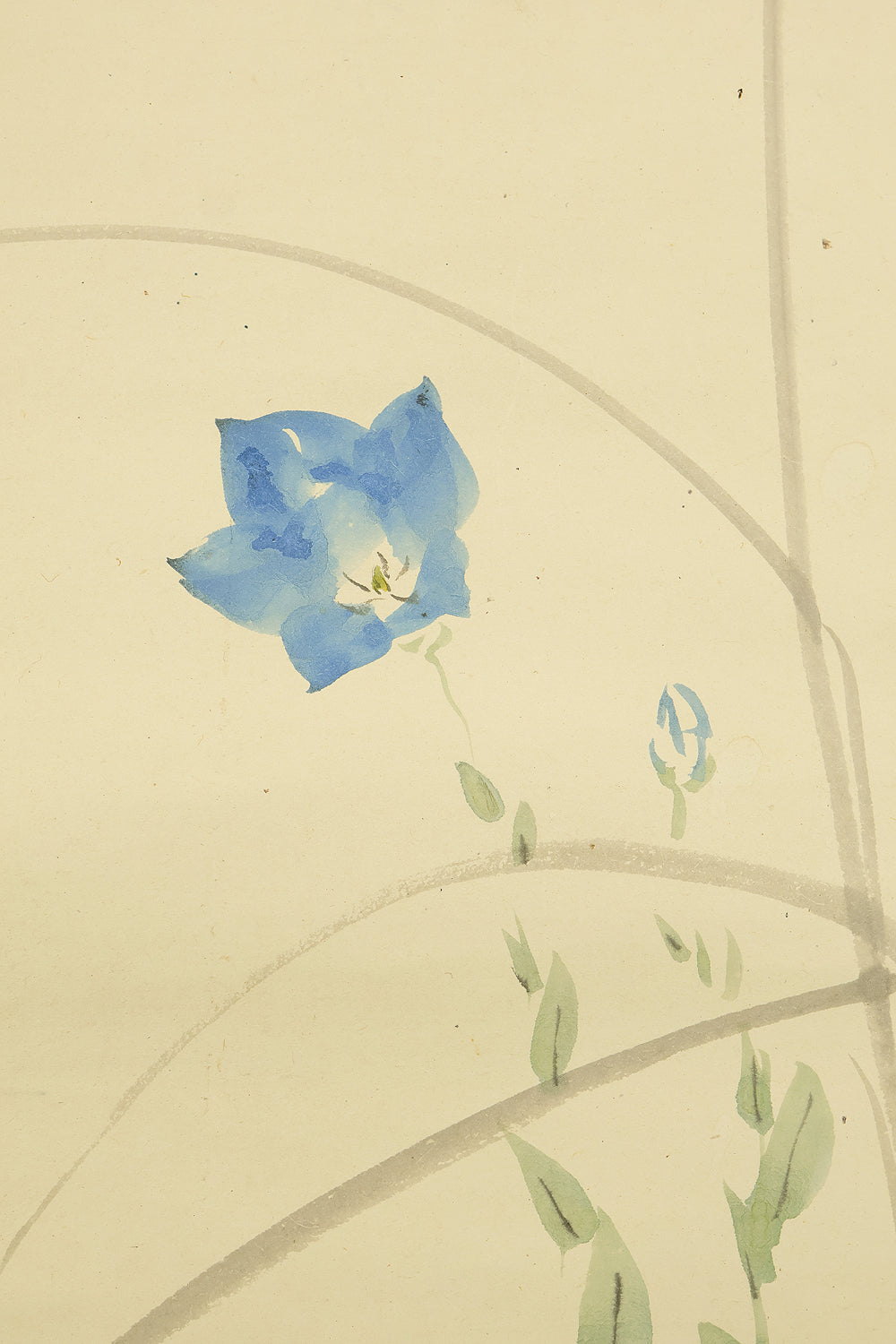 This refined hanging scroll by Araki Jippo (1872–1944)—a leading painter of the Kyoto art world and a pivotal figure of the Shijō school—offers a serene and poetic vision of the Japanese autumn. With effortless brushwork and exquisite restraint, Jippo depicts a delicate spray of autumn grasses, a single blue bellflower, and a gracefully arching crescent moon, creating a composition that is both spacious and deeply atmospheric. Jippo’s characteristic elegance is fully present here: the extremely fine ink lines, the soft modulation of color, and the generous negative space evoke the quiet beauty of early autumn nights. The scene embodies the classical Japanese aesthetic of wabi-sabi—a sense of tranquility, seasonality, and refined simplicity. The scroll is accompanied by its original signed tomobako (wooden storage box), bearing the artist’s inscription and seal. This enhances both the artwork's authenticity and its value for collectors. A graceful and contemplative work that brings the poetry of the Japanese seasons into any interior.