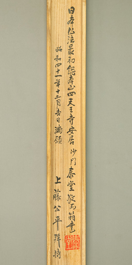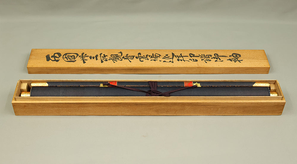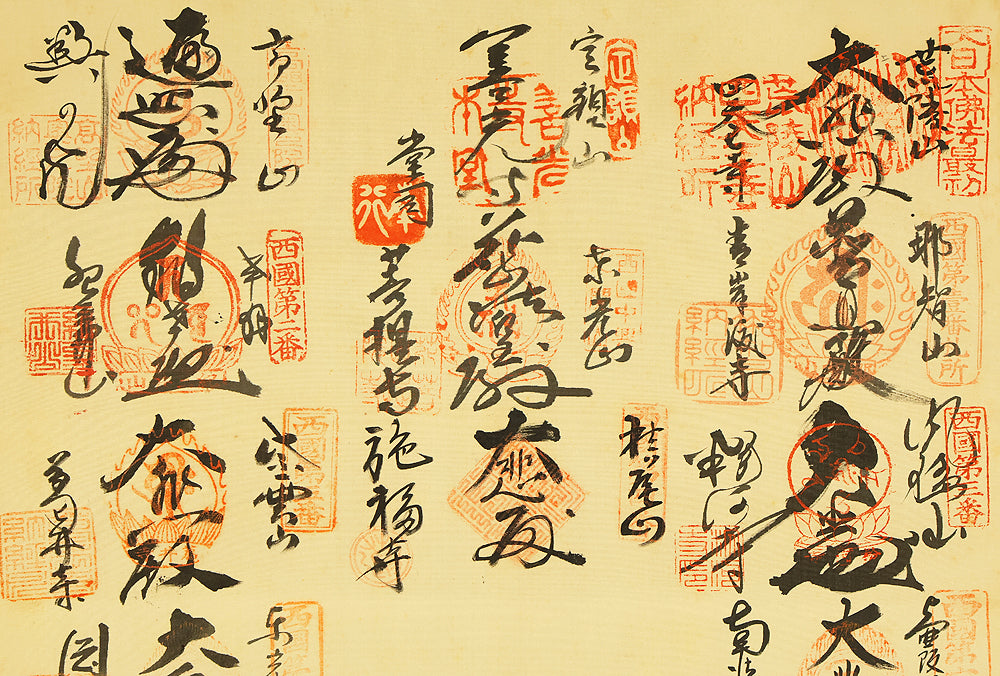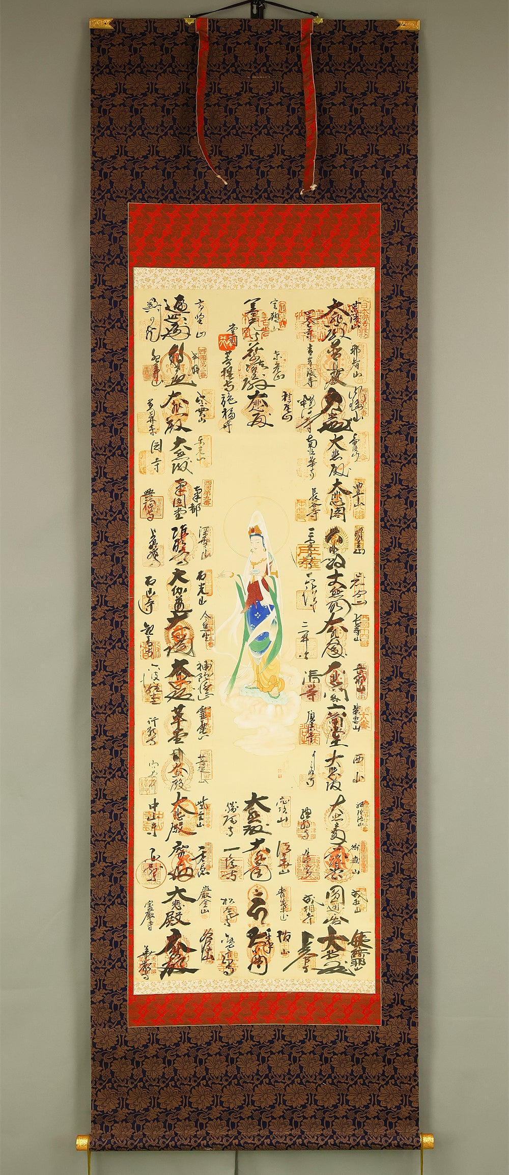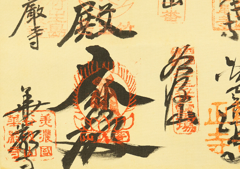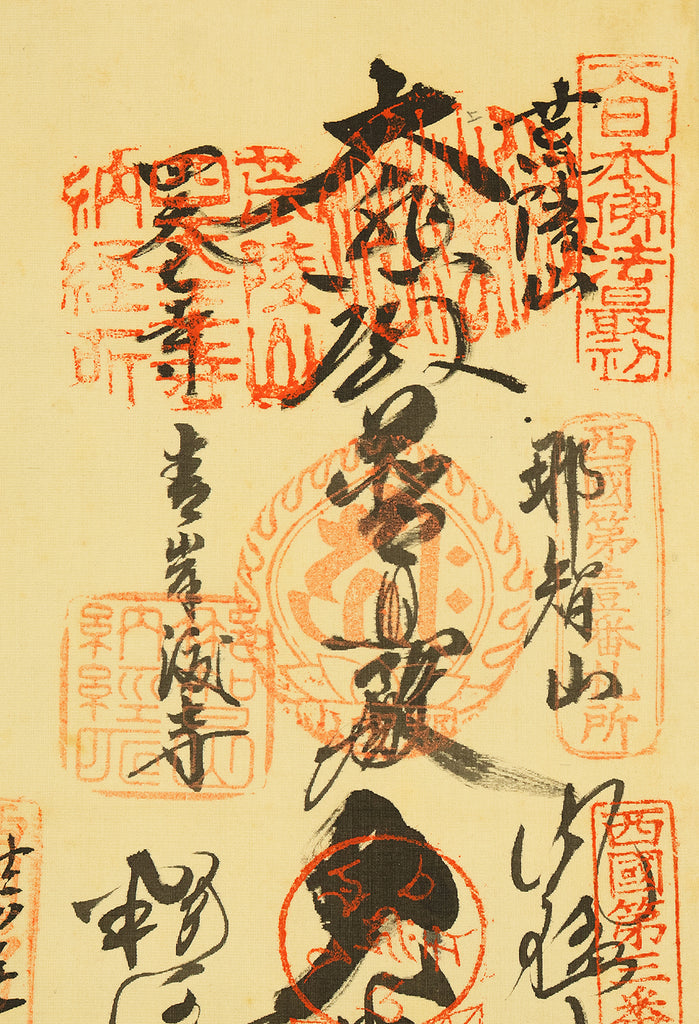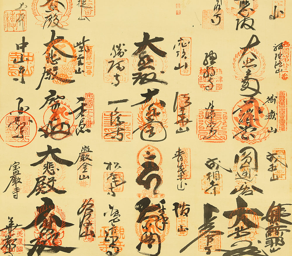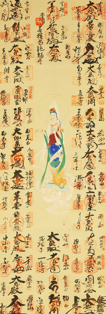 A meaningful Japanese hanging scroll commemorating the Saigoku Sanjūsankasho pilgrimage, which includes 33 temples dedicated to Kannon, the Bodhisattva of Compassion. This nōkyōjiku (納経軸) features inscriptions and seals from each temple, collected during the pilgrimage and arranged around a central image—often representing Kannon or a symbolic figure. The scroll documents a completed spiritual journey, with each temple’s calligraphy and stamp reflecting devotion and cultural heritage. The included wooden box bears a date of Showa 41 (1966), marking the year of completion and mounting. In Japanese tradition, the Saigoku pilgrimage is a revered act of merit, often undertaken for healing, protection, or ancestral honor. This scroll serves as both a devotional artifact and a historical record of faith.