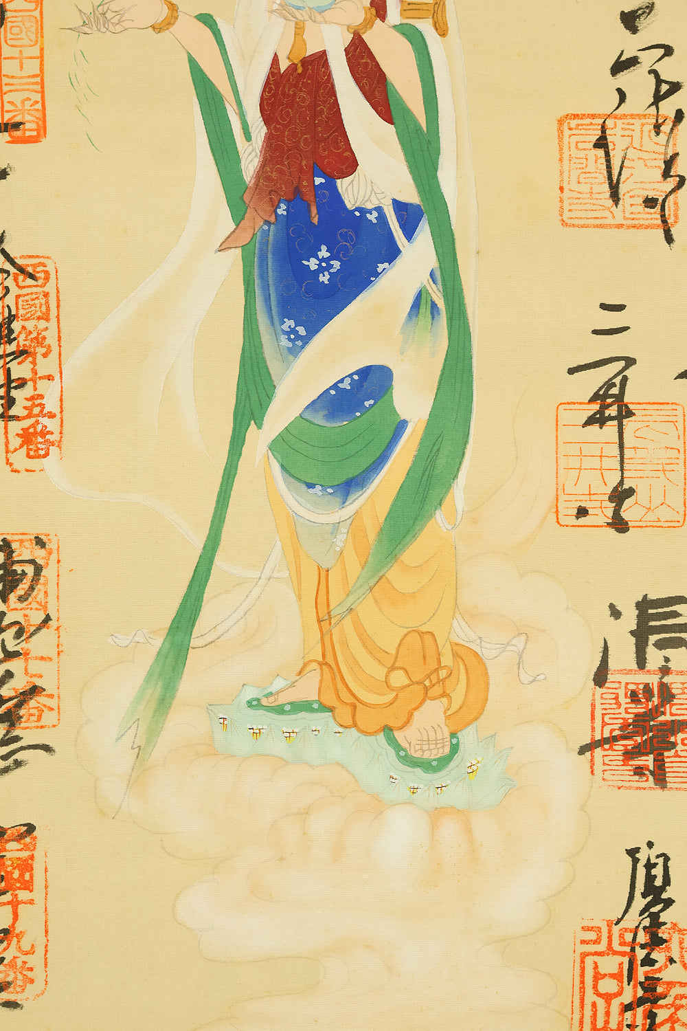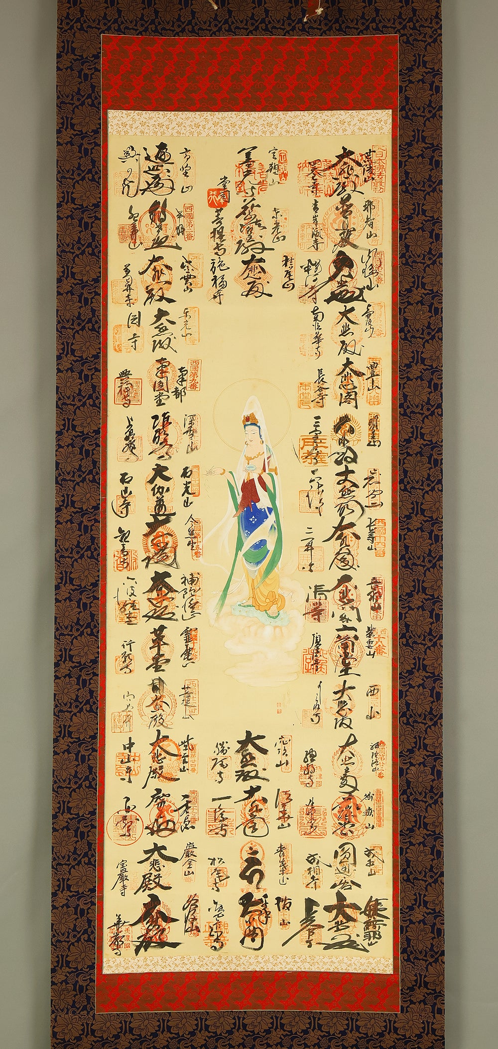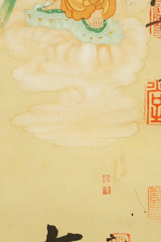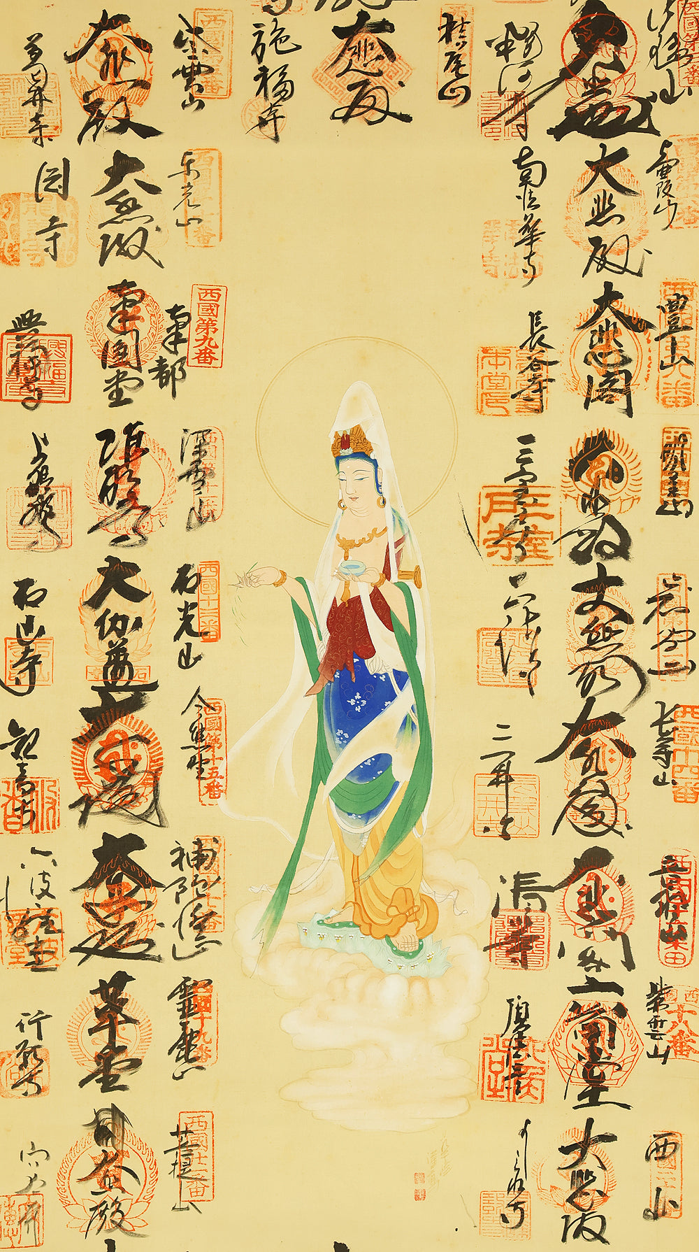 西国三十三所 Saigoku sanjūsanjo (33 pilgrimage places in the West) - Saigoku Kannon Pilgrimage 雲上聖観音 Unjoshokannon (Avalokitesvara Bodhisattva standing on a cloud) with Original Box (Tomobako) / Japanese Buddhism art kakejiku kakemono wall hanging scroll RD894