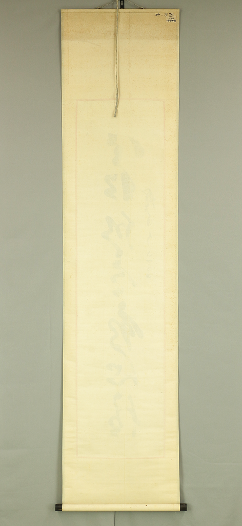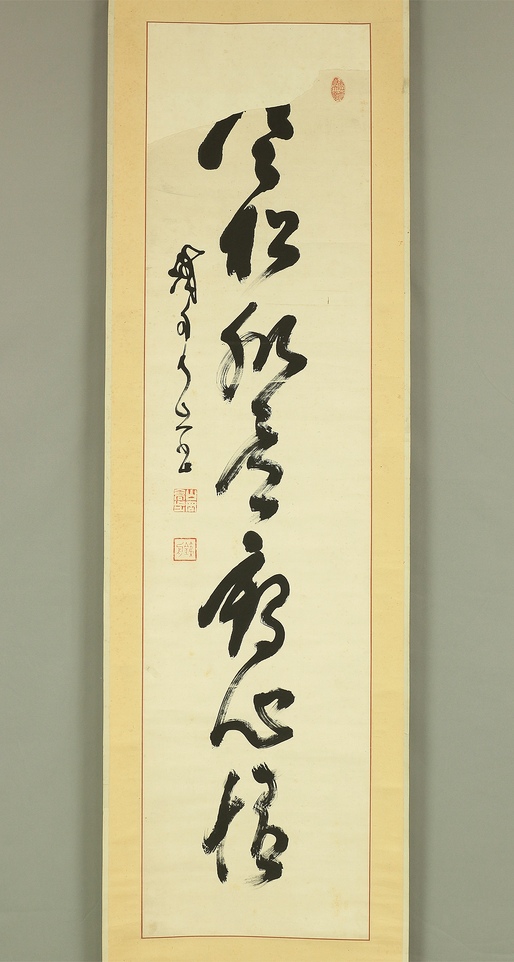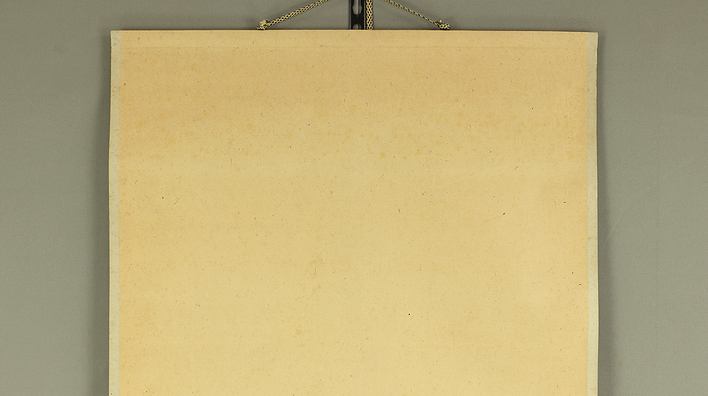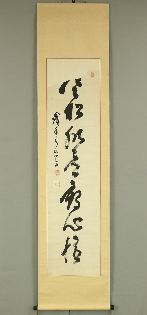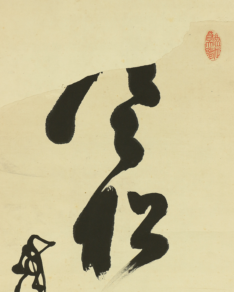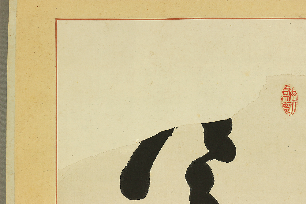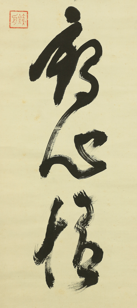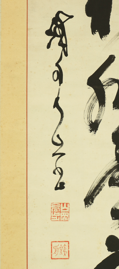 This hanging scroll presents a powerful one-line calligraphy reading 寒松肌骨鶴心情, a phrase expressing the ideal of an unyielding body like a pine standing firm through winter, and a spirit as pure, elevated, and noble as a crane. Executed with bold, dynamic brushwork, the calligraphy conveys a sense of inner discipline, moral strength, and quiet dignity, qualities closely associated with Zen and the samurai ethos. The strokes show confidence and immediacy, allowing the viewer to feel the artist’s state of mind at the moment of writing. The work bears the signature “Tesshū” and accompanying seals, and is attributed to Yamaoka Tesshū (1836–1888), a renowned samurai-calligrapher of the late Edo period. Please note that the area corresponding to the first character at the top of the composition is missing; this loss is clearly visible and should be regarded as part of the work’s present condition, though the remaining calligraphy retains strong presence and continues to powerfully convey the meaning and spirit of the original inscription.