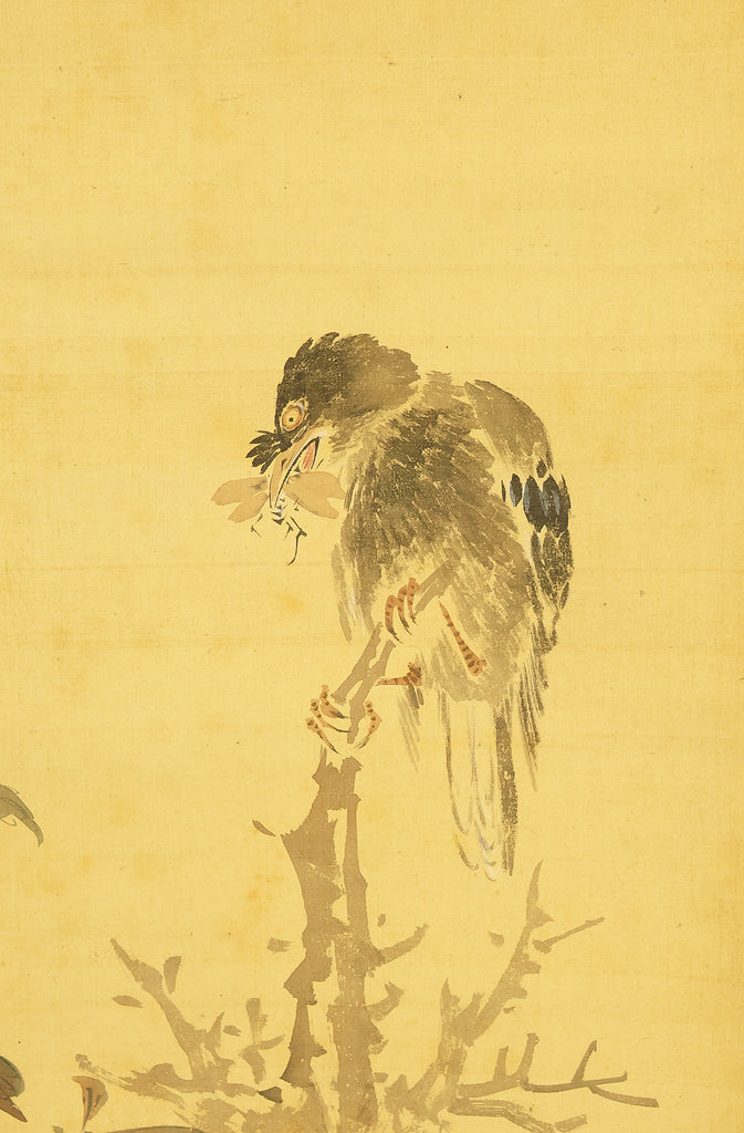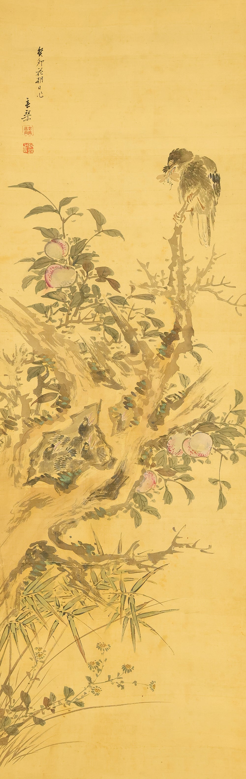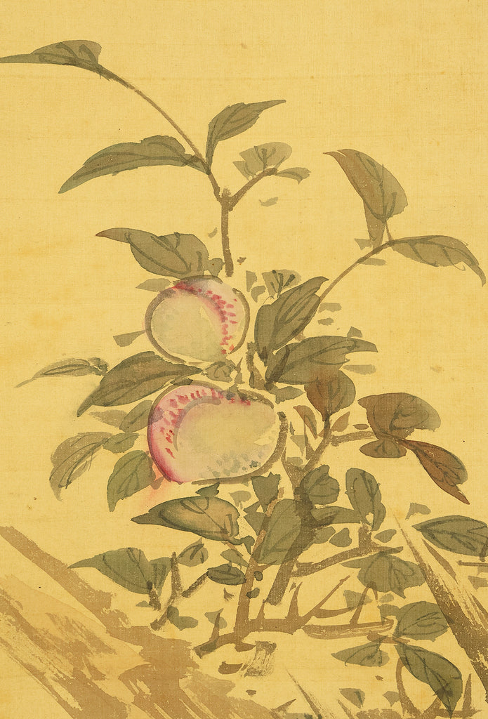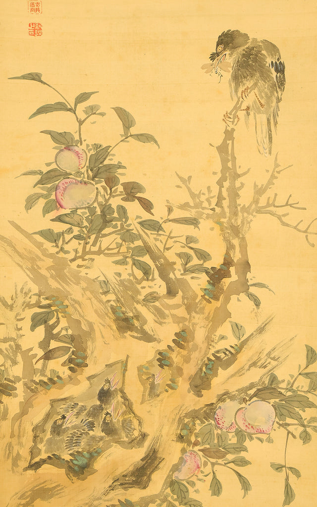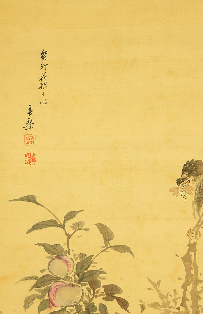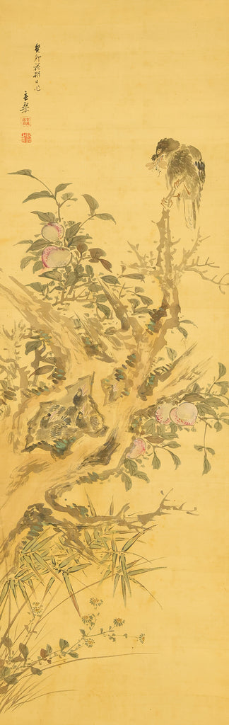 This elegant hanging scroll presents a quietly animated spring scene in which a gnarled peach tree, heavy with softly blushing fruit, becomes a living stage for mountain birds nurturing their young, the composition unfolding with gentle rhythm from trunk to branches and into the surrounding grasses, revealing Uragami Shunkin’s refined sensitivity to life cycles and seasonal vitality; executed with supple brushwork and restrained color, the painting balances intimacy and openness, allowing the viewer to sense both the protective stillness of the parent birds and the latent energy of growth embodied by the peach tree, a motif long associated with renewal and abundance in East Asian culture; Shunkin’s literati background is evident in the clarity of line and unforced elegance of the scene, where narrative suggestion is favored over overt drama, and the empty spaces breathe as meaningfully as the painted forms; bearing the artist’s signature and seals, this work reflects the aesthetic that made Shunkin highly esteemed in his own time, offering a contemplative yet warm vision of nature that rewards prolonged viewing and quietly asserts its place within the refined tradition of late Edo flower-and-bird painting.