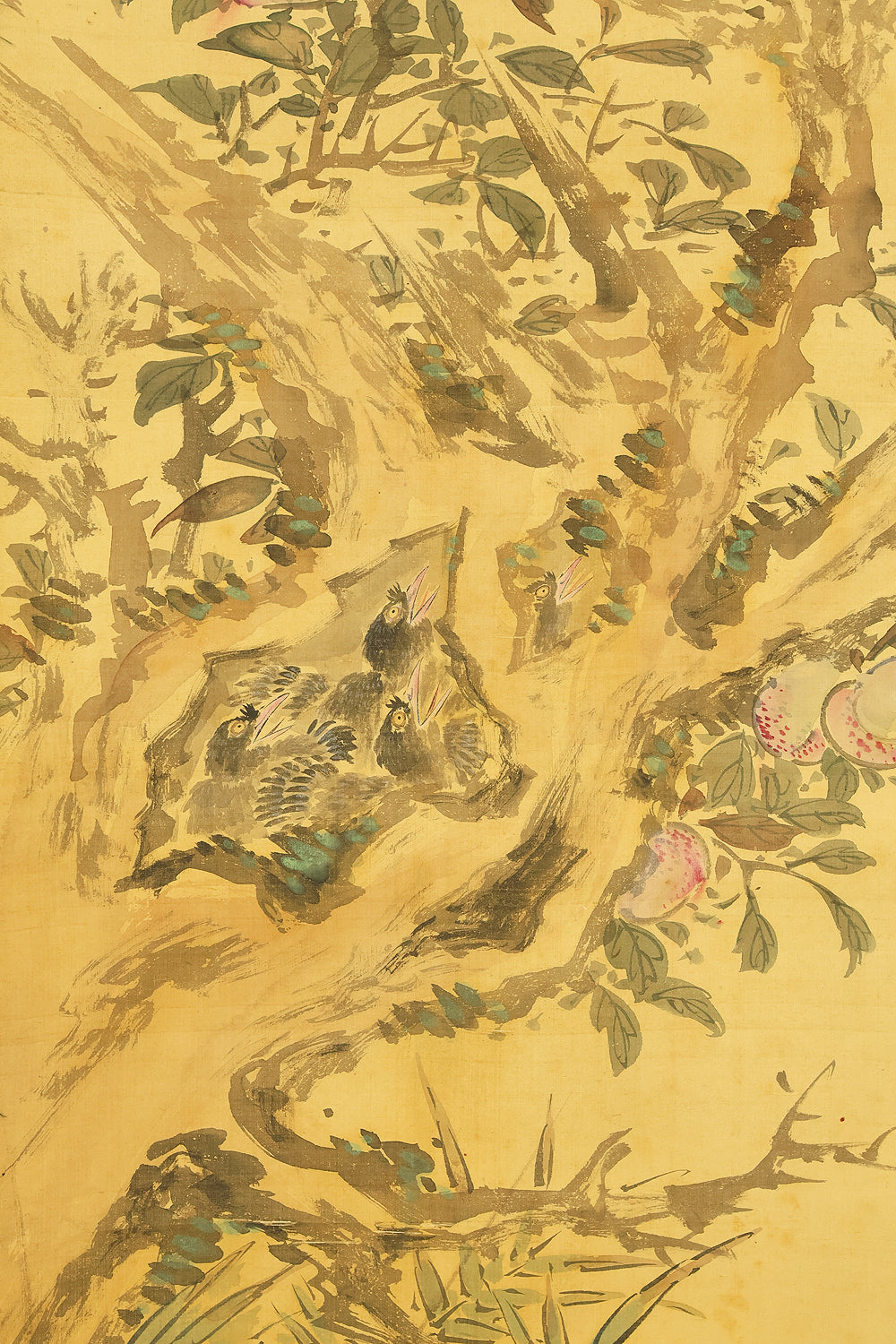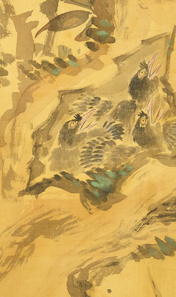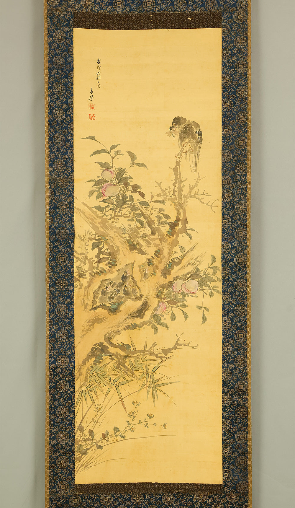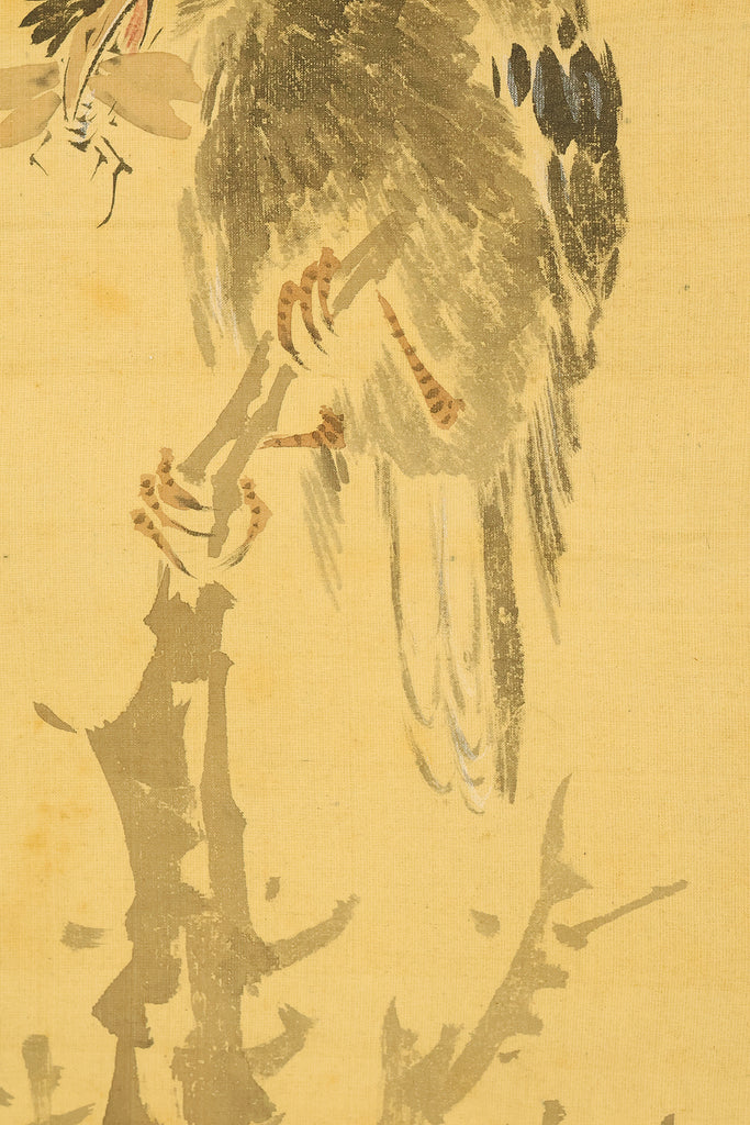 This elegant hanging scroll presents a quietly animated spring scene in which a gnarled peach tree, heavy with softly blushing fruit, becomes a living stage for mountain birds nurturing their young, the composition unfolding with gentle rhythm from trunk to branches and into the surrounding grasses, revealing Uragami Shunkin’s refined sensitivity to life cycles and seasonal vitality; executed with supple brushwork and restrained color, the painting balances intimacy and openness, allowing the viewer to sense both the protective stillness of the parent birds and the latent energy of growth embodied by the peach tree, a motif long associated with renewal and abundance in East Asian culture; Shunkin’s literati background is evident in the clarity of line and unforced elegance of the scene, where narrative suggestion is favored over overt drama, and the empty spaces breathe as meaningfully as the painted forms; bearing the artist’s signature and seals, this work reflects the aesthetic that made Shunkin highly esteemed in his own time, offering a contemplative yet warm vision of nature that rewards prolonged viewing and quietly asserts its place within the refined tradition of late Edo flower-and-bird painting.