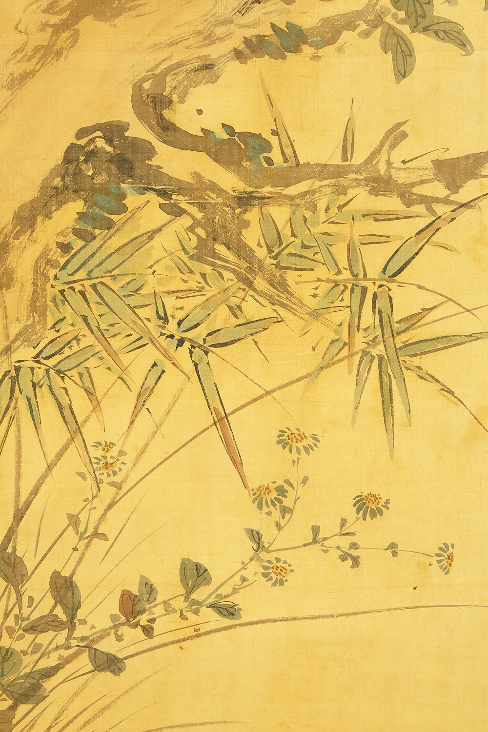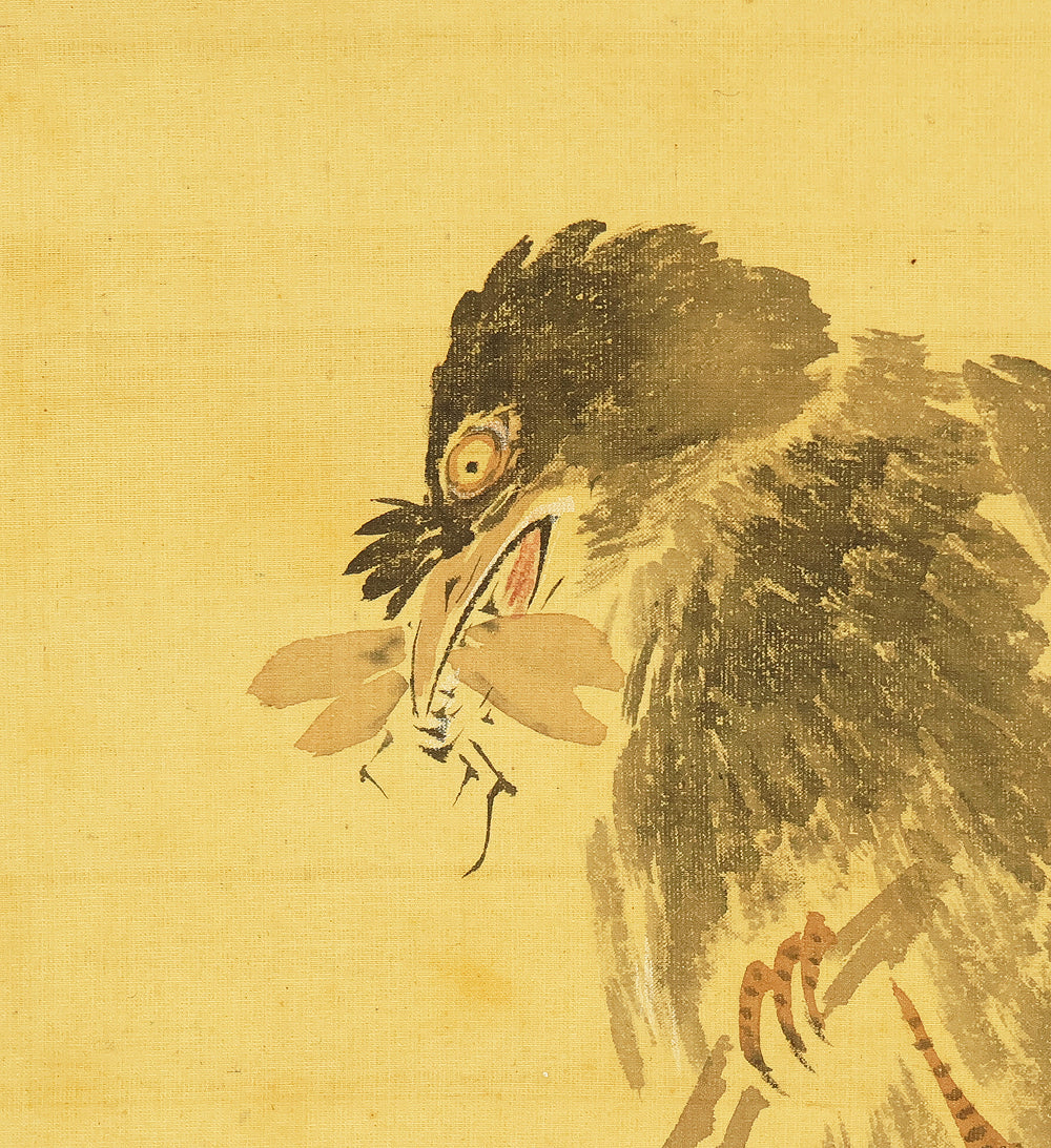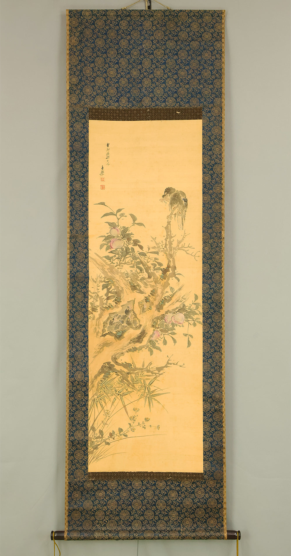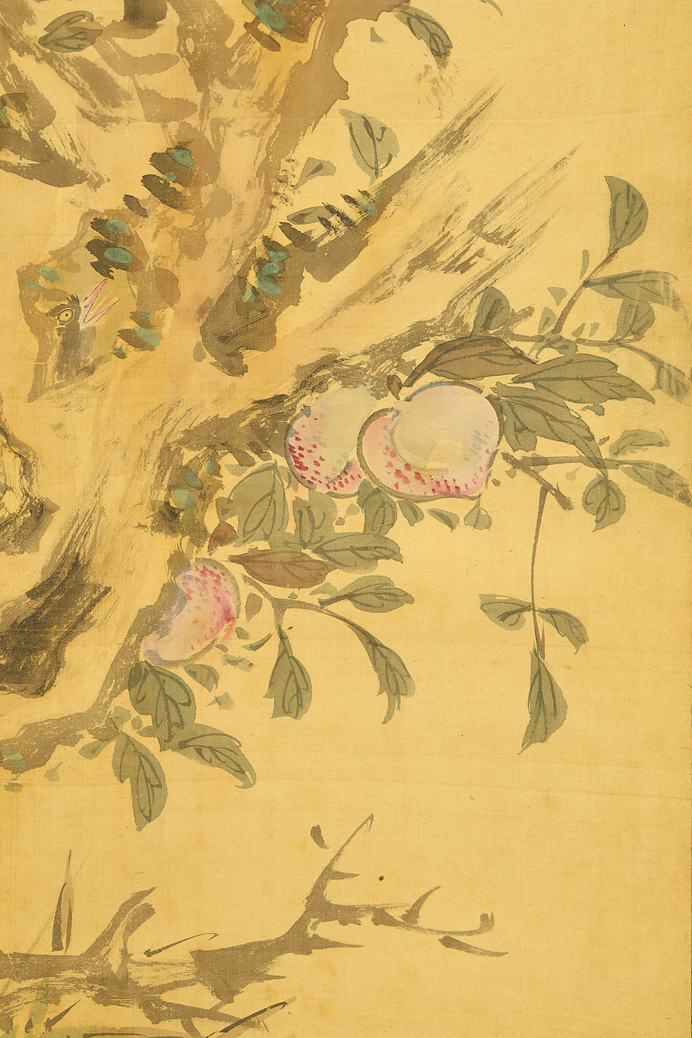 This elegant hanging scroll presents a quietly animated spring scene in which a gnarled peach tree, heavy with softly blushing fruit, becomes a living stage for mountain birds nurturing their young, the composition unfolding with gentle rhythm from trunk to branches and into the surrounding grasses, revealing Uragami Shunkin’s refined sensitivity to life cycles and seasonal vitality; executed with supple brushwork and restrained color, the painting balances intimacy and openness, allowing the viewer to sense both the protective stillness of the parent birds and the latent energy of growth embodied by the peach tree, a motif long associated with renewal and abundance in East Asian culture; Shunkin’s literati background is evident in the clarity of line and unforced elegance of the scene, where narrative suggestion is favored over overt drama, and the empty spaces breathe as meaningfully as the painted forms; bearing the artist’s signature and seals, this work reflects the aesthetic that made Shunkin highly esteemed in his own time, offering a contemplative yet warm vision of nature that rewards prolonged viewing and quietly asserts its place within the refined tradition of late Edo flower-and-bird painting.