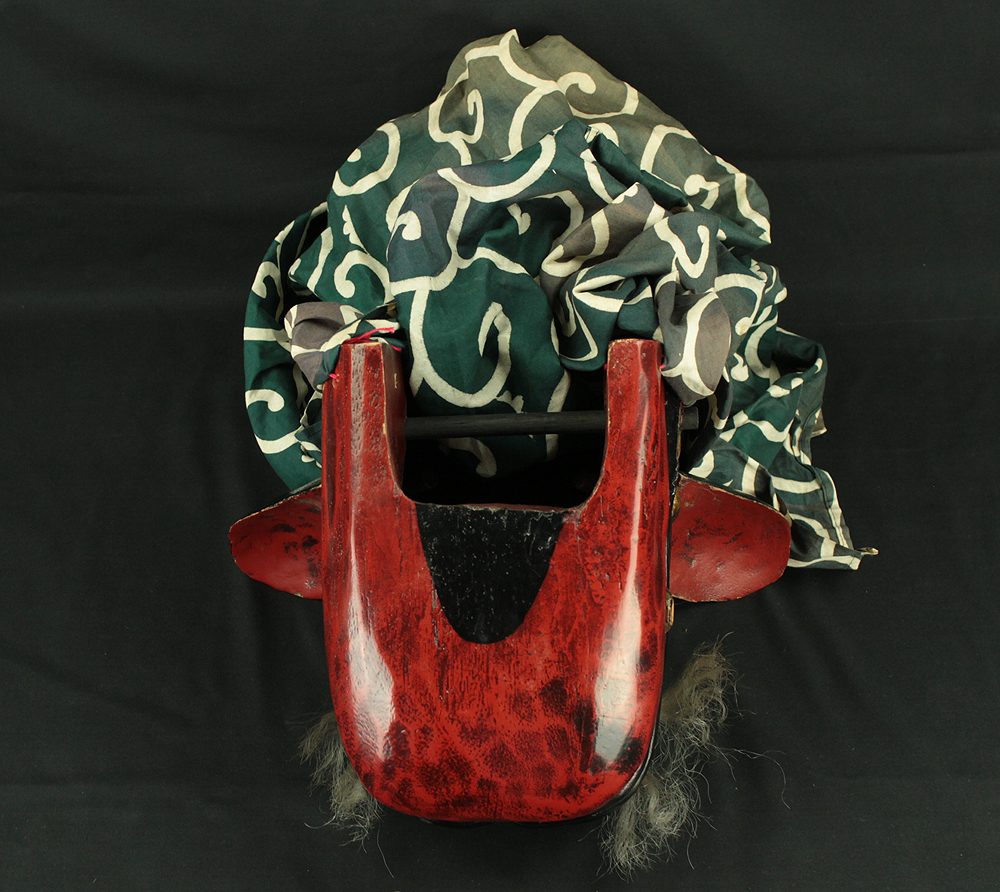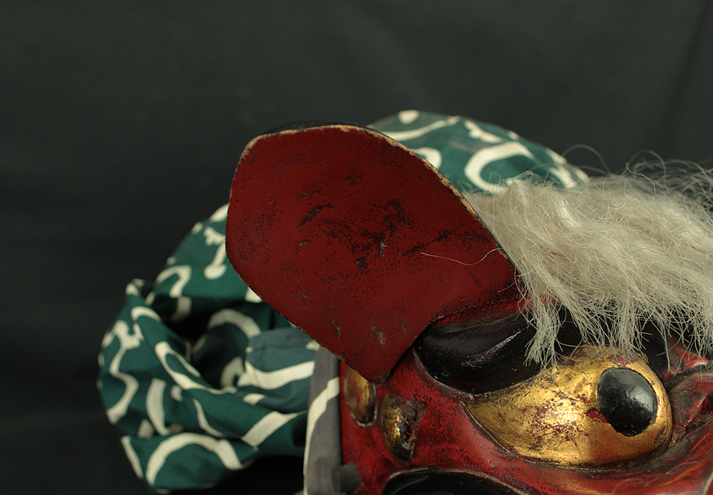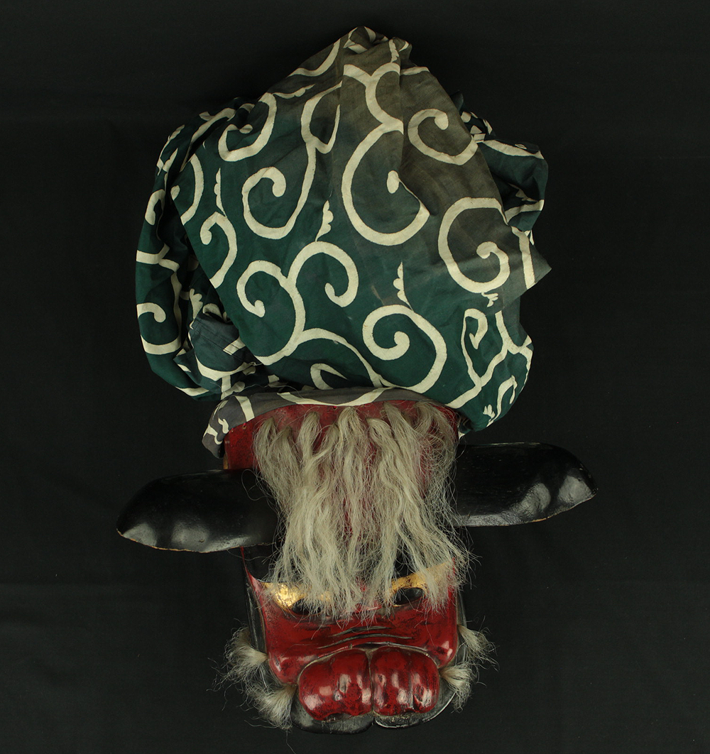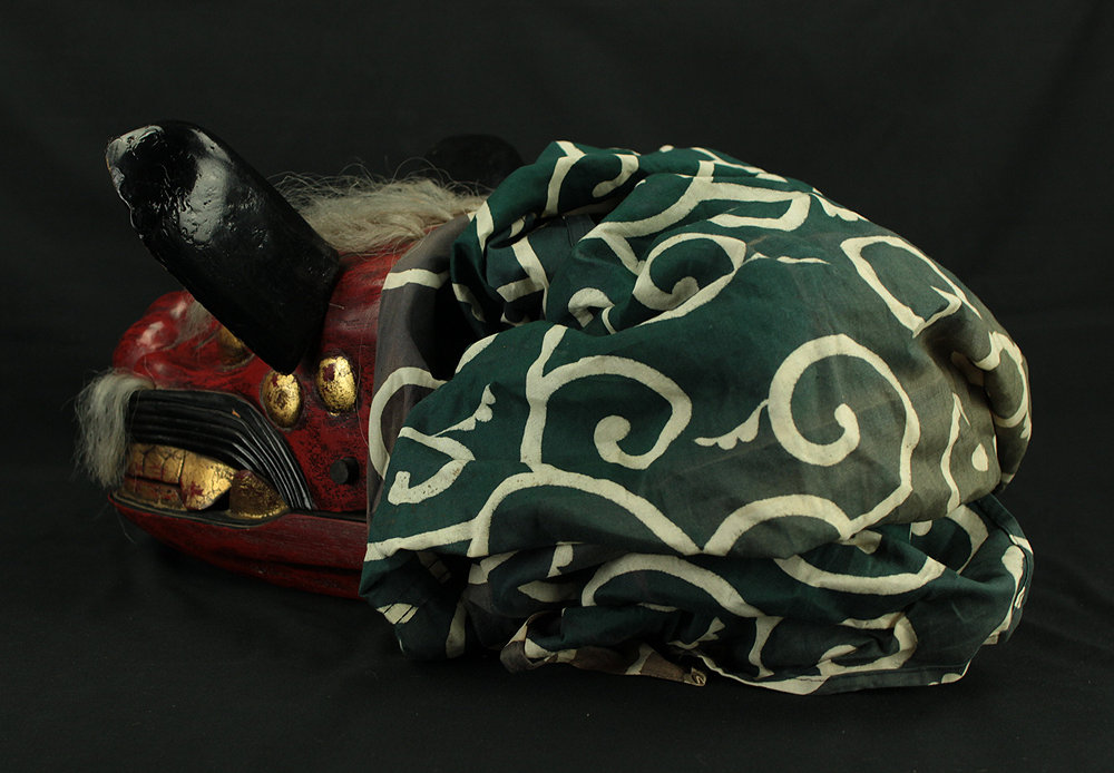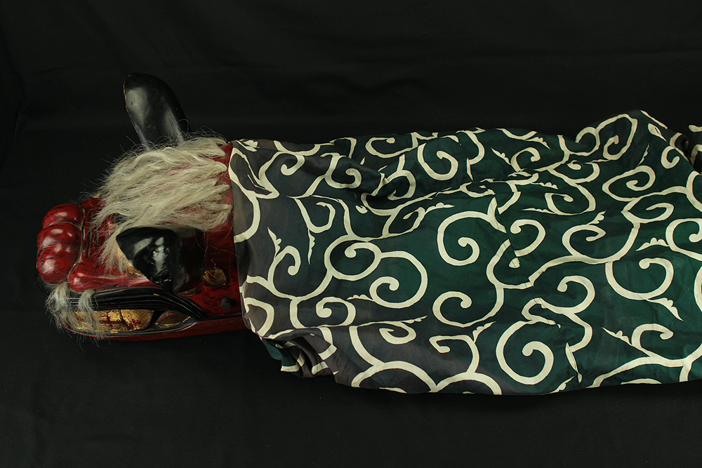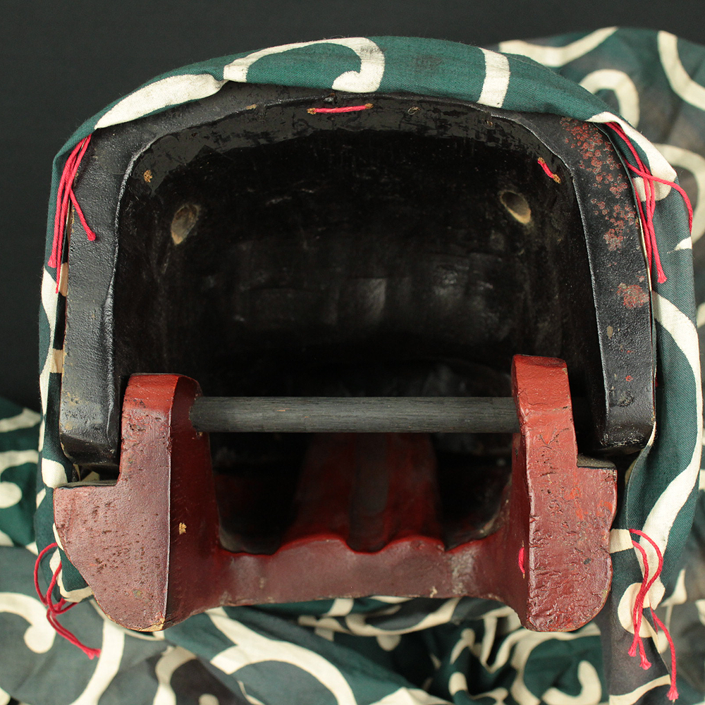 This vibrant Japanese lion dance mask (shishi-gashira) is crafted in the traditional style used for Shishimai, a ritual dance performed during festivals and New Year celebrations to ward off evil and invite good fortune. The mask features a bold red face with gold accents, expressive features, and a green cloth with white swirl patterns, representing the lion’s body. In Japanese folklore, the lion is a sacred creature that devours malevolent spirits. The act of being “bitten” by the lion is believed to bring health, protection, and prosperity, especially for children. The green cloth symbolizes vital energy and purification, enhancing the theatrical movement of the dance. This piece is ideal for collectors of Japanese folk art, festival artifacts, or theatrical masks, and can be displayed as a cultural centerpiece or used in ceremonial reenactments.