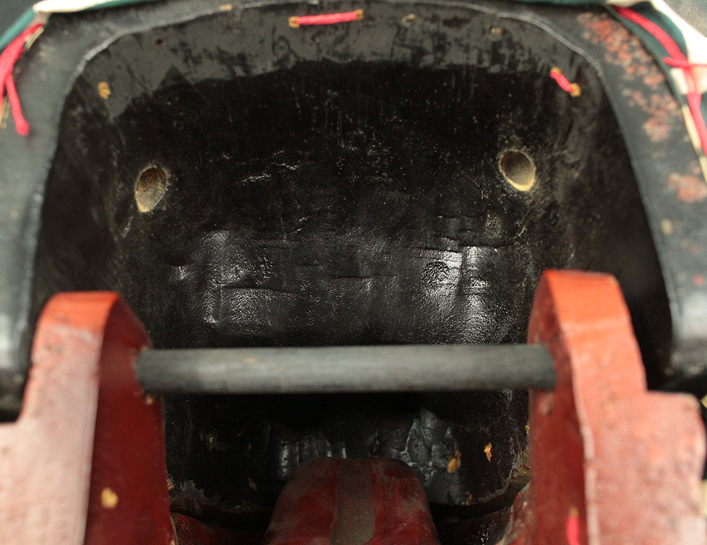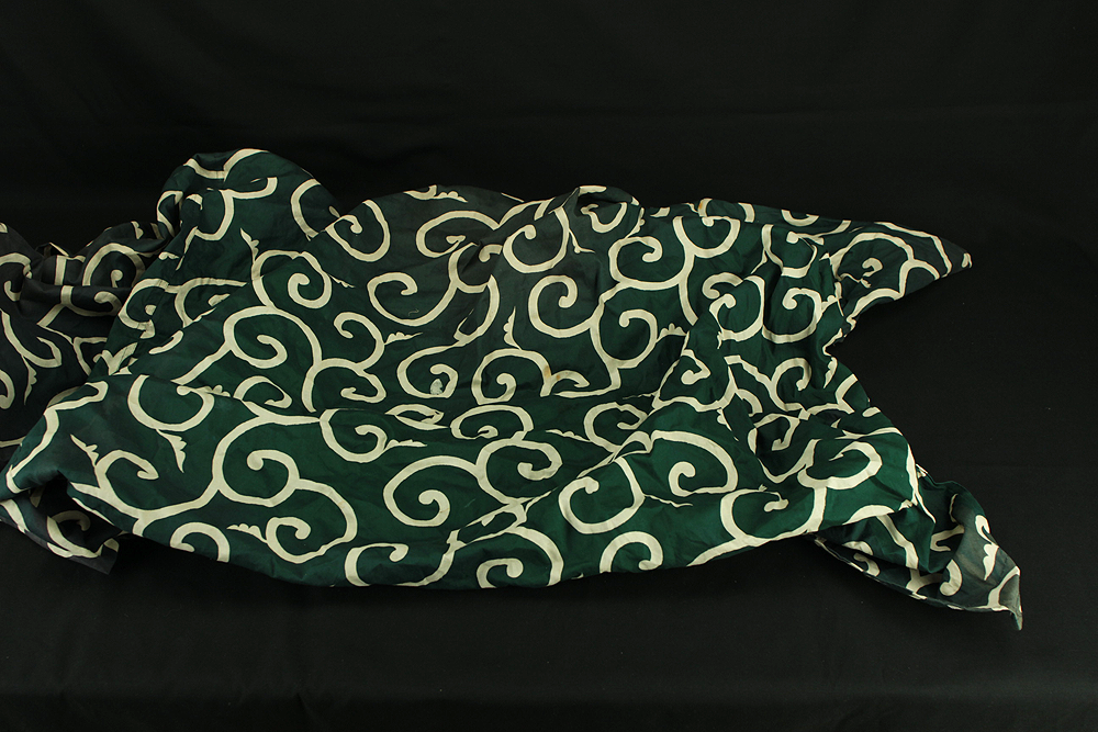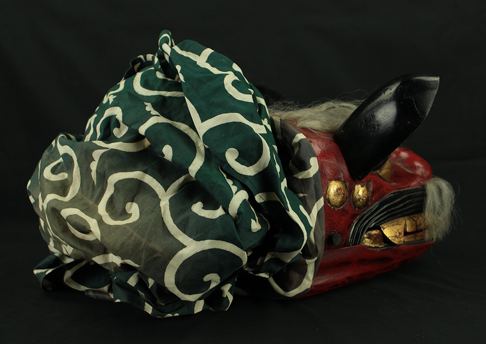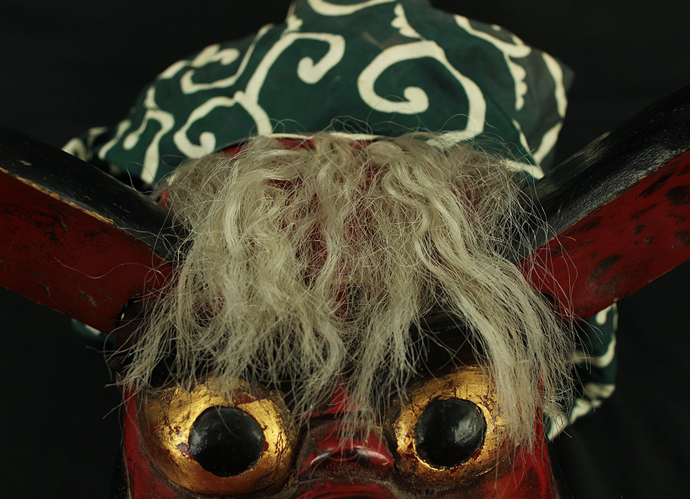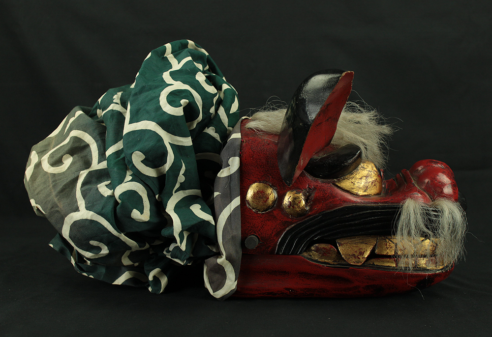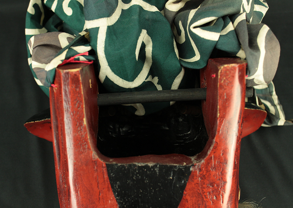 This vibrant Japanese lion dance mask (shishi-gashira) is crafted in the traditional style used for Shishimai, a ritual dance performed during festivals and New Year celebrations to ward off evil and invite good fortune. The mask features a bold red face with gold accents, expressive features, and a green cloth with white swirl patterns, representing the lion’s body. In Japanese folklore, the lion is a sacred creature that devours malevolent spirits. The act of being “bitten” by the lion is believed to bring health, protection, and prosperity, especially for children. The green cloth symbolizes vital energy and purification, enhancing the theatrical movement of the dance. This piece is ideal for collectors of Japanese folk art, festival artifacts, or theatrical masks, and can be displayed as a cultural centerpiece or used in ceremonial reenactments.
