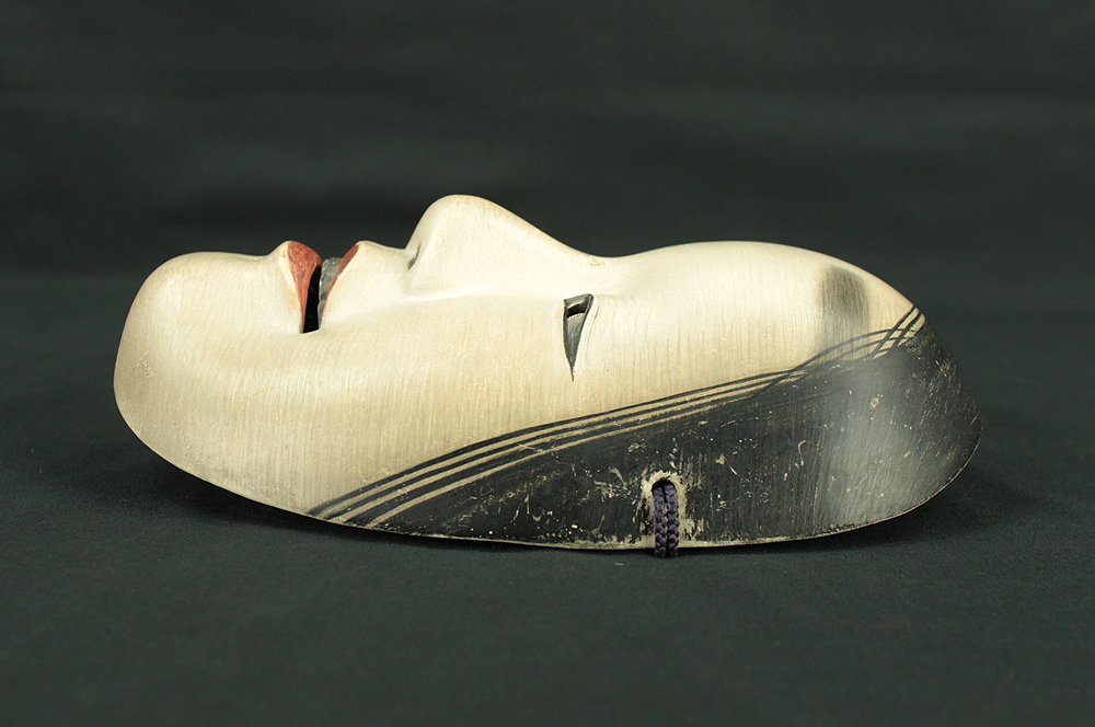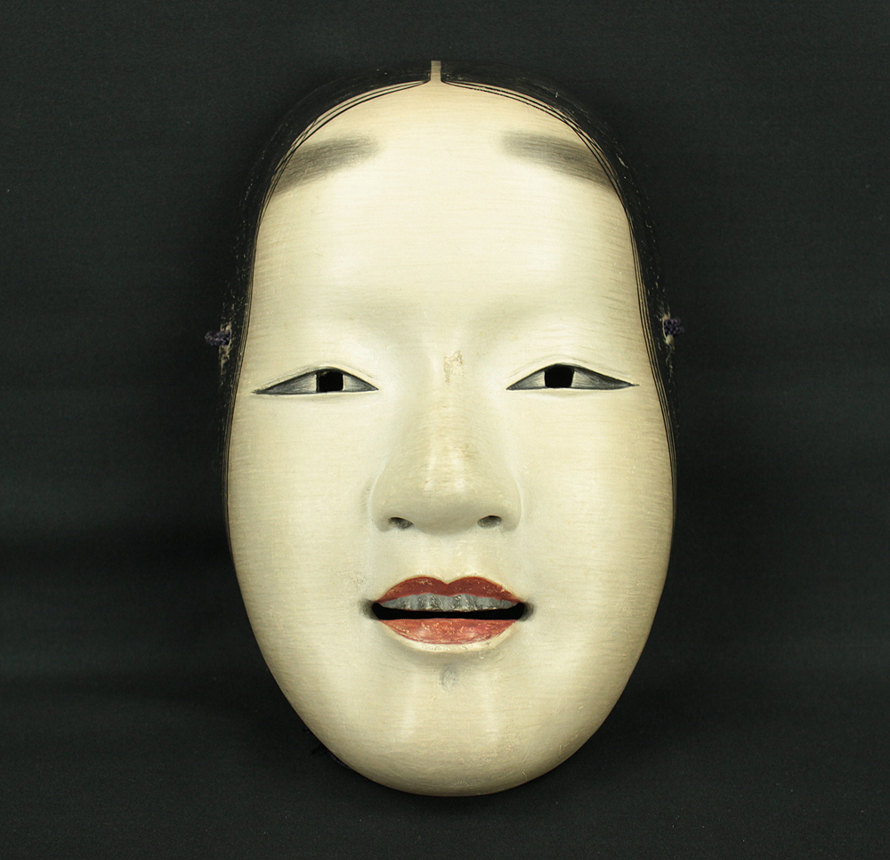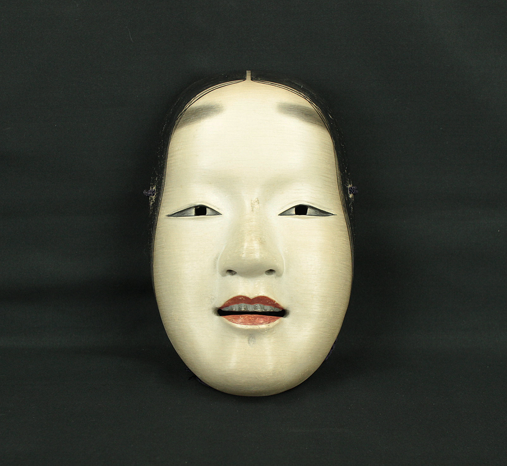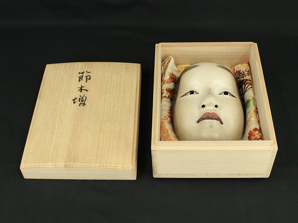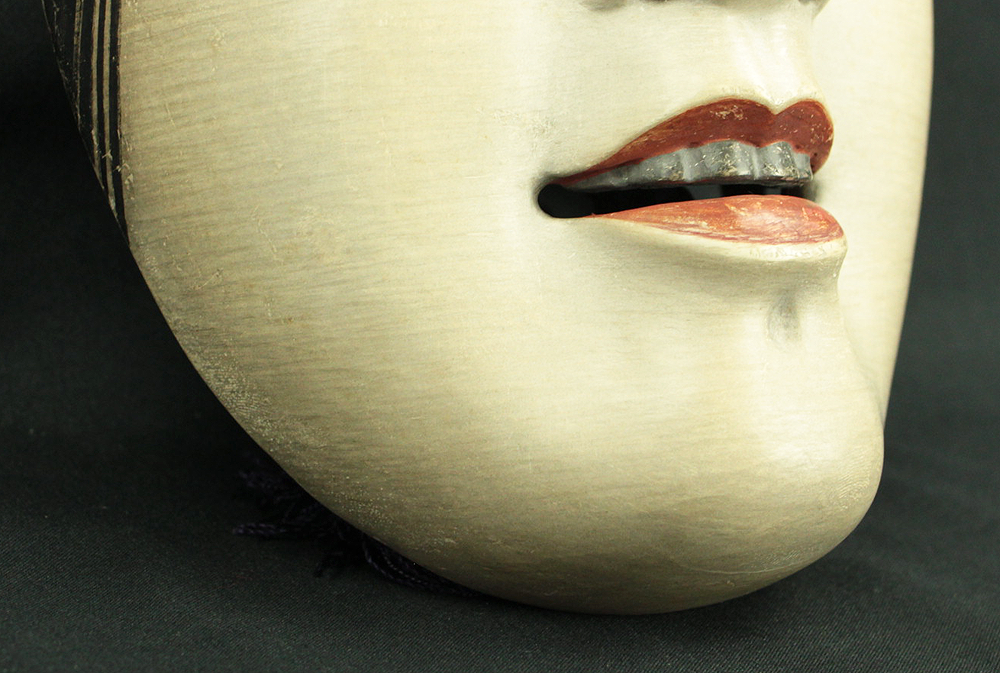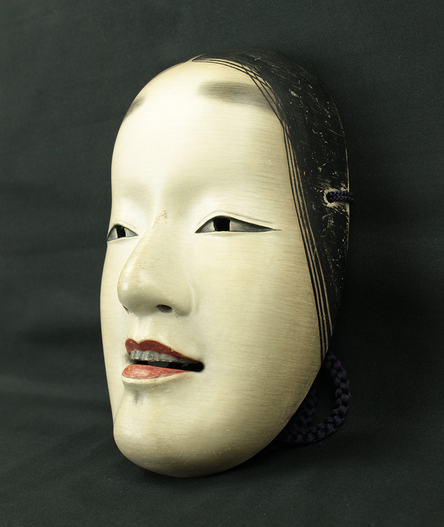A mask said to have been created by Zoami - 増阿弥 (Muromachi Jidai) of the Hōshō-ryū school. Made from knotty camphor wood, it bears resin stains near the inner corners of the eyes along the bridge of the nose. Hence its name, meaning “Zoonna of the knotty tree”. Used in Noh plays such as “Eguchi” and “Kumano”.