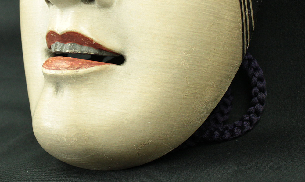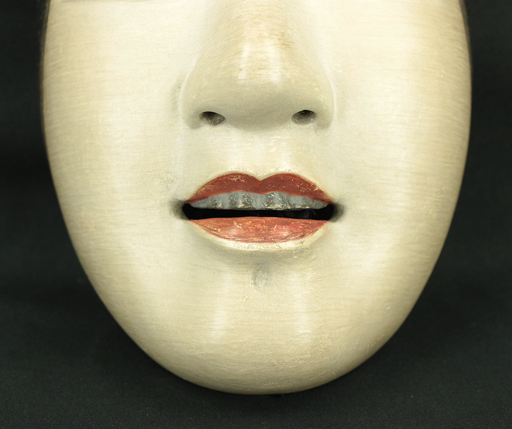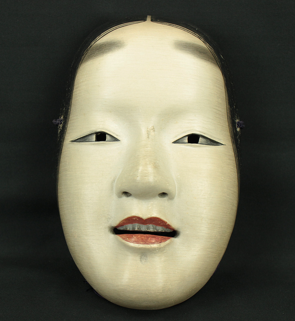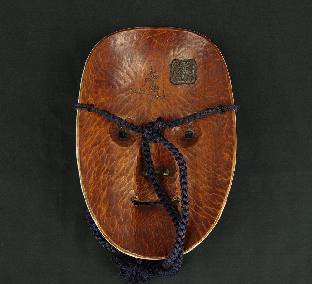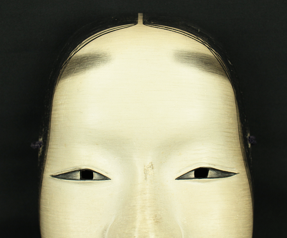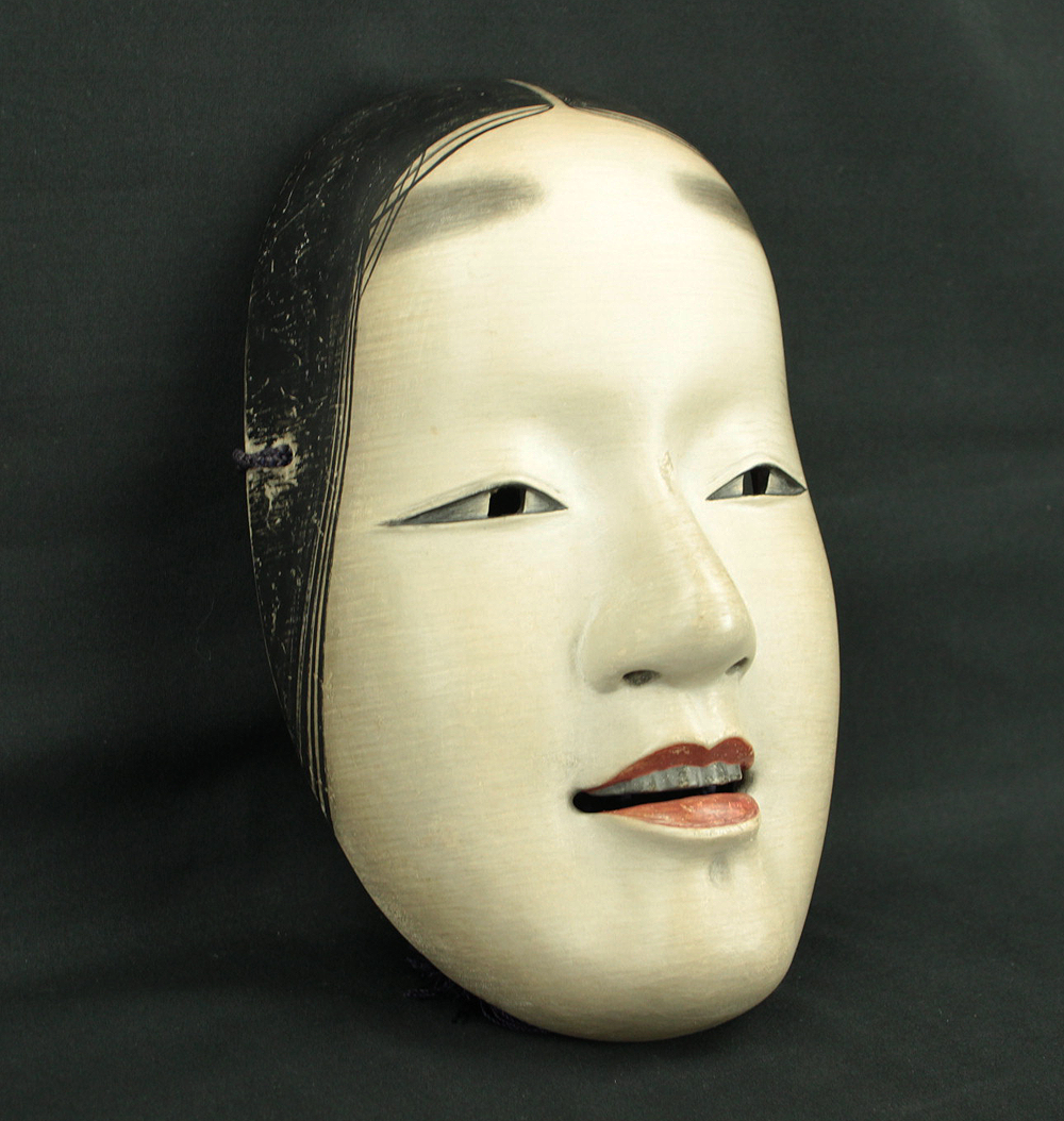 A mask said to have been created by Zoami - 増阿弥 (Muromachi Jidai) of the Hōshō-ryū school. Made from knotty camphor wood, it bears resin stains near the inner corners of the eyes along the bridge of the nose. Hence its name, meaning “Zoonna of the knotty tree”. Used in Noh plays such as “Eguchi” and “Kumano”.