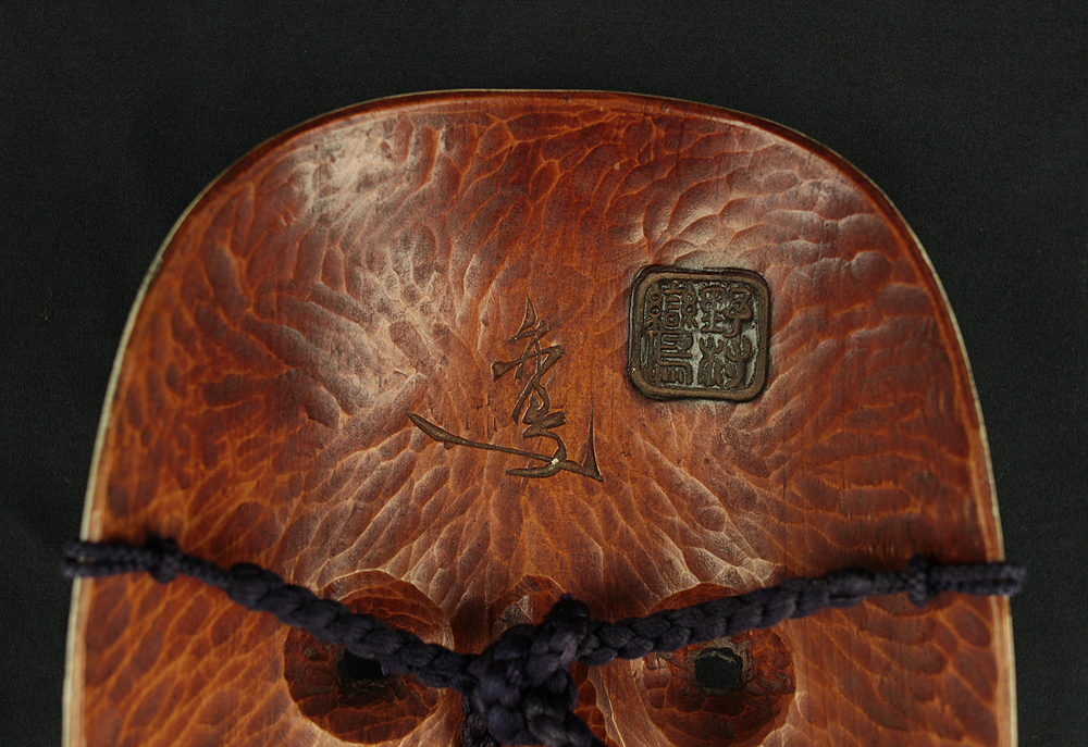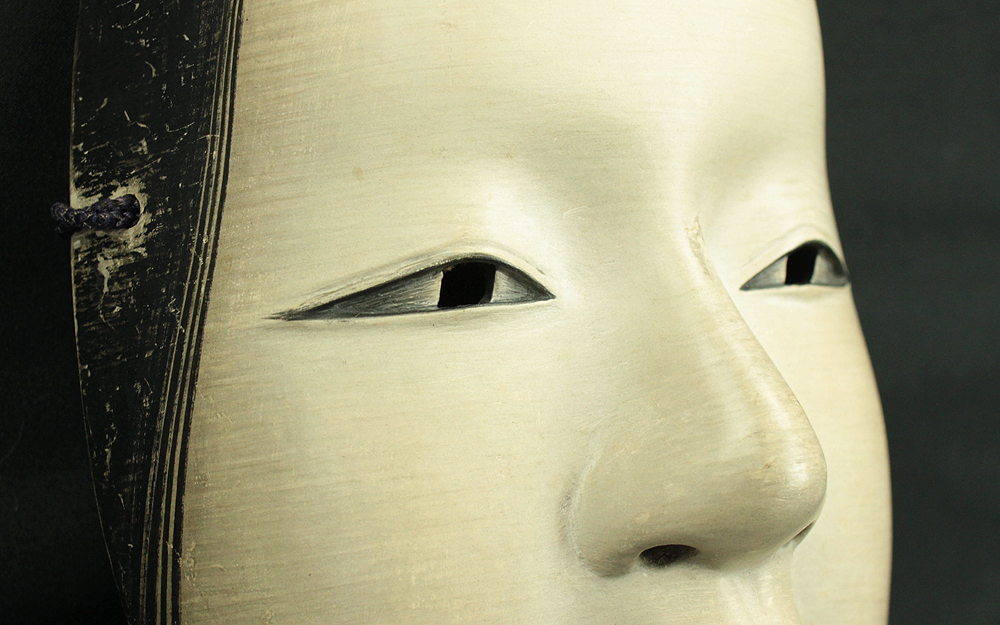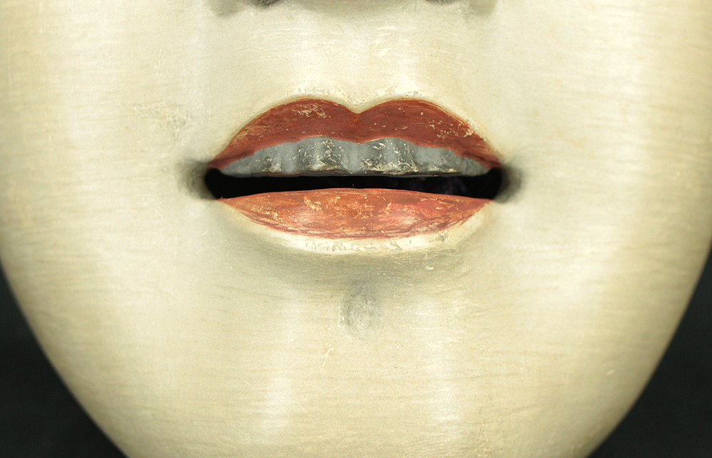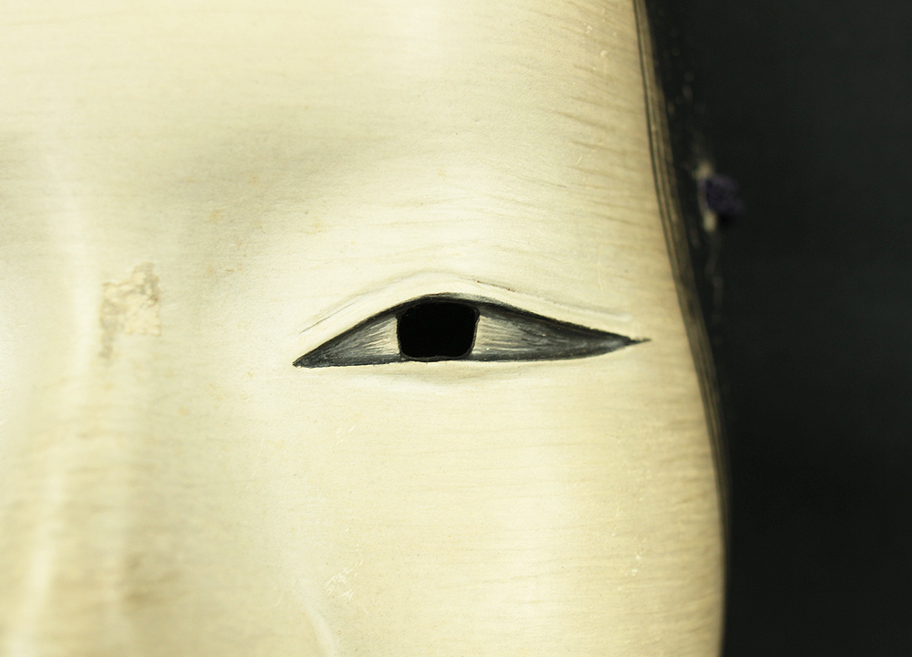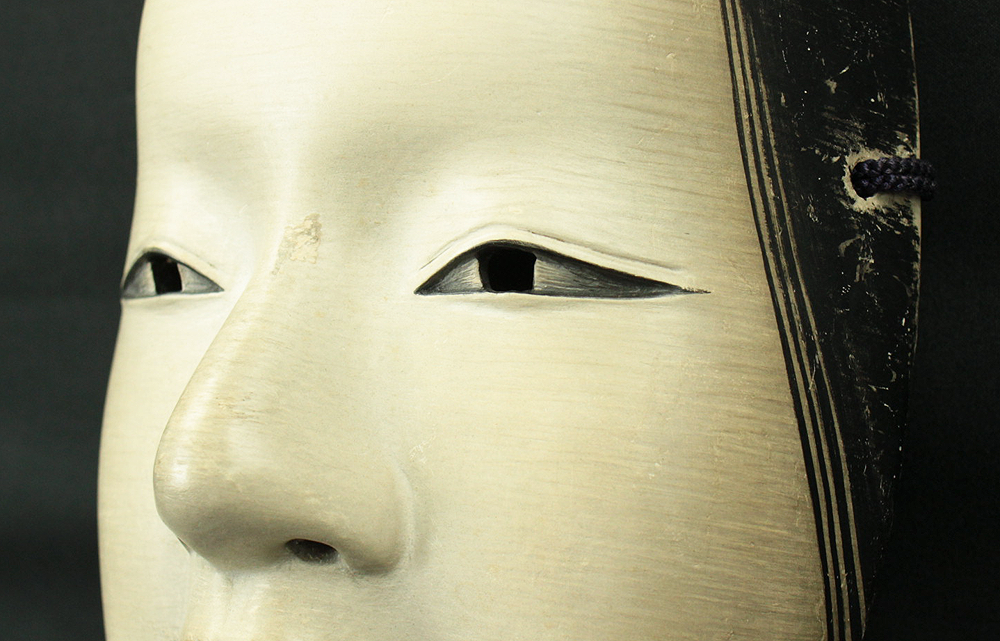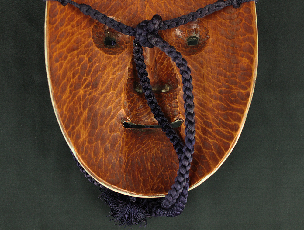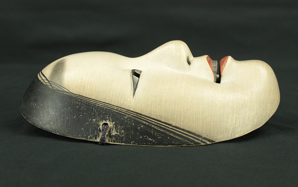 A mask said to have been created by Zoami - 増阿弥 (Muromachi Jidai) of the Hōshō-ryū school. Made from knotty camphor wood, it bears resin stains near the inner corners of the eyes along the bridge of the nose. Hence its name, meaning “Zoonna of the knotty tree”. Used in Noh plays such as “Eguchi” and “Kumano”.