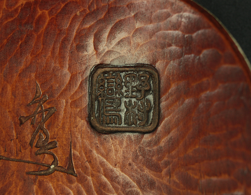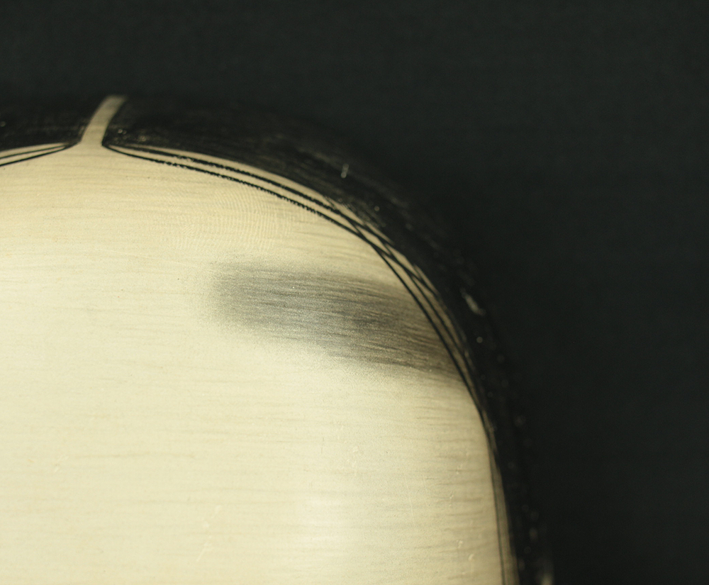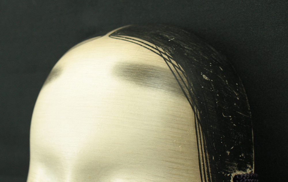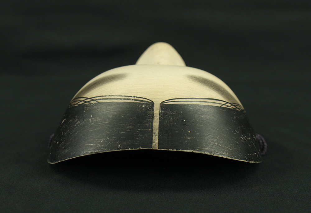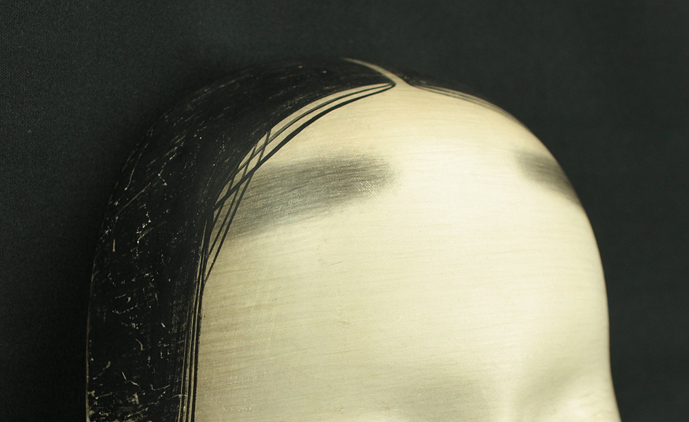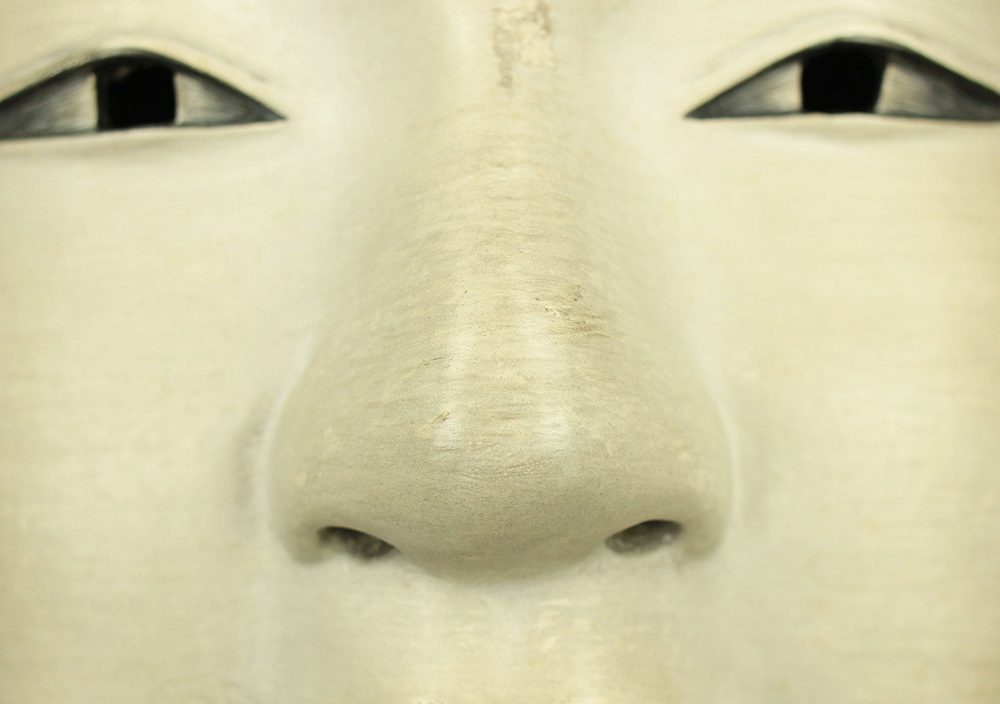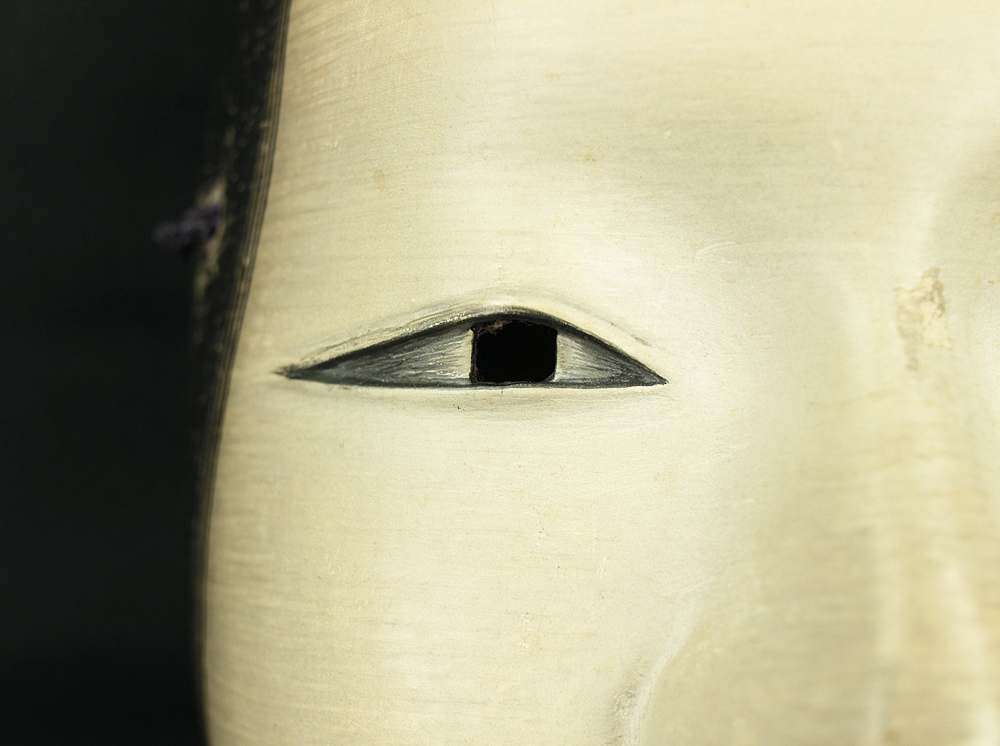 A mask said to have been created by Zoami - 増阿弥 (Muromachi Jidai) of the Hōshō-ryū school. Made from knotty camphor wood, it bears resin stains near the inner corners of the eyes along the bridge of the nose. Hence its name, meaning “Zoonna of the knotty tree”. Used in Noh plays such as “Eguchi” and “Kumano”.