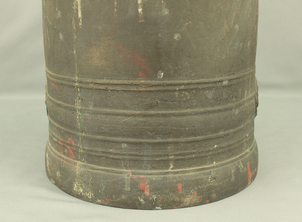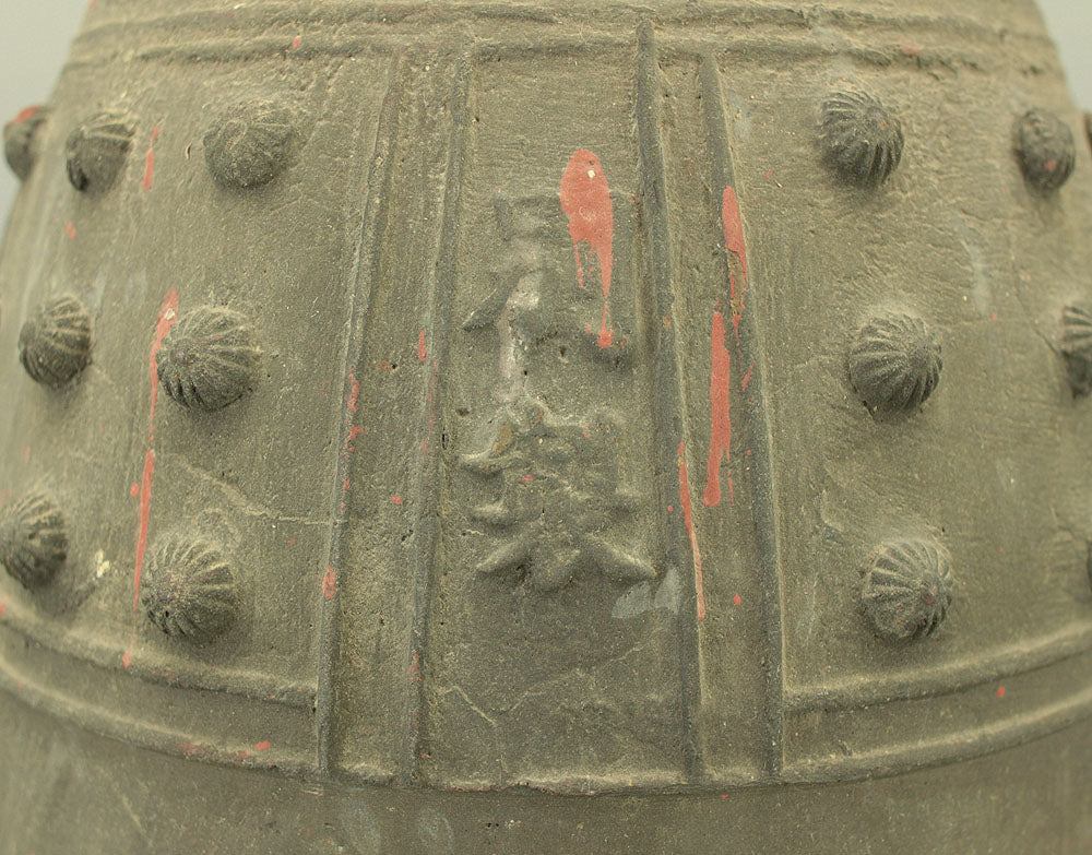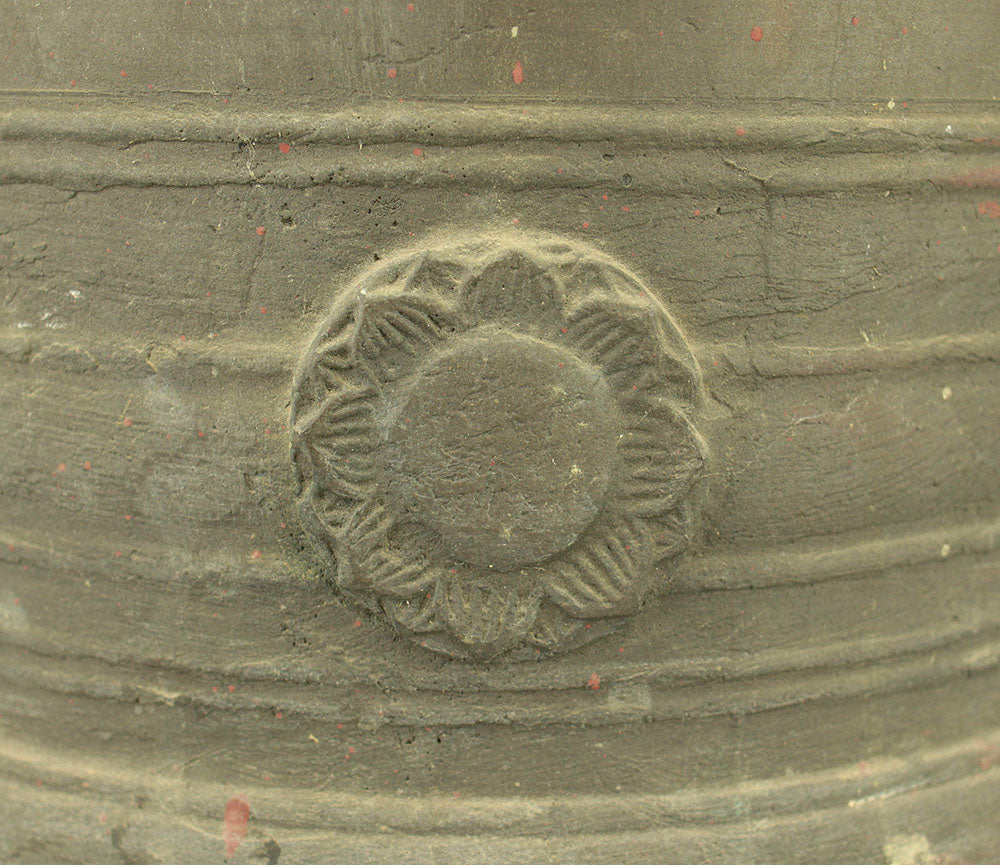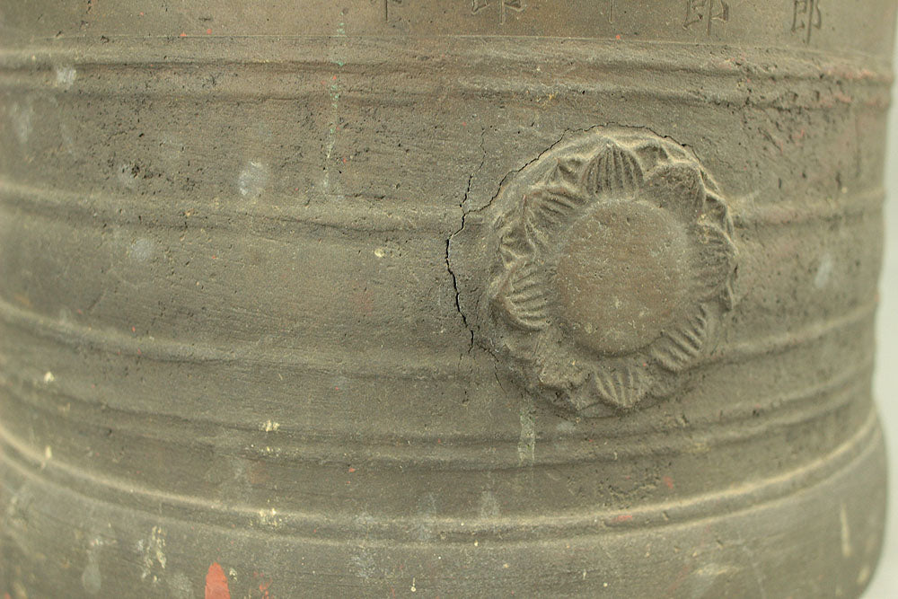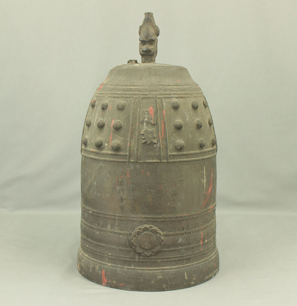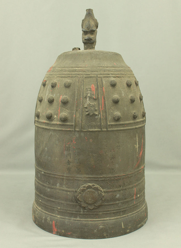 A substantial Japanese bronze temple bell (bonshō) from the Meiji to early Shōwa period (circa 1900–1930), measuring 43 cm in height and weighing approximately 11.75 kg. The bell features a classic rounded form with flared base and raised knobs (chi) arranged in symmetrical rows. The uppermost ring-shaped section, known as the dragon’s head (ryūzu), is sculpted with two beast heads meeting at the lip—an iconic motif in Buddhist ritual bells. Engraved on the surface is the inscription: “Donated by Utsumi Tarō”, indicating its ceremonial or commemorative origin. The reddish areas visible on the surface are not material changes, but rather marks and discoloration accumulated through long-term storage and use, contributing to the bell’s authentic aged character. Its dignified presence and impressive weight make it a striking display piece as well as a culturally significant artifact.