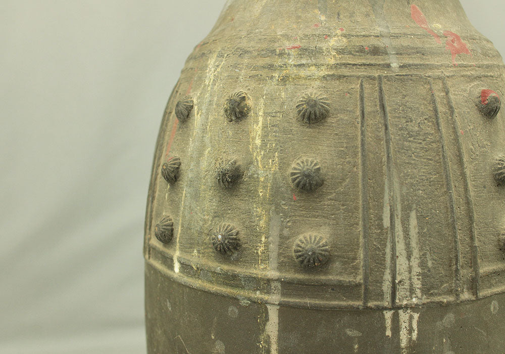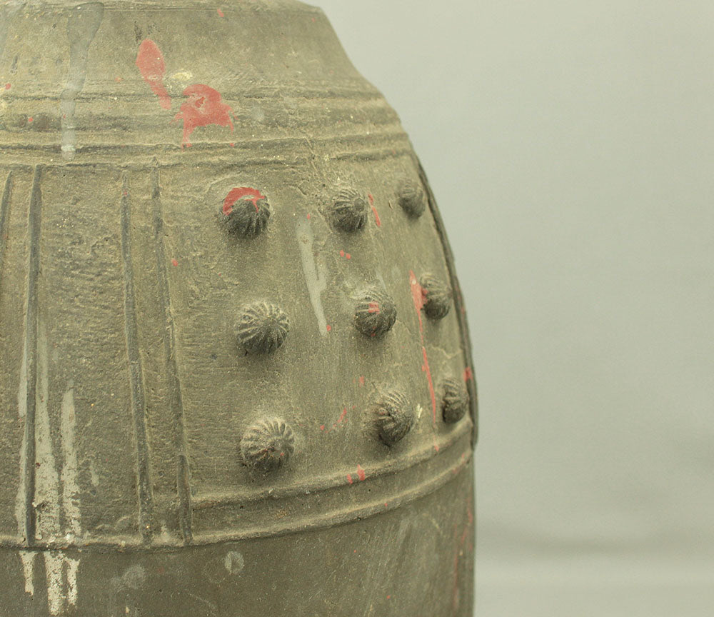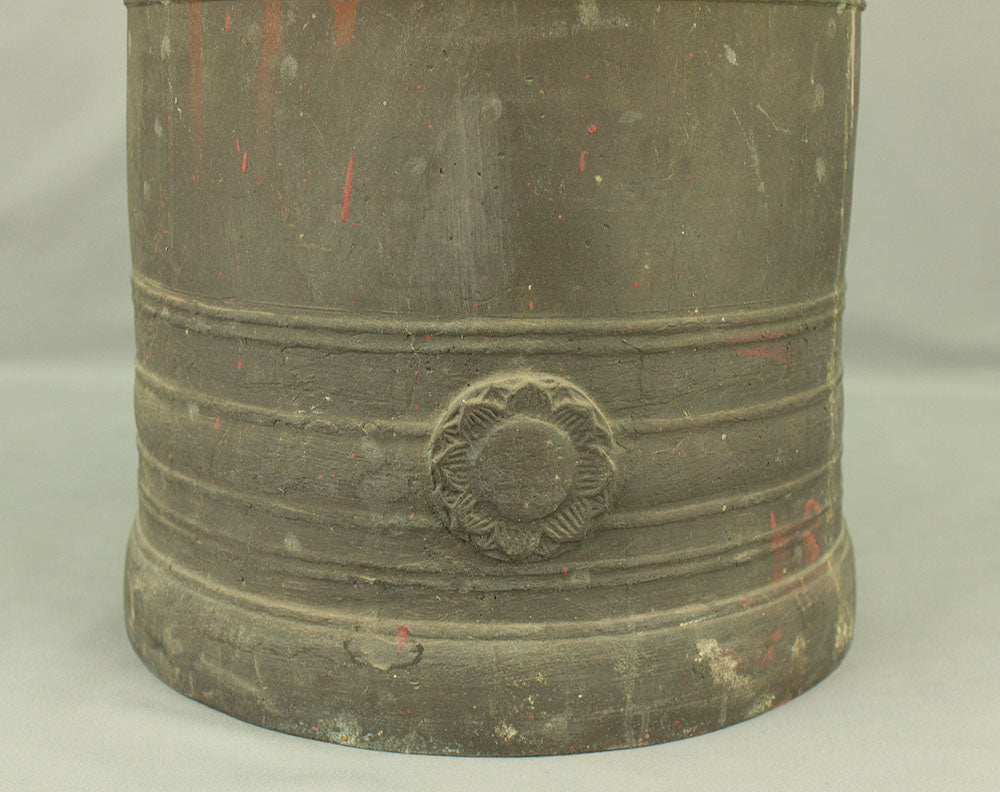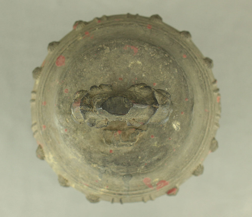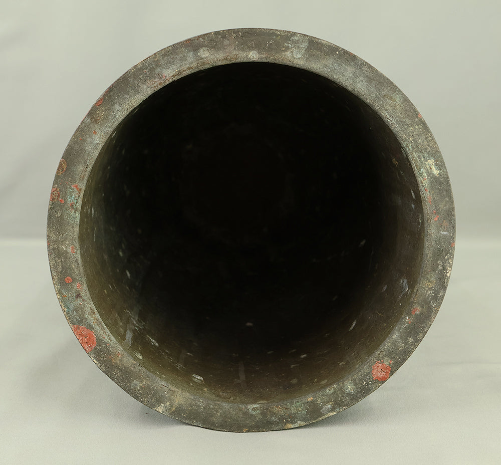A substantial Japanese bronze temple bell (bonshō) from the Meiji to early Shōwa period (circa 1900–1930), measuring 43 cm in height and weighing approximately 11.75 kg. The bell features a classic rounded form with flared base and raised knobs (chi) arranged in symmetrical rows. The uppermost ring-shaped section, known as the dragon’s head (ryūzu), is sculpted with two beast heads meeting at the lip—an iconic motif in Buddhist ritual bells. Engraved on the surface is the inscription: “Donated by Utsumi Tarō”, indicating its ceremonial or commemorative origin. The reddish areas visible on the surface are not material changes, but rather marks and discoloration accumulated through long-term storage and use, contributing to the bell’s authentic aged character. Its dignified presence and impressive weight make it a striking display piece as well as a culturally significant artifact.