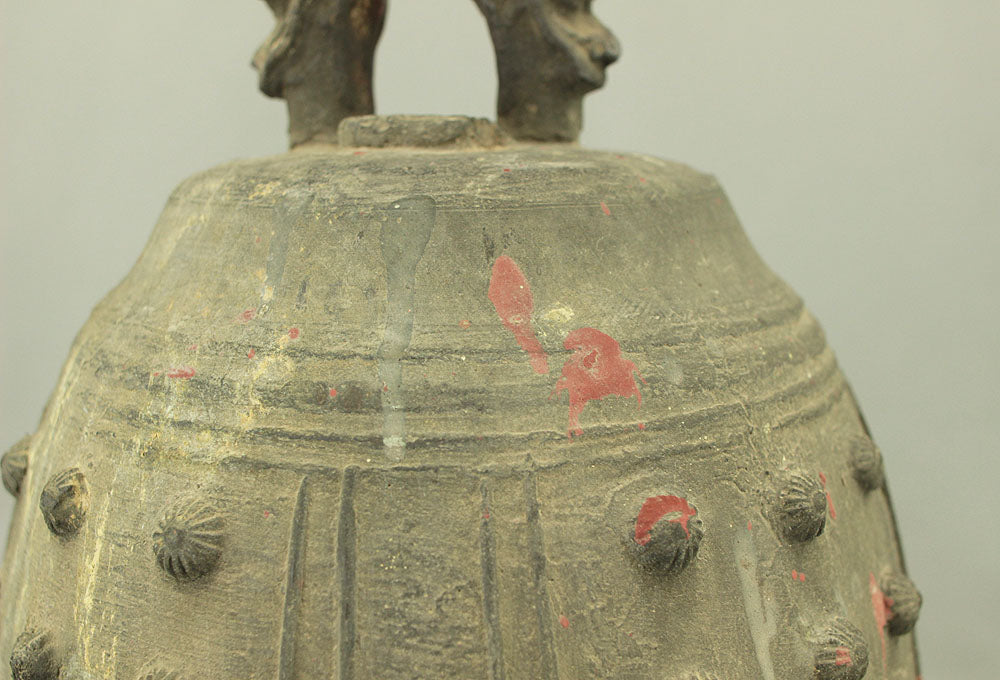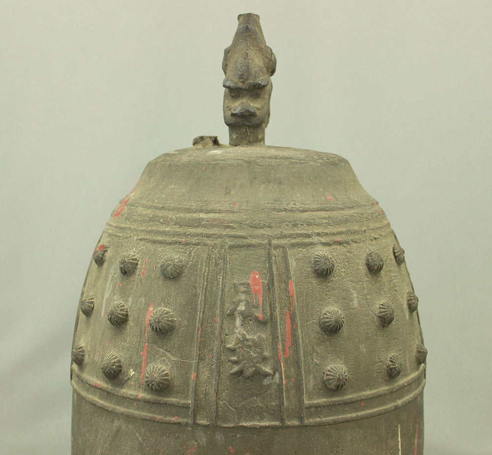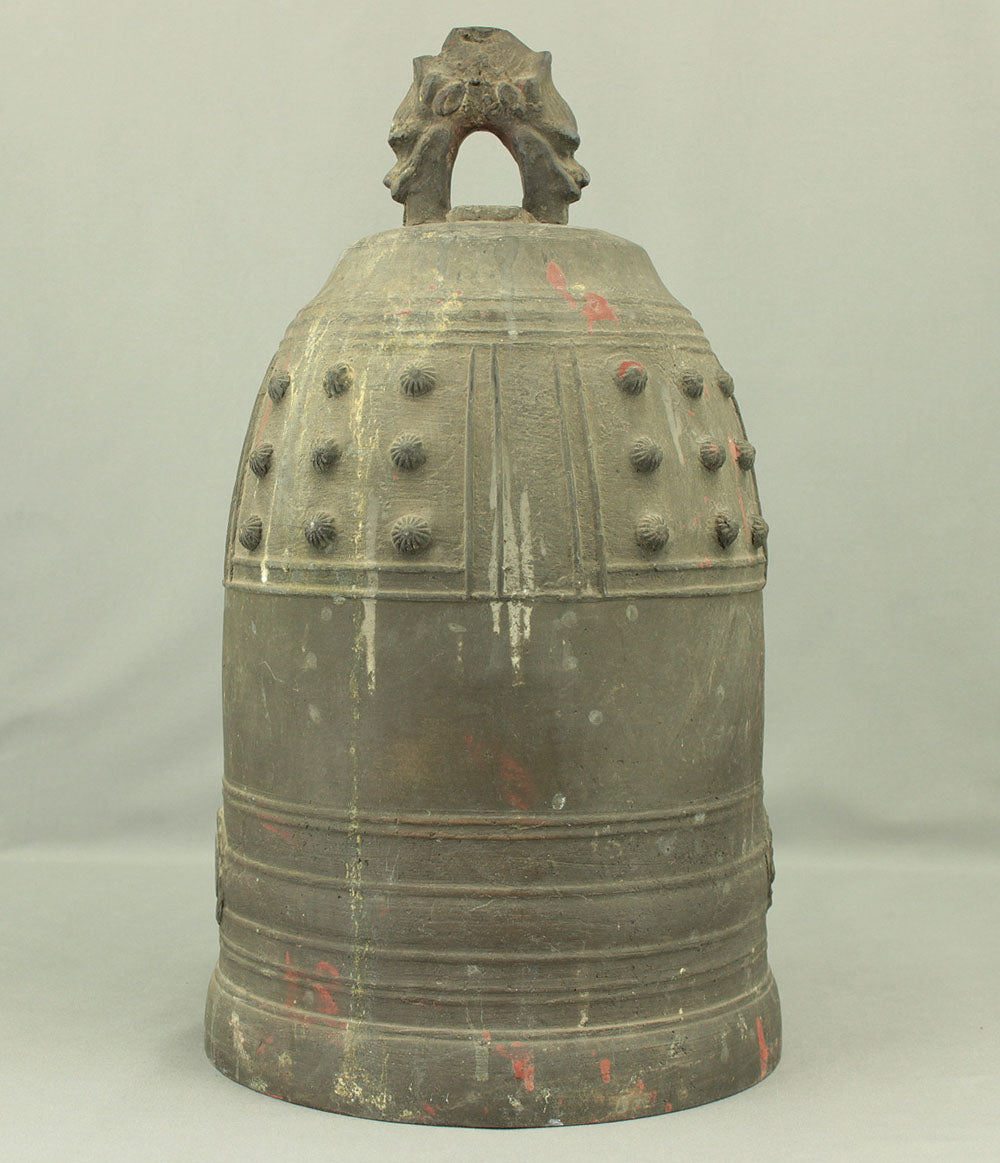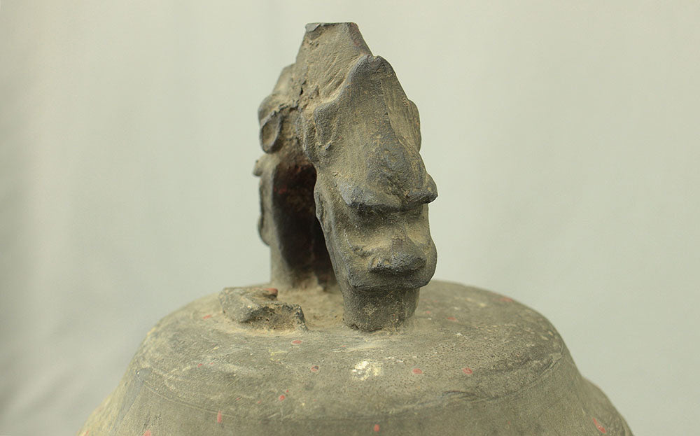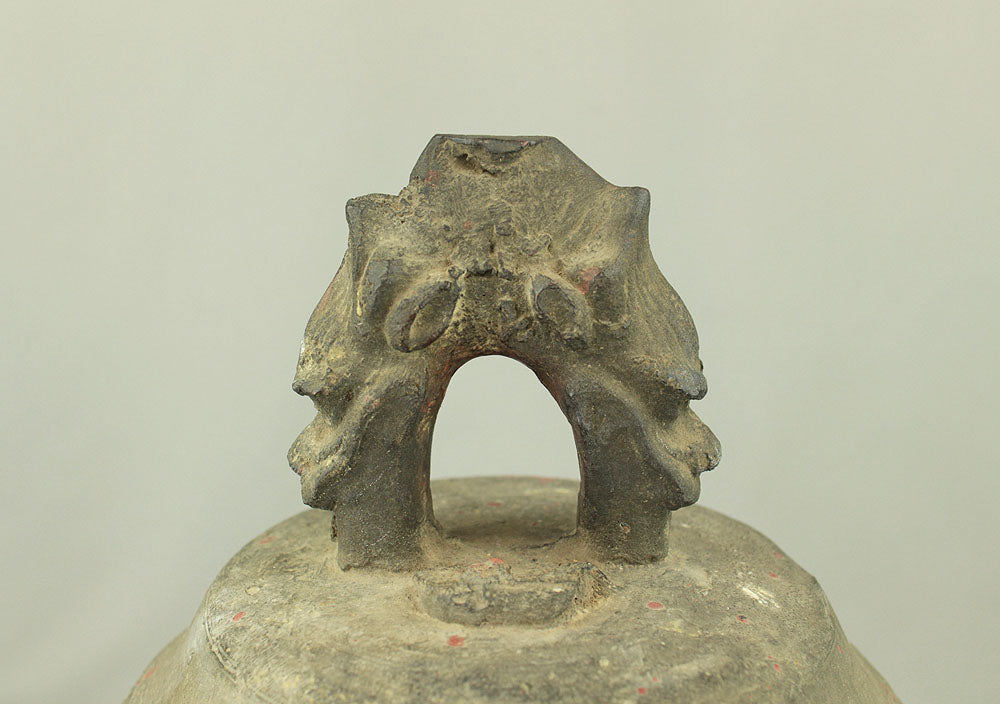 The uppermost ring-shaped part, known as the dragon's head (Ryuzu) is composed of two beast heads, which meet the upper lid of the bell at the lip of the mouth.