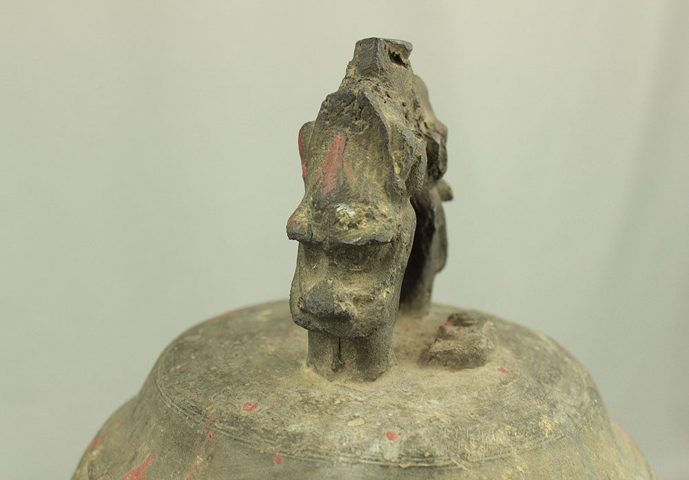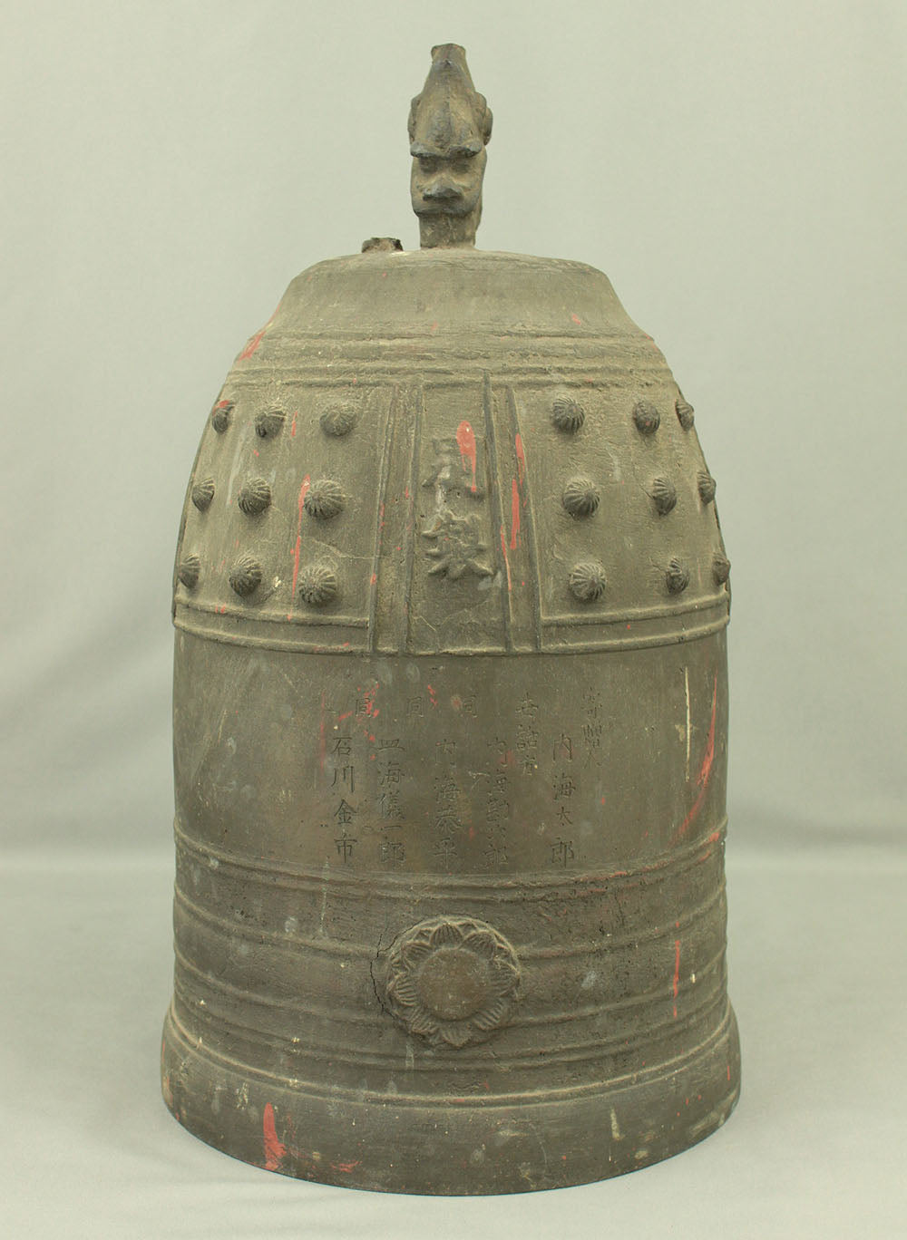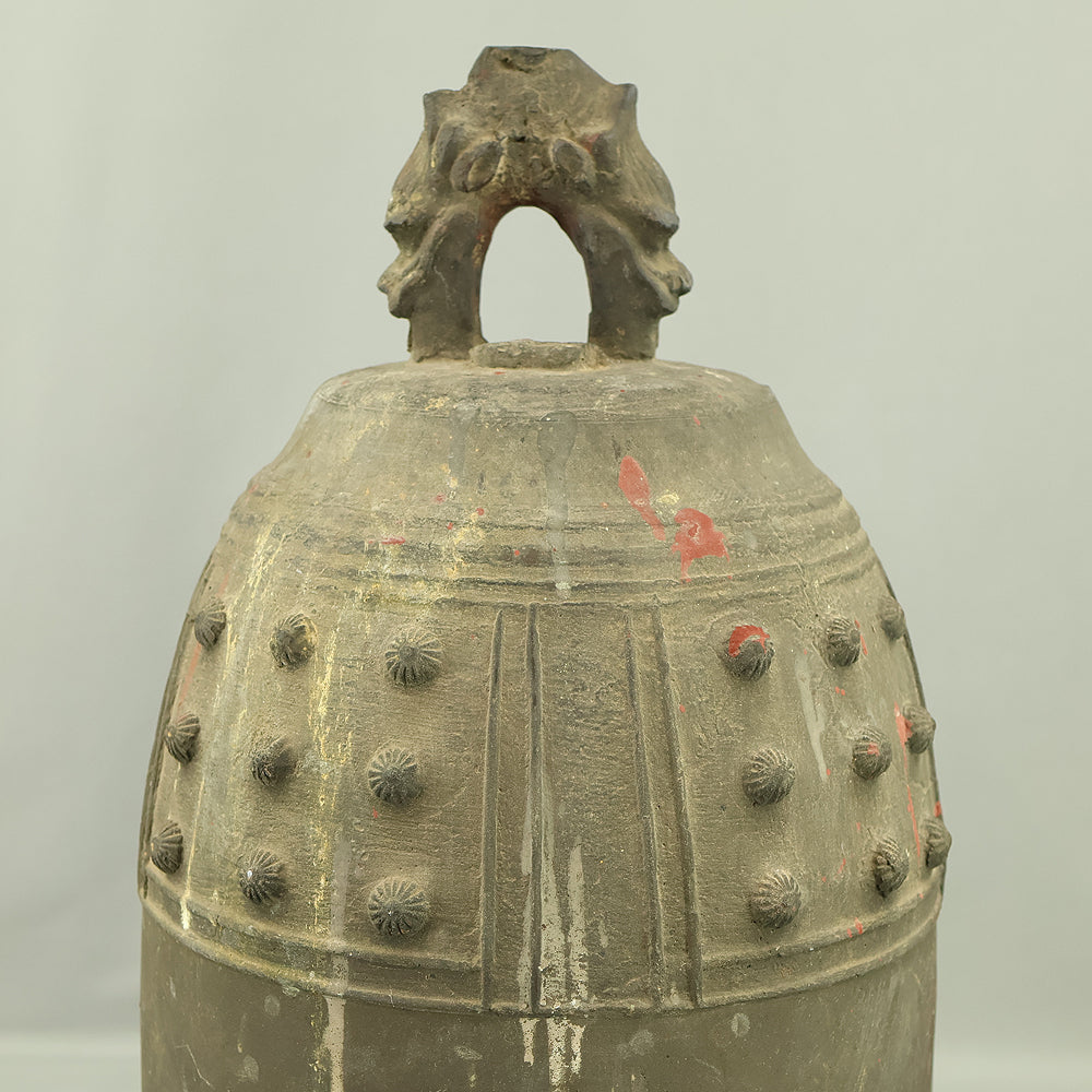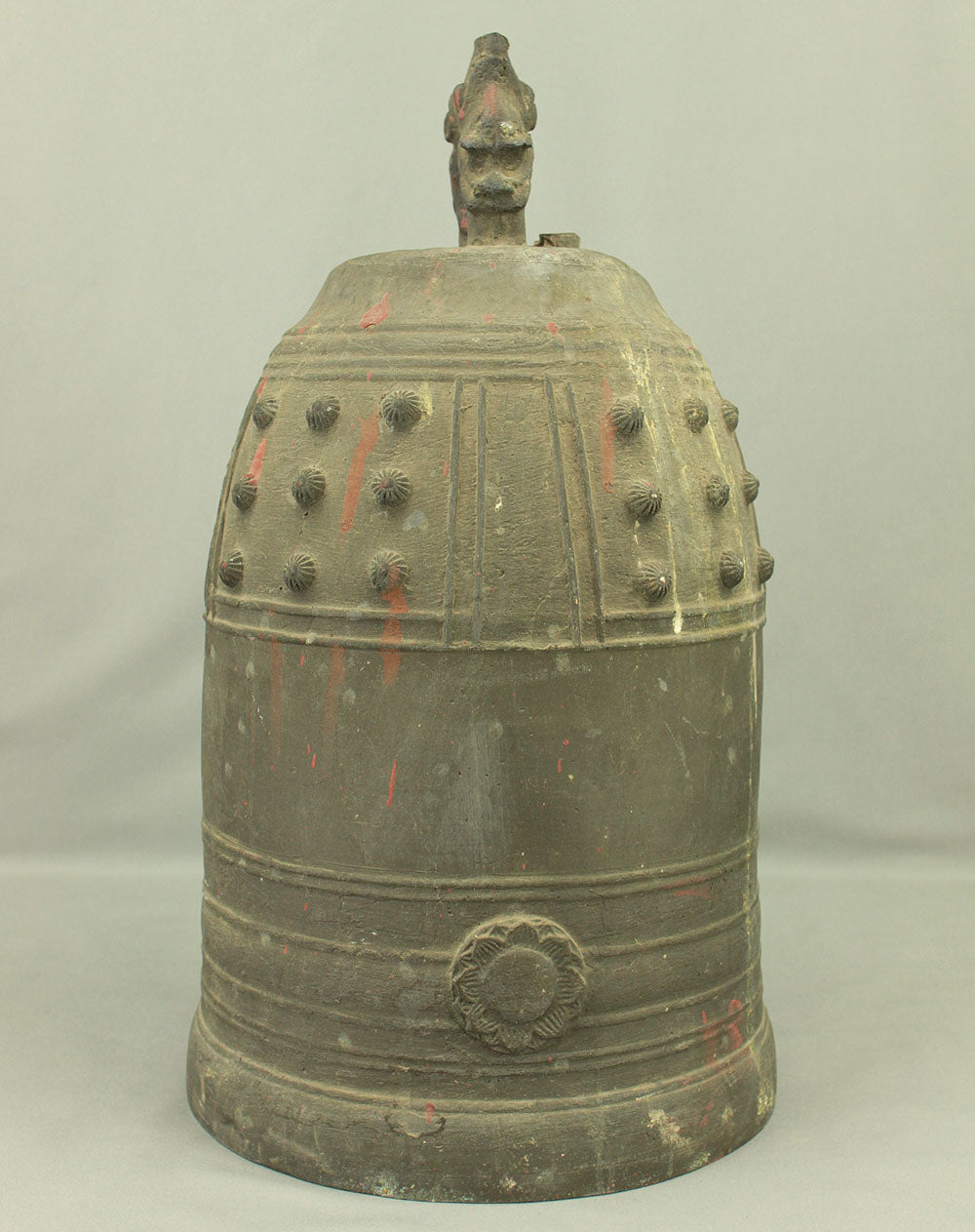 The uppermost ring-shaped part, known as the dragon's head (Ryuzu) is composed of two beast heads, which meet the upper lid of the bell at the lip of the mouth.