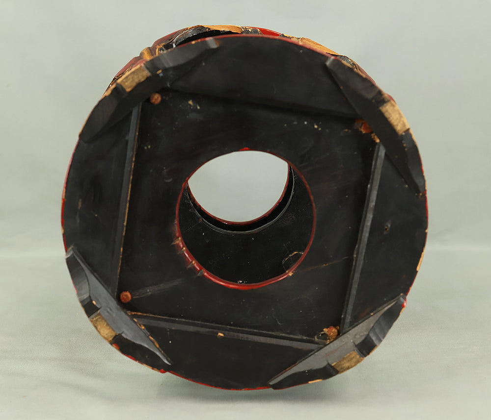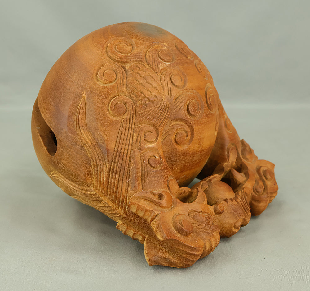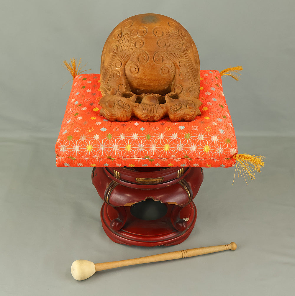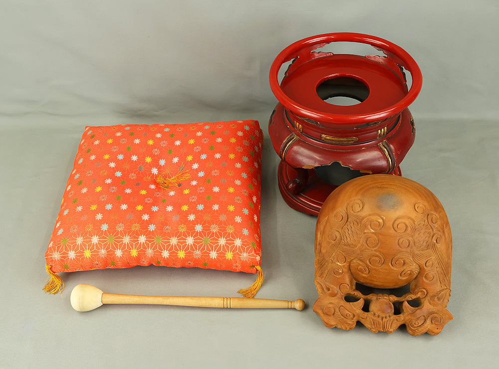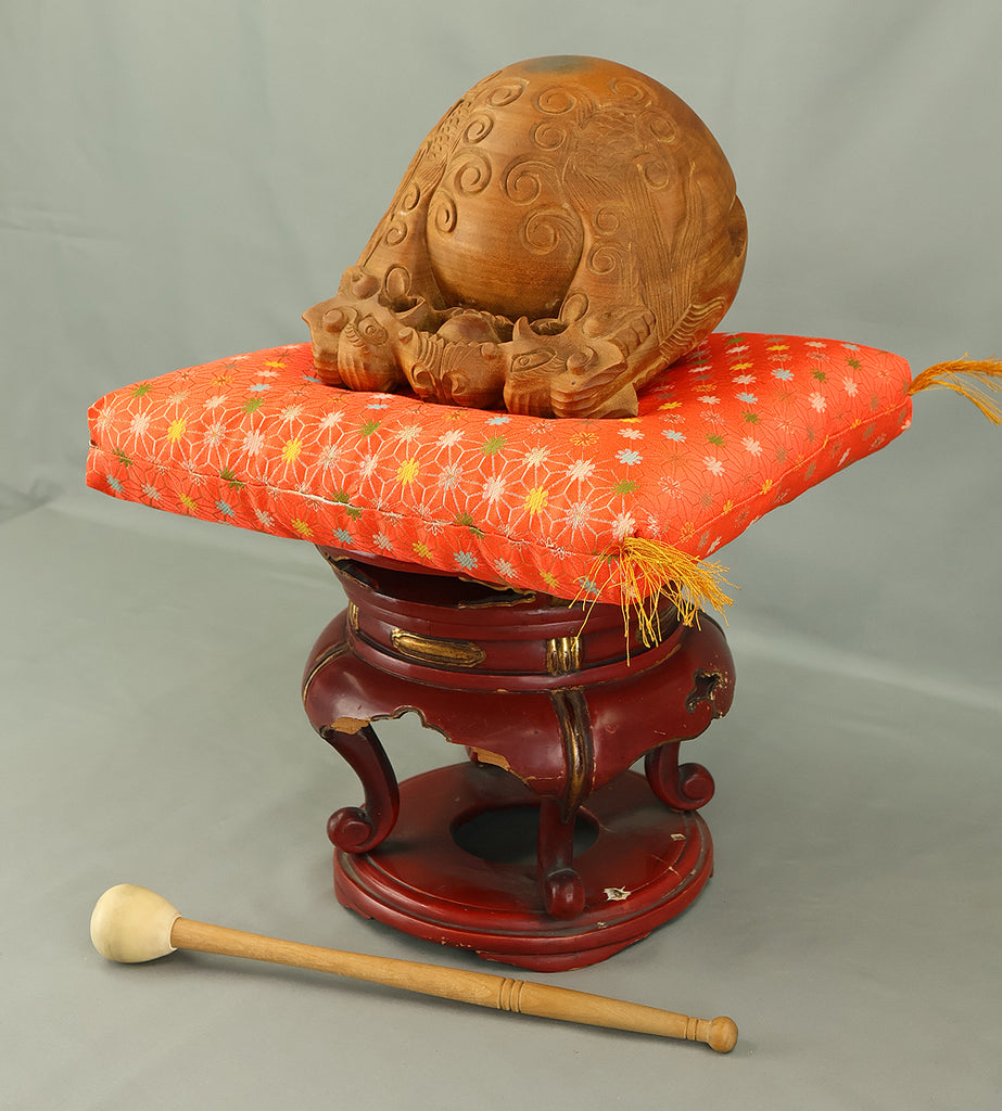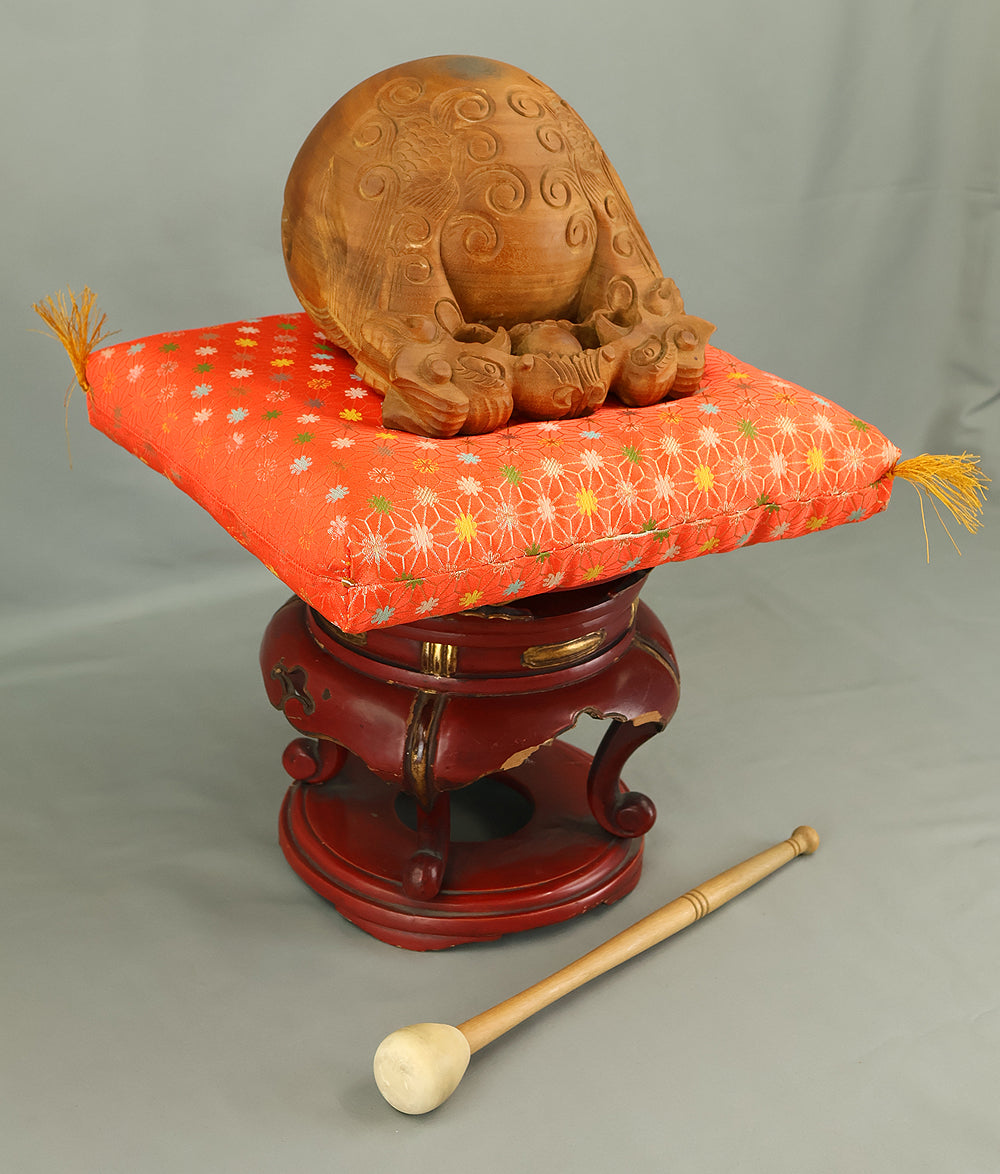This traditional mokugyō (wooden fish) is carved with a rounded, resonant form and comes complete with its matching stand, embroidered cushion, and wooden striker, creating a fully assembled temple set ready for ceremonial use. The mokugyō is a percussion instrument used by monks and lay practitioners during Buddhist rituals, especially in the recitation of sutras and mantras, its steady rhythm supporting concentration and maintaining the cadence of chanting. Resting on a padded cushion to protect the wood and soften the impact, the drum produces a clear, warm tone that reflects the craftsmanship of its carving. As an object of both function and presence, the set brings a quiet sense of devotion and traditional atmosphere to any space, embodying the calm discipline of Buddhist practice.