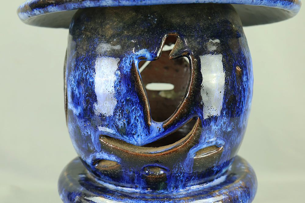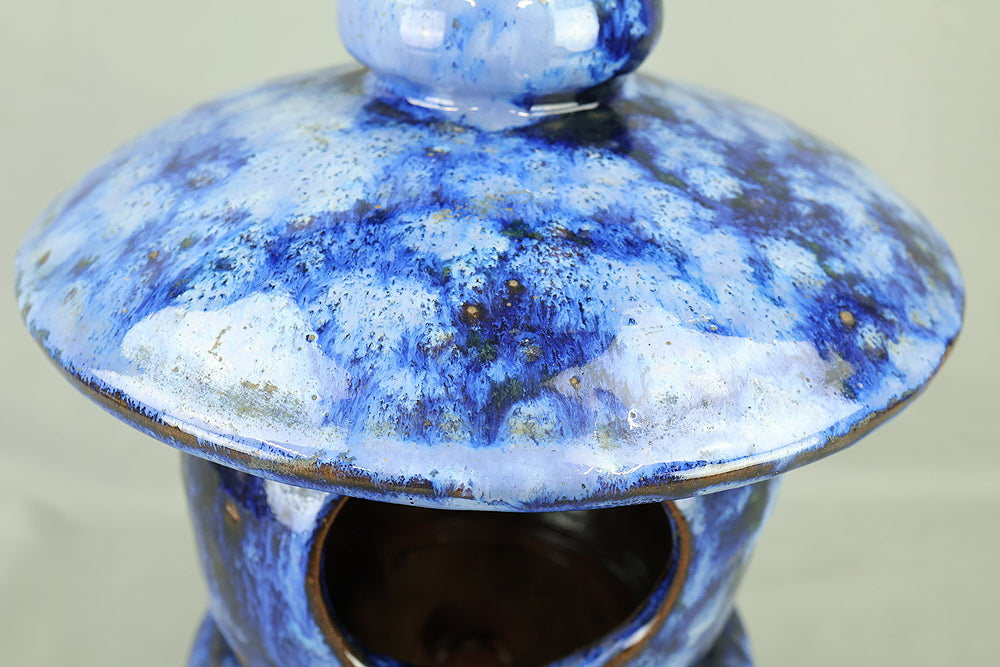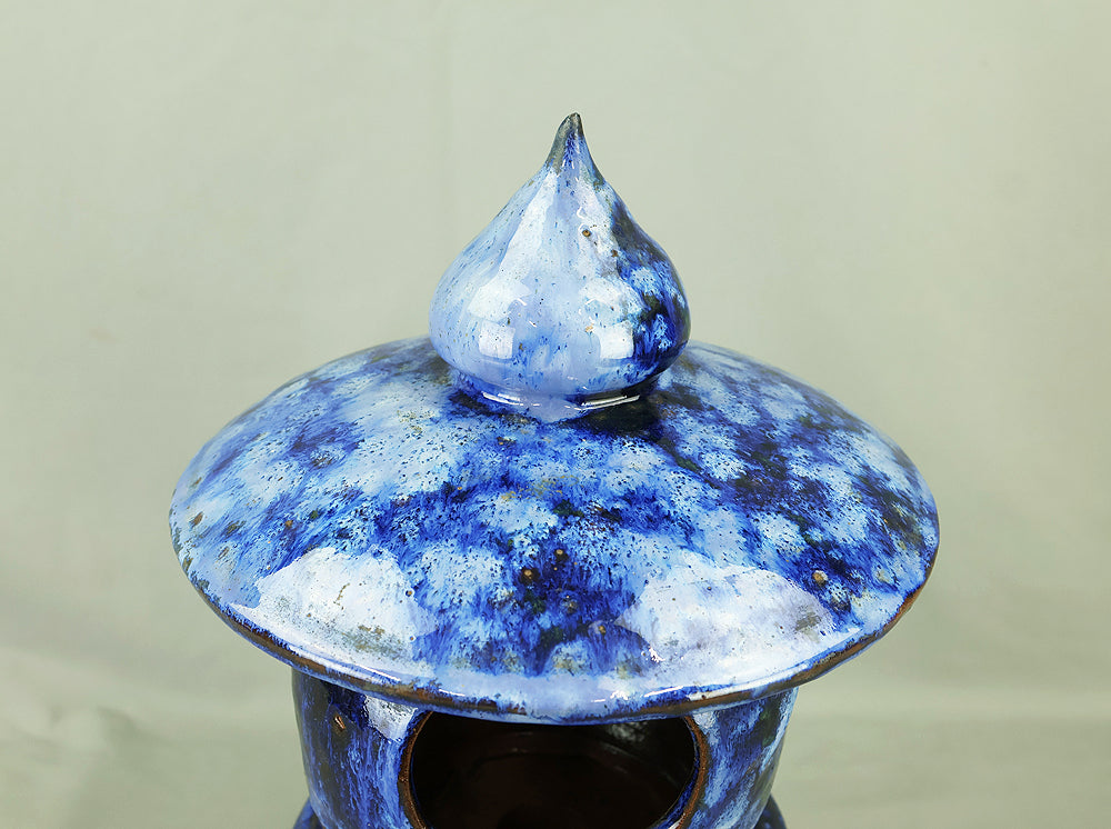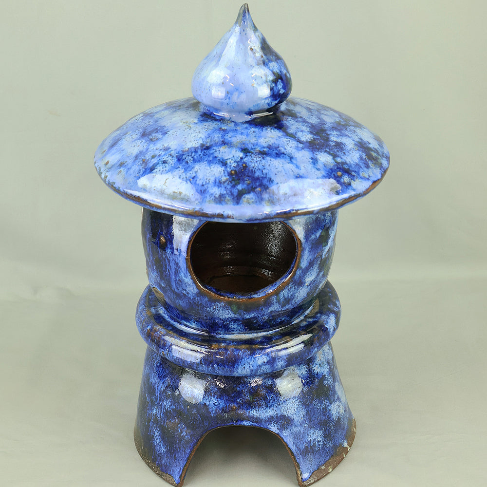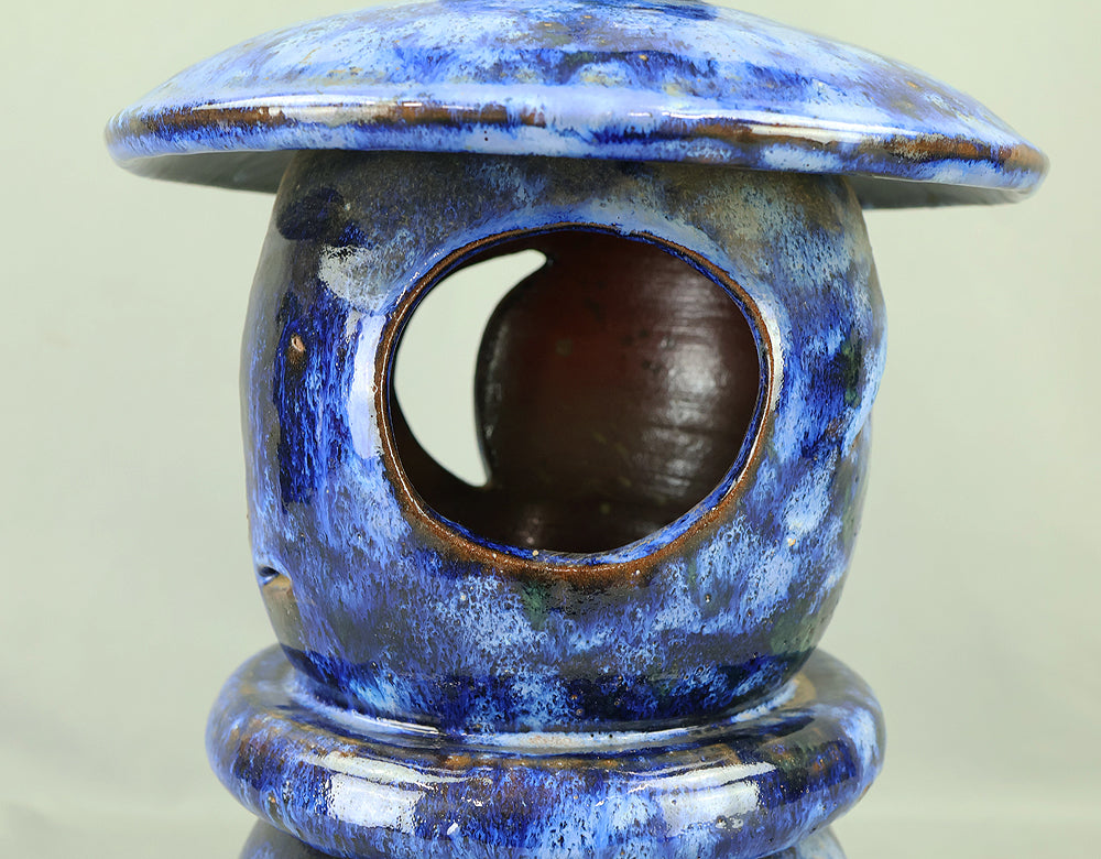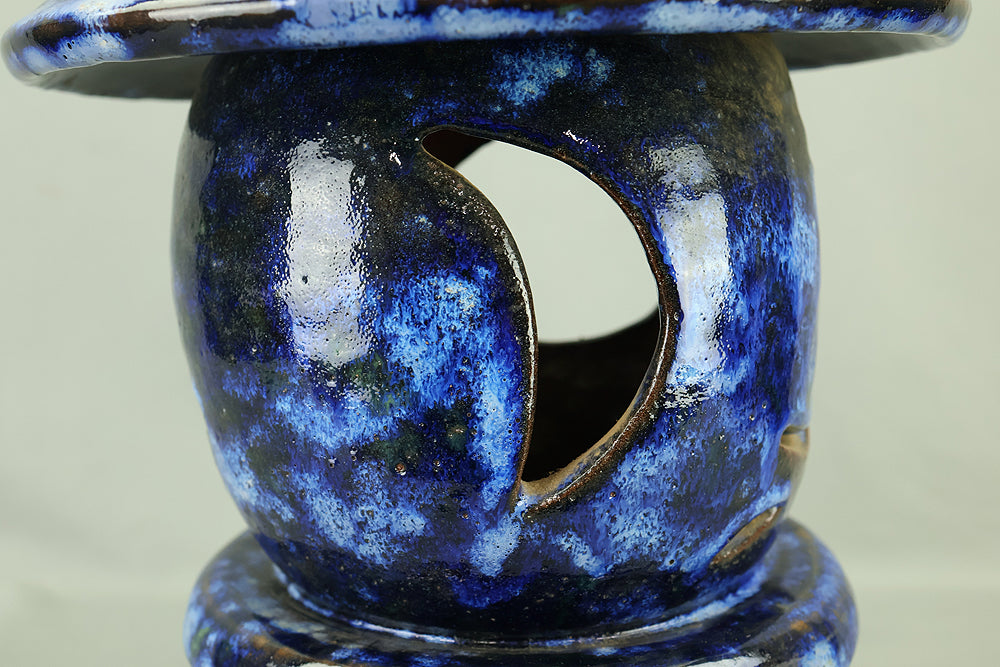This pottery Japanese garden lantern features a richly layered blue glaze with deep cobalt and lighter mineral tones that pool and flow organically across the surface, creating a strong sense of depth and movement unique to kiln-fired work. The classic lantern form is compact yet well balanced, with carefully proportioned openings that allow light to glow softly from within, making it suitable for use with a candle or LED light. Subtle variations in glaze, firing marks, and texture give the piece an authentic handmade character, while the substantial weight conveys durability and presence. Ideal for a Japanese garden, terrace, or interior display, it also works beautifully as a sculptural accent on its own, offering a calm, contemplative atmosphere and a timeless aesthetic that blends traditional form with expressive ceramic craftsmanship.