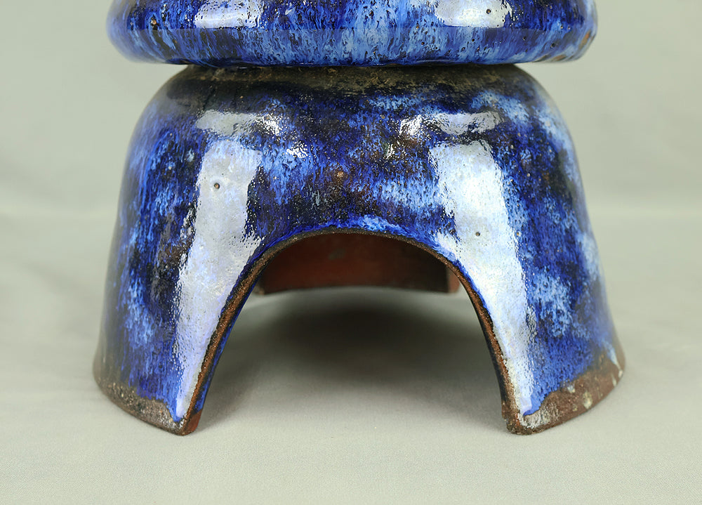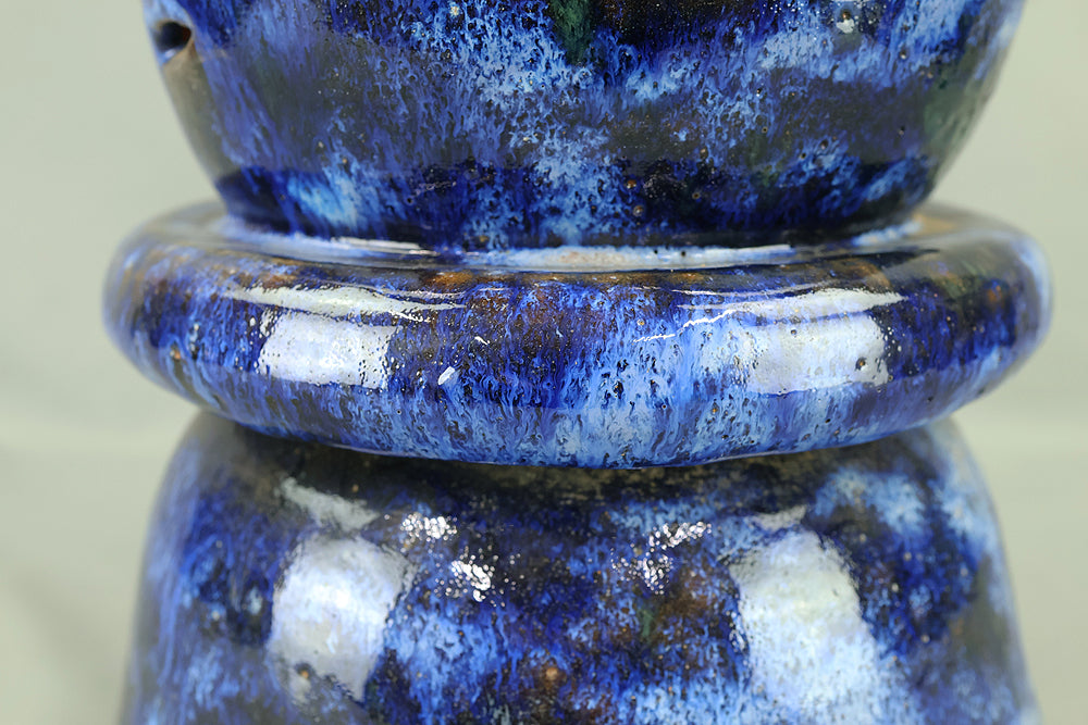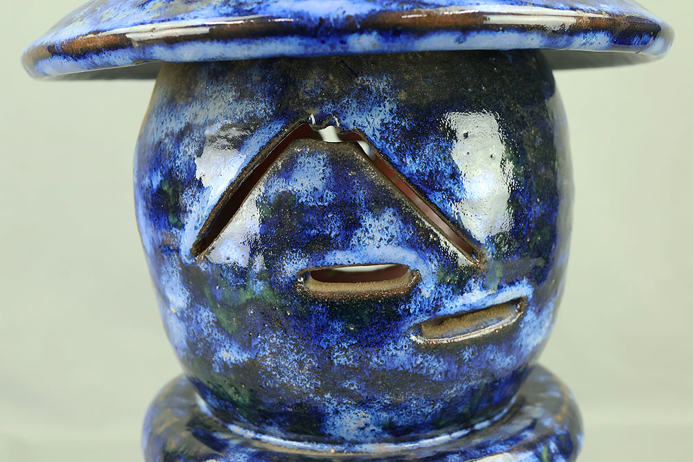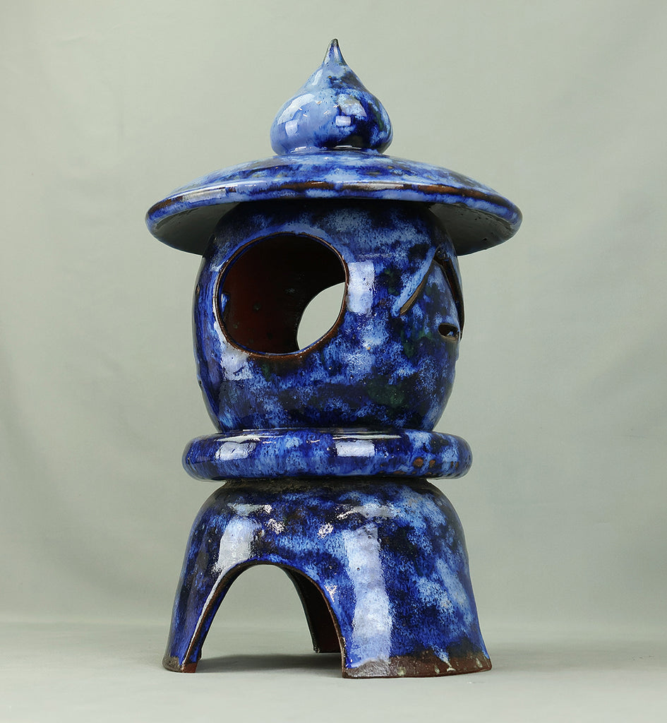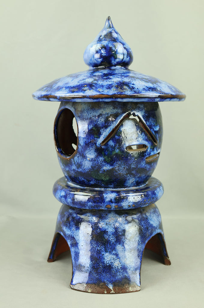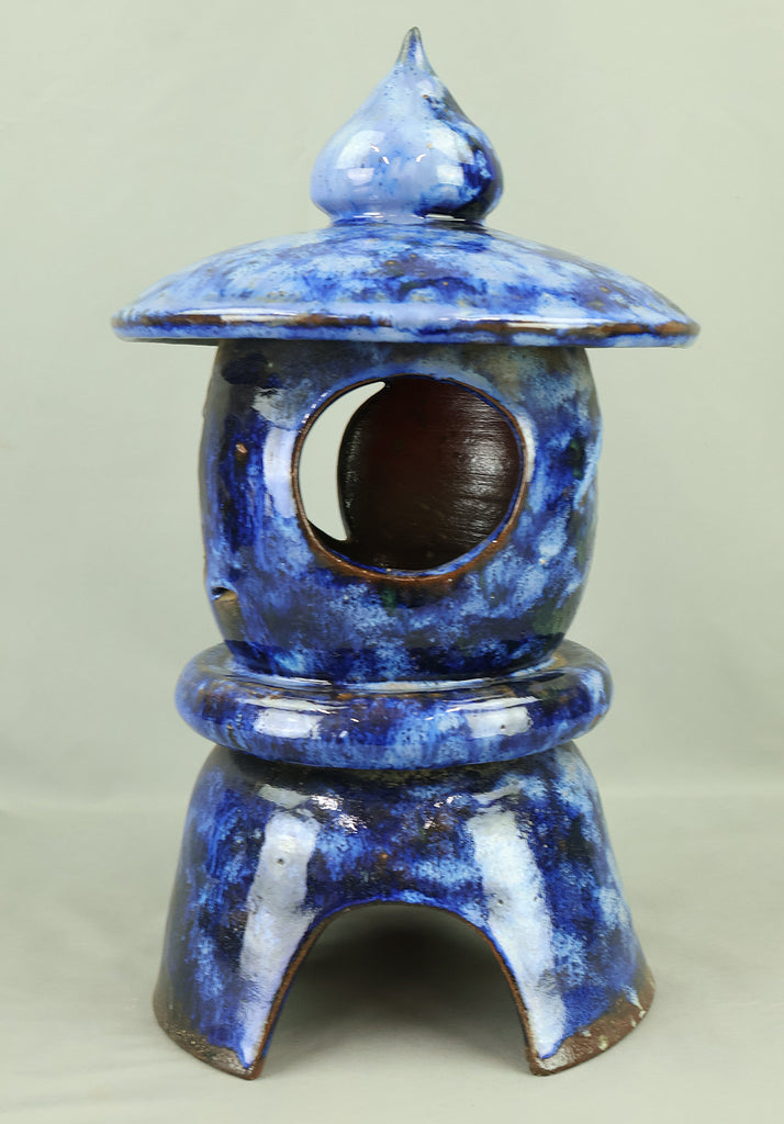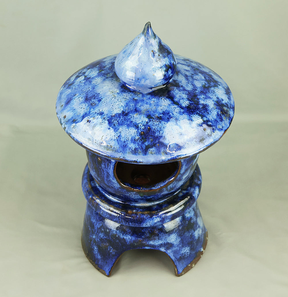 This pottery Japanese garden lantern features a richly layered blue glaze with deep cobalt and lighter mineral tones that pool and flow organically across the surface, creating a strong sense of depth and movement unique to kiln-fired work. The classic lantern form is compact yet well balanced, with carefully proportioned openings that allow light to glow softly from within, making it suitable for use with a candle or LED light. Subtle variations in glaze, firing marks, and texture give the piece an authentic handmade character, while the substantial weight conveys durability and presence. Ideal for a Japanese garden, terrace, or interior display, it also works beautifully as a sculptural accent on its own, offering a calm, contemplative atmosphere and a timeless aesthetic that blends traditional form with expressive ceramic craftsmanship.