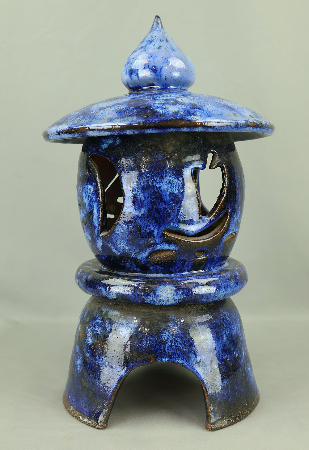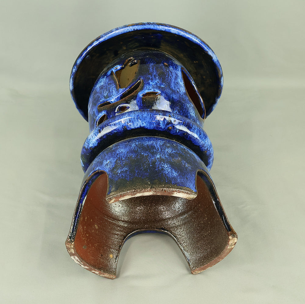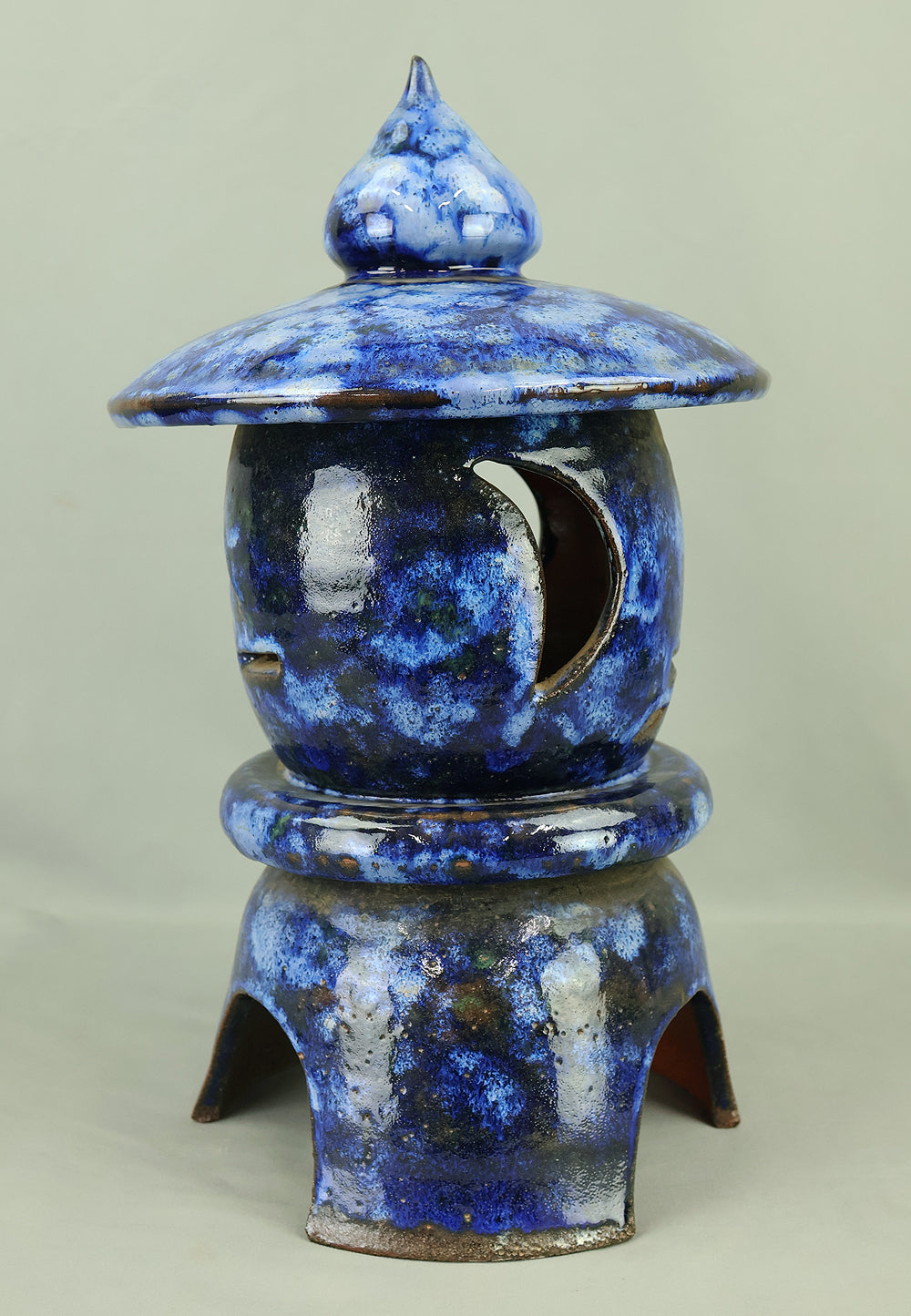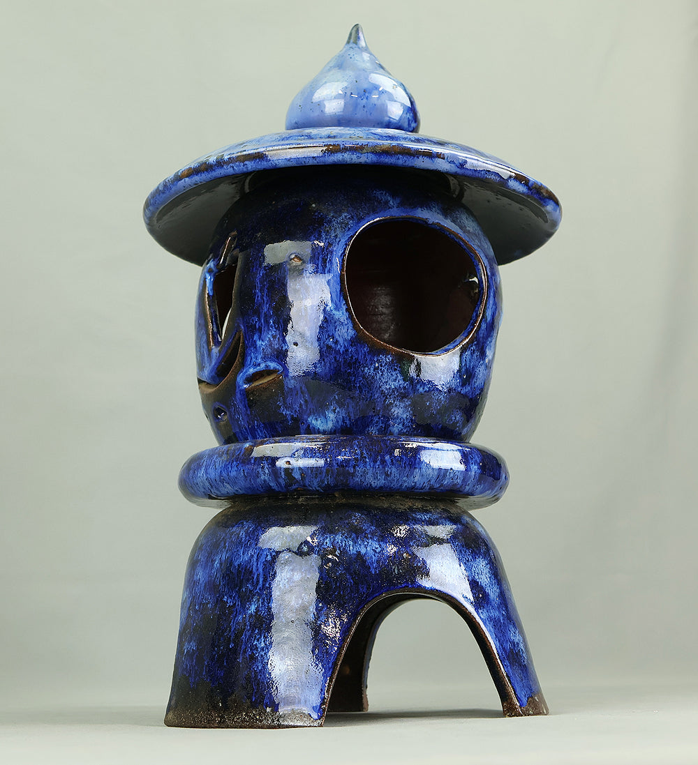 This pottery Japanese garden lantern features a richly layered blue glaze with deep cobalt and lighter mineral tones that pool and flow organically across the surface, creating a strong sense of depth and movement unique to kiln-fired work. The classic lantern form is compact yet well balanced, with carefully proportioned openings that allow light to glow softly from within, making it suitable for use with a candle or LED light. Subtle variations in glaze, firing marks, and texture give the piece an authentic handmade character, while the substantial weight conveys durability and presence. Ideal for a Japanese garden, terrace, or interior display, it also works beautifully as a sculptural accent on its own, offering a calm, contemplative atmosphere and a timeless aesthetic that blends traditional form with expressive ceramic craftsmanship.