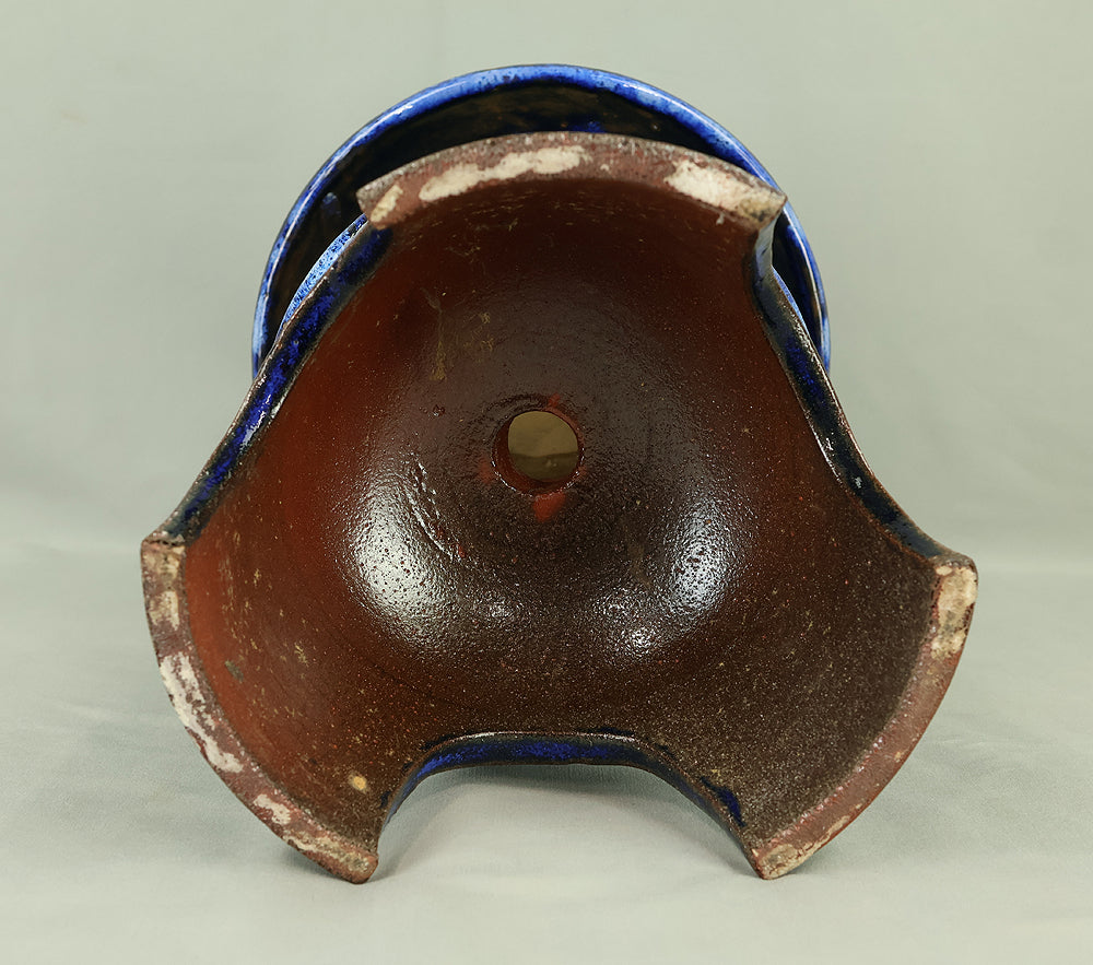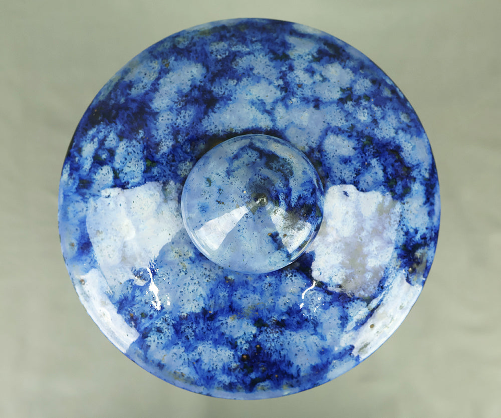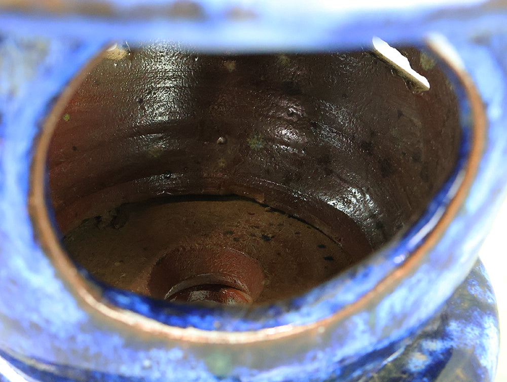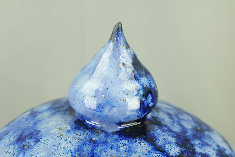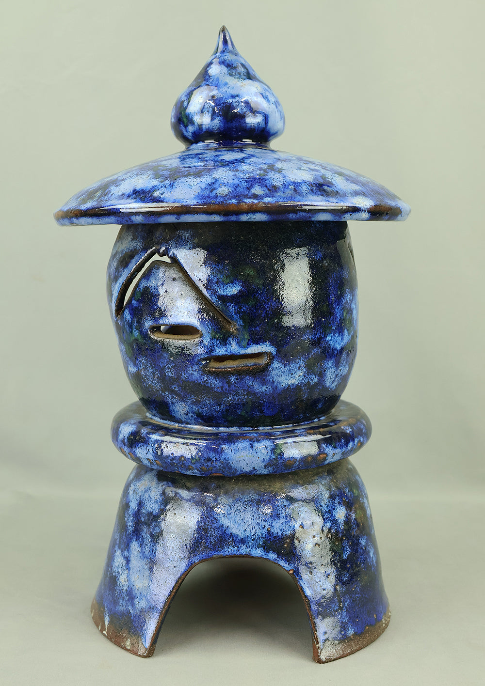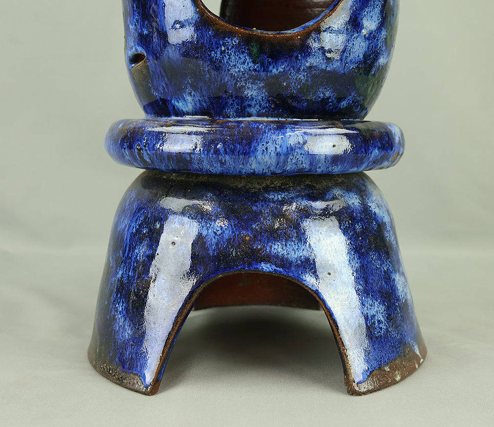 This pottery Japanese garden lantern features a richly layered blue glaze with deep cobalt and lighter mineral tones that pool and flow organically across the surface, creating a strong sense of depth and movement unique to kiln-fired work. The classic lantern form is compact yet well balanced, with carefully proportioned openings that allow light to glow softly from within, making it suitable for use with a candle or LED light. Subtle variations in glaze, firing marks, and texture give the piece an authentic handmade character, while the substantial weight conveys durability and presence. Ideal for a Japanese garden, terrace, or interior display, it also works beautifully as a sculptural accent on its own, offering a calm, contemplative atmosphere and a timeless aesthetic that blends traditional form with expressive ceramic craftsmanship.