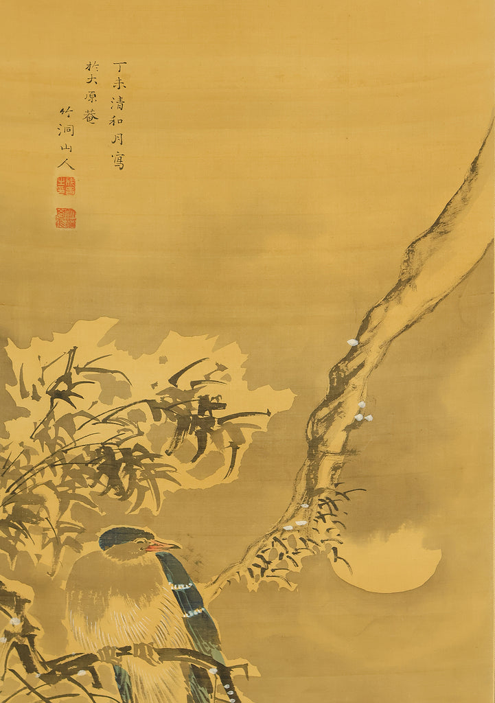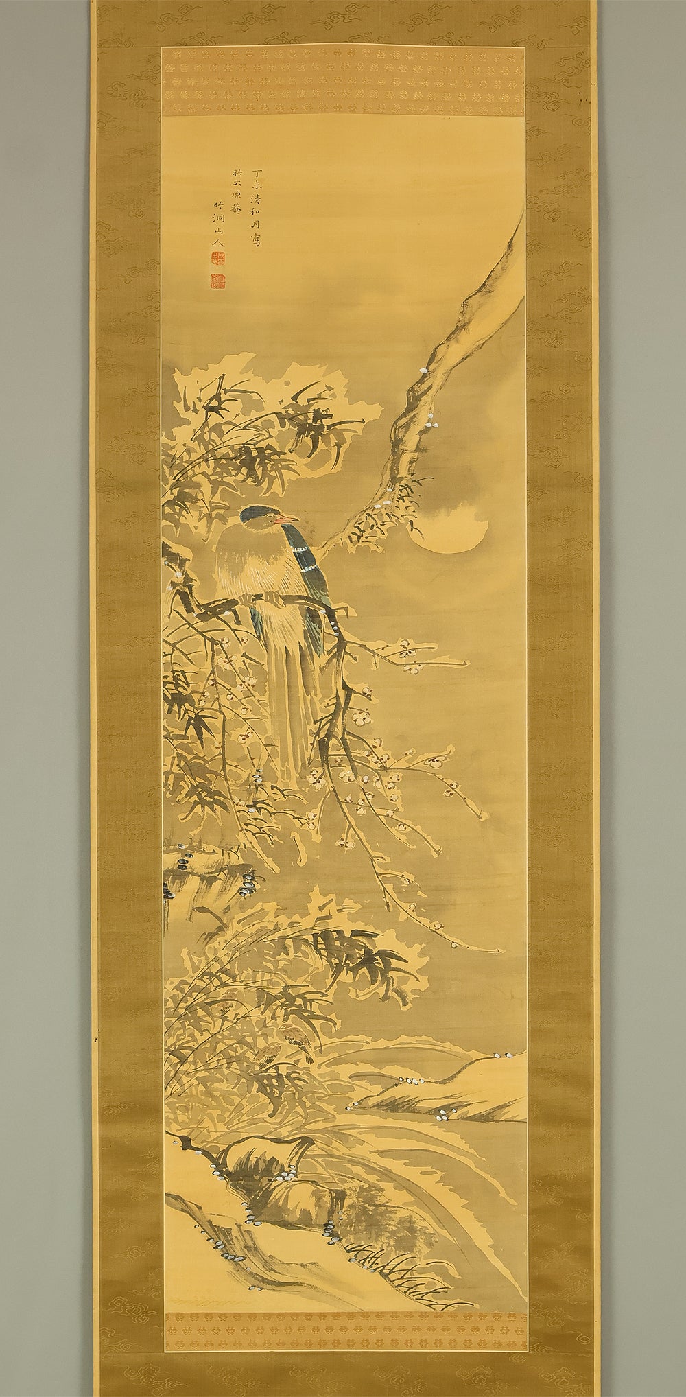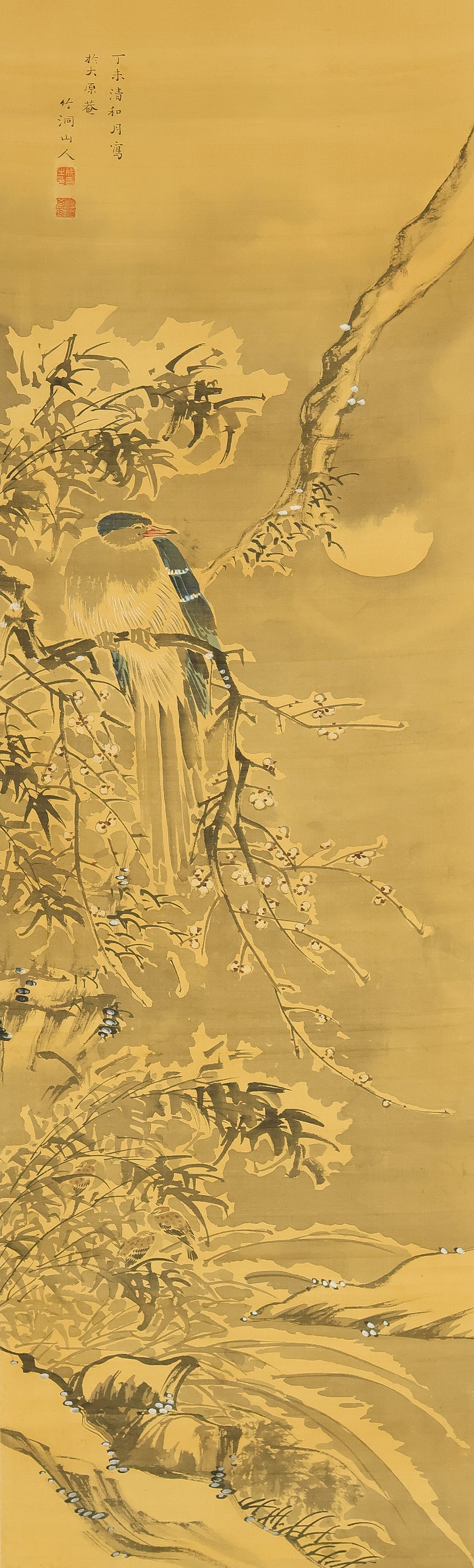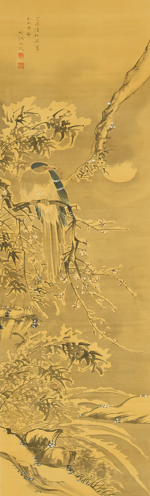 中林竹洞 Nakabayashi Chikuto (1776-1853) Japanese art kakejiku kakemono wall hanging scroll / Long Tailed Bird in Moonlight with Appraised Box RE138
