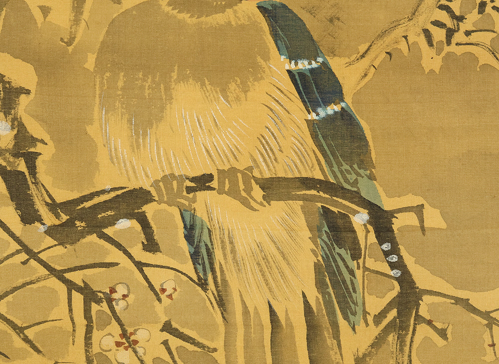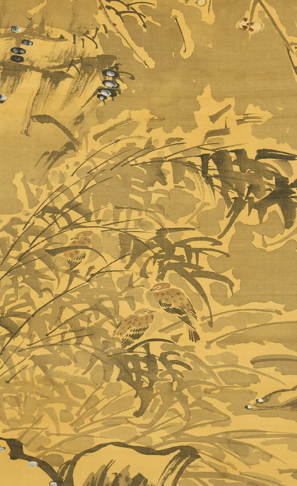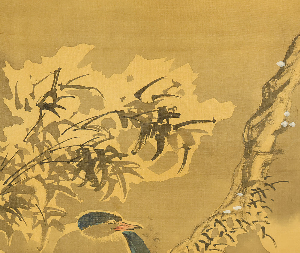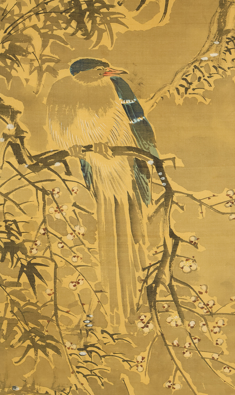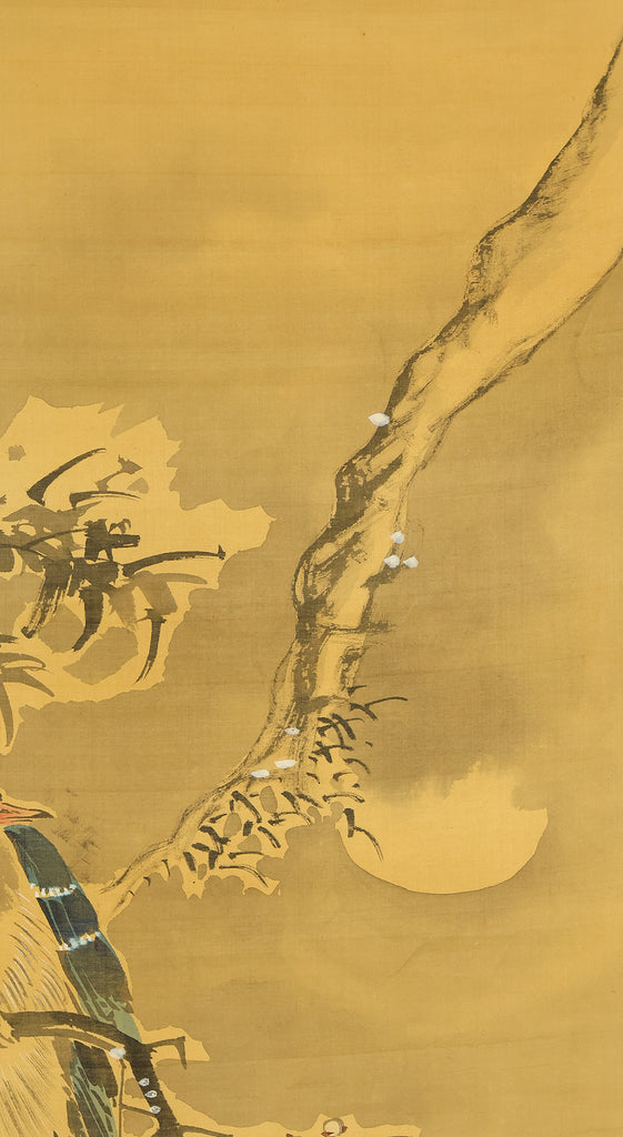 A poetic hanging scroll by Nakabayashi Chikuto, a leading Nanga painter and theoretician of the late Edo period. Dated April 1847 (丁未清和月), the composition features a long-tailed bird perched quietly beneath the moonlight, surrounded by delicate foliage. The scene evokes solitude and elegance, hallmarks of Chikuto’s literati style. Born in Nagoya and trained under Yamada Kyūjo, Chikuto later moved to Kyoto with fellow painter Yamamoto Baiitsu, where he deepened his studies in Confucian and Japanese thought. Signed Chikuto Sanjin (竹洞山人) and sealed Narimasa no in (成昌之印) and Chikuto Sanjin (竹洞山人), the scroll is accompanied by an appraised box inscribed and signed by Untei Senshi (雲亭仙史), adding provenance and scholarly recognition. A refined and contemplative work, ideal for collectors of Edo-period literati painting.