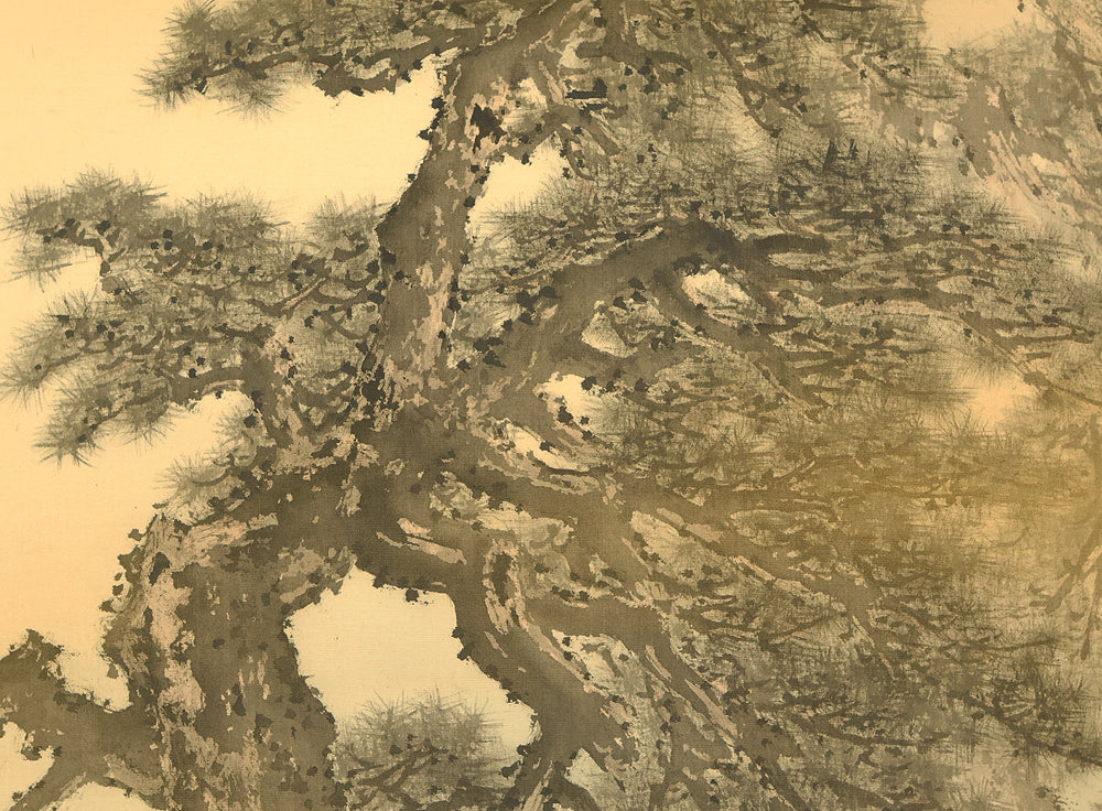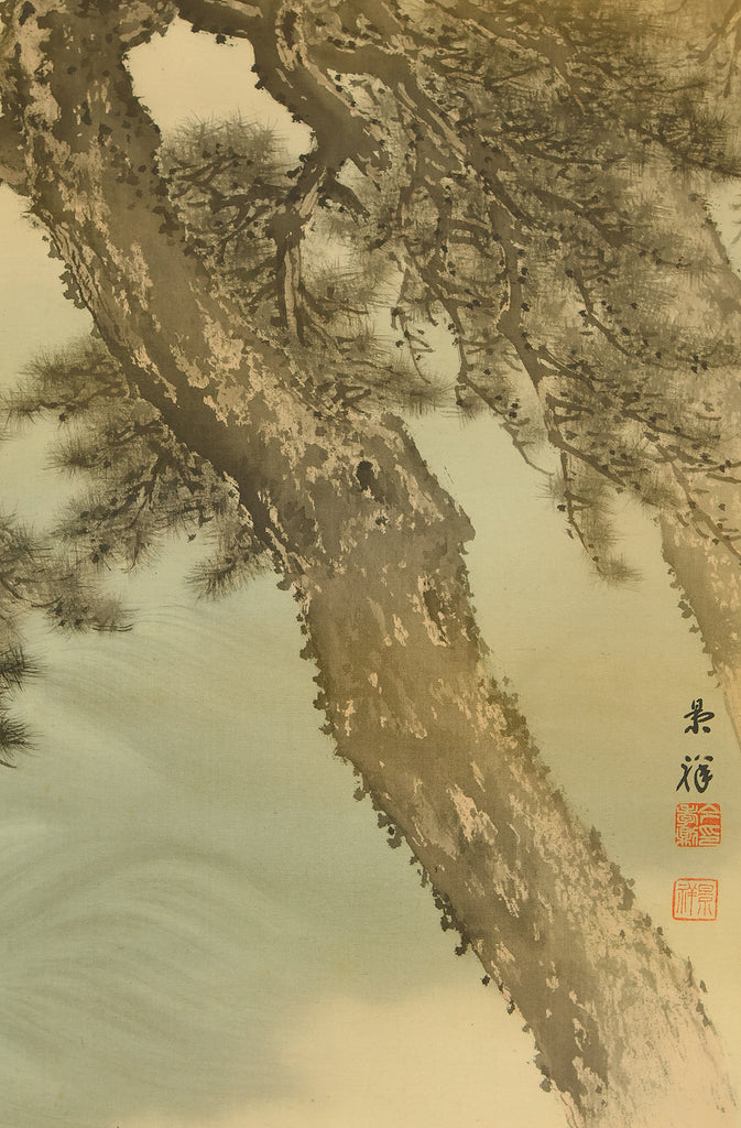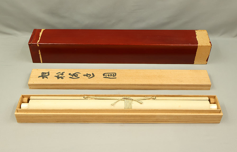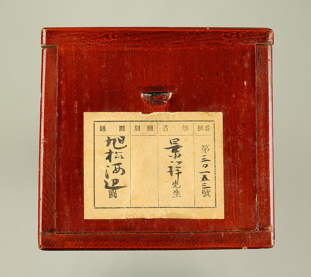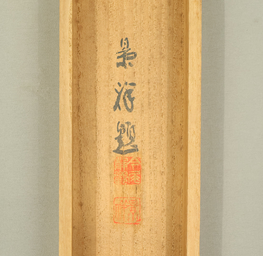 A dignified hanging scroll by Imao Keishō, adopted son and artistic heir of Imao Keinen, a master of the Maruyama–Shijō school. The painting features a majestic pine tree silhouetted against a vivid rising sun, rendered in elegant brushwork and soft atmospheric tones. This composition evokes themes of renewal, longevity, and imperial grace—motifs often associated with auspicious occasions and seasonal transitions. Signed Keishō (景祥) and sealed Takanori ima in (孝則 今印) and Keishō (景祥), the work reflects Keishō’s inherited style and personal refinement. Though he remained outside formal art institutions, Keishō held solo exhibitions and was honored with presentations to the Imperial Household. Preserved in its original double-layered wooden box (niju tomobako), this scroll offers both aesthetic serenity and historical resonance, ideal for collectors of 20th-century Nihonga and lineage-based Kyoto painting.