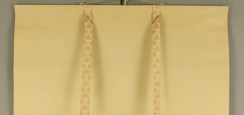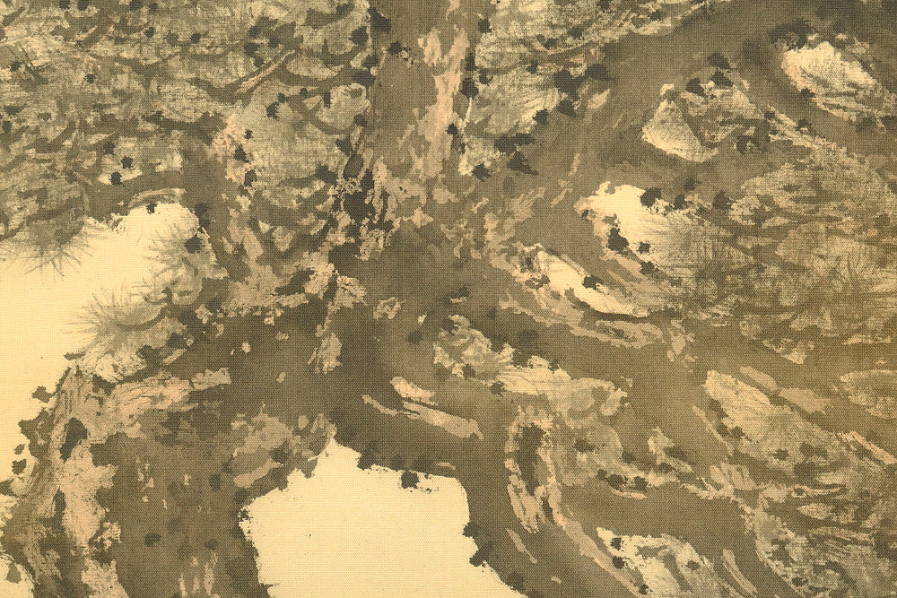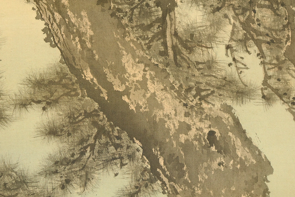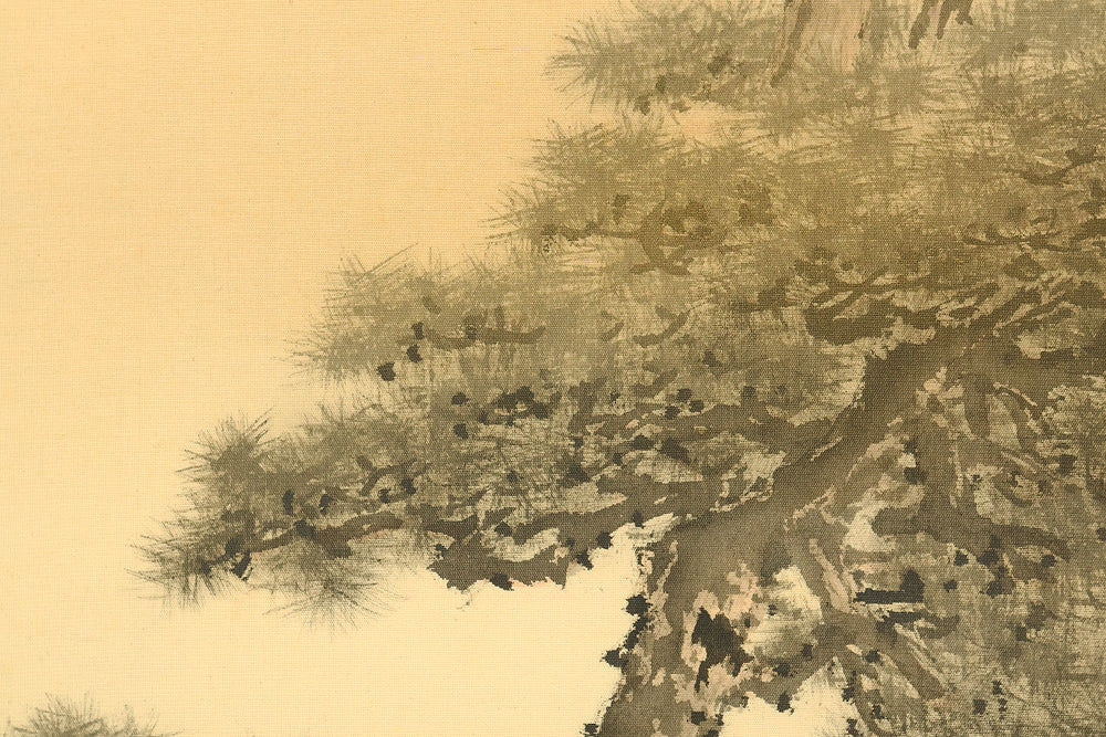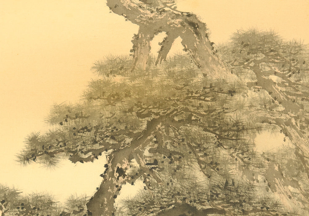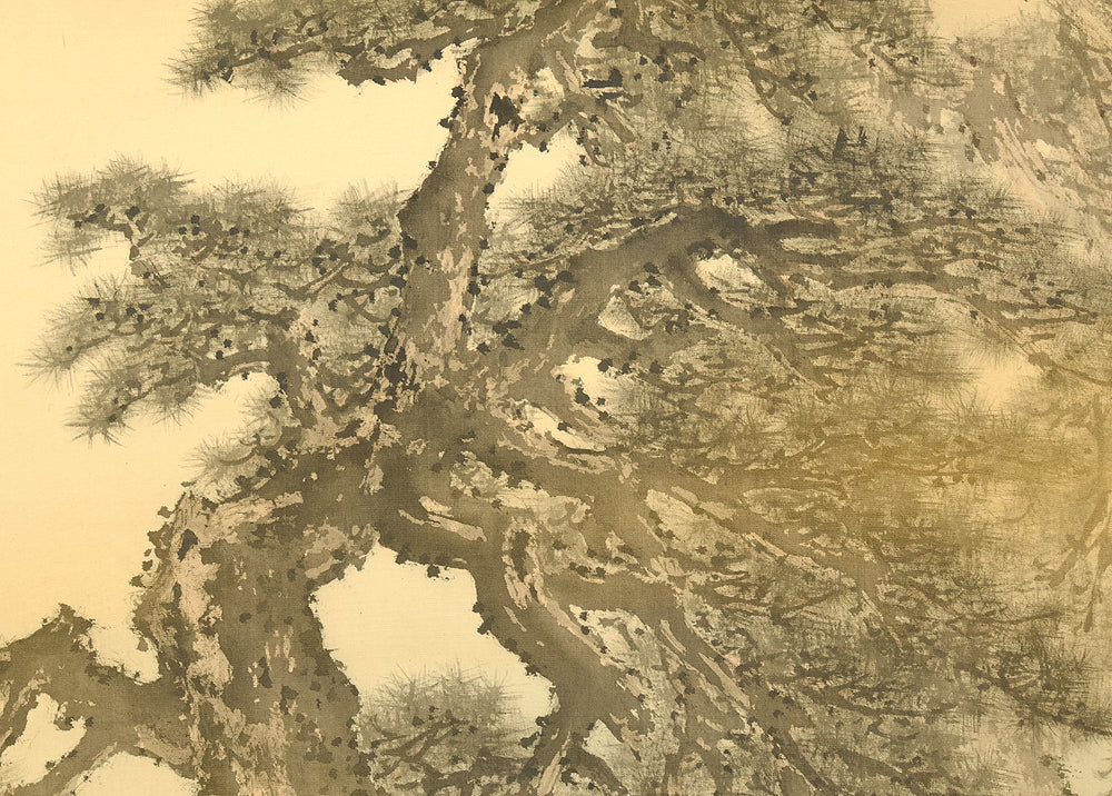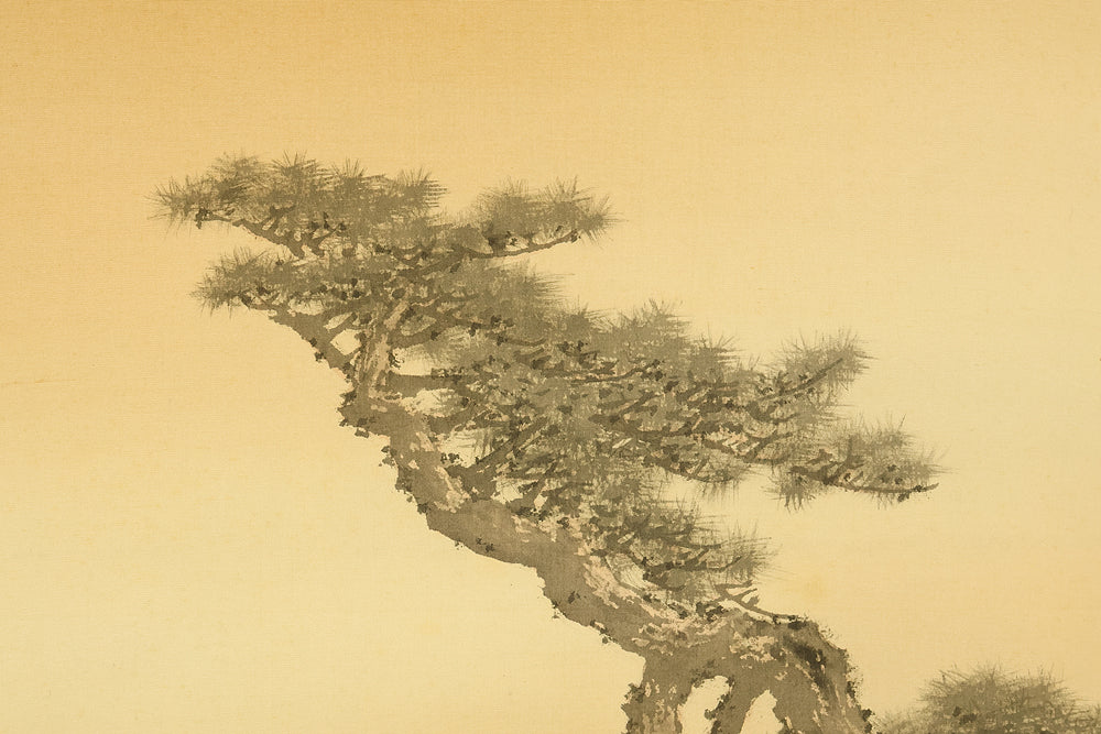 A dignified hanging scroll by Imao Keishō, adopted son and artistic heir of Imao Keinen, a master of the Maruyama–Shijō school. The painting features a majestic pine tree silhouetted against a vivid rising sun, rendered in elegant brushwork and soft atmospheric tones. This composition evokes themes of renewal, longevity, and imperial grace—motifs often associated with auspicious occasions and seasonal transitions. Signed Keishō (景祥) and sealed Takanori ima in (孝則 今印) and Keishō (景祥), the work reflects Keishō’s inherited style and personal refinement. Though he remained outside formal art institutions, Keishō held solo exhibitions and was honored with presentations to the Imperial Household. Preserved in its original double-layered wooden box (niju tomobako), this scroll offers both aesthetic serenity and historical resonance, ideal for collectors of 20th-century Nihonga and lineage-based Kyoto painting.