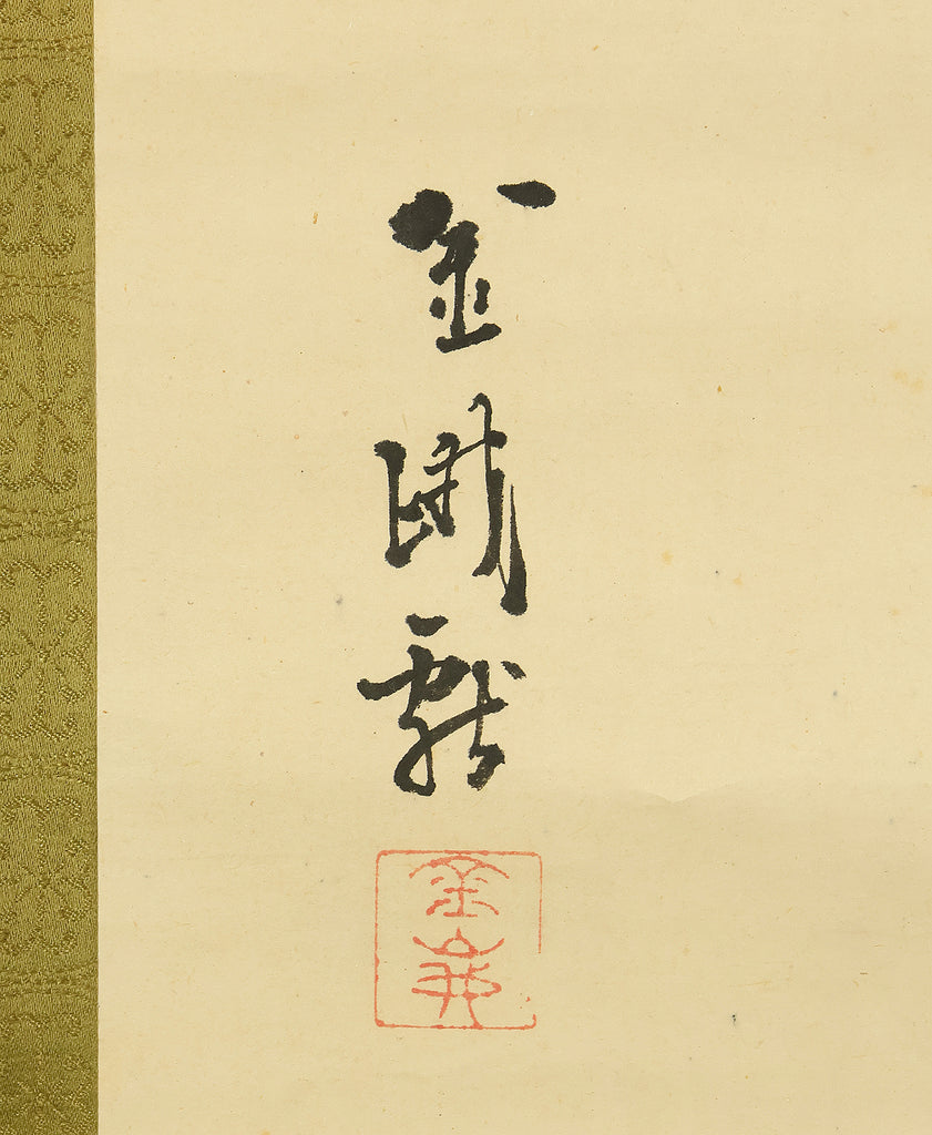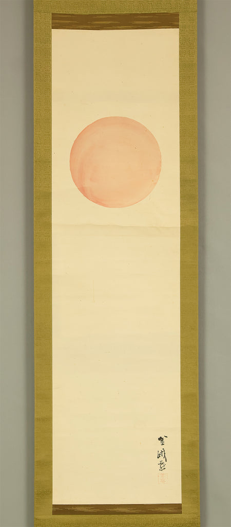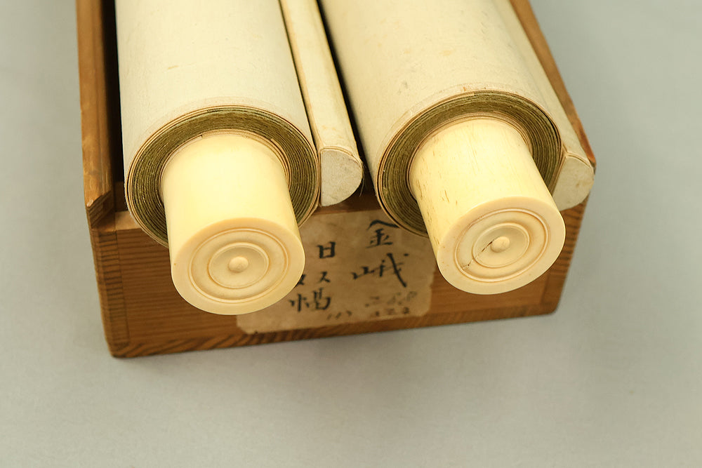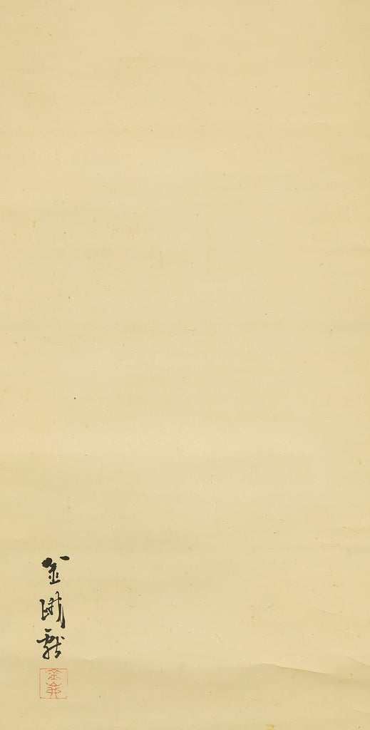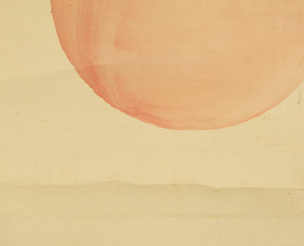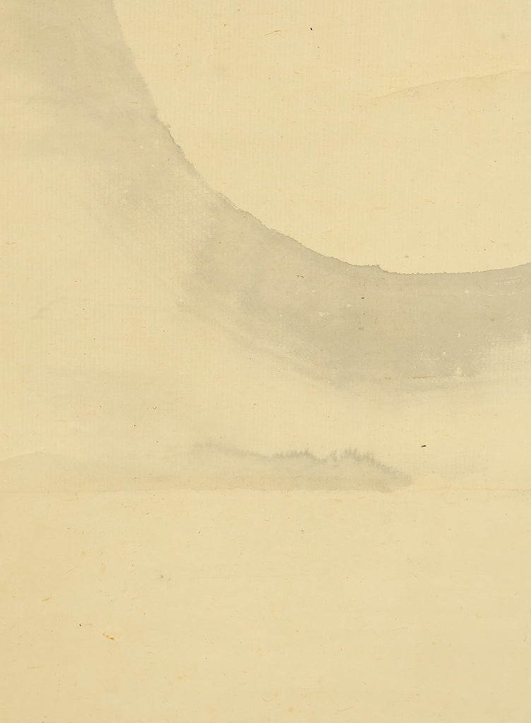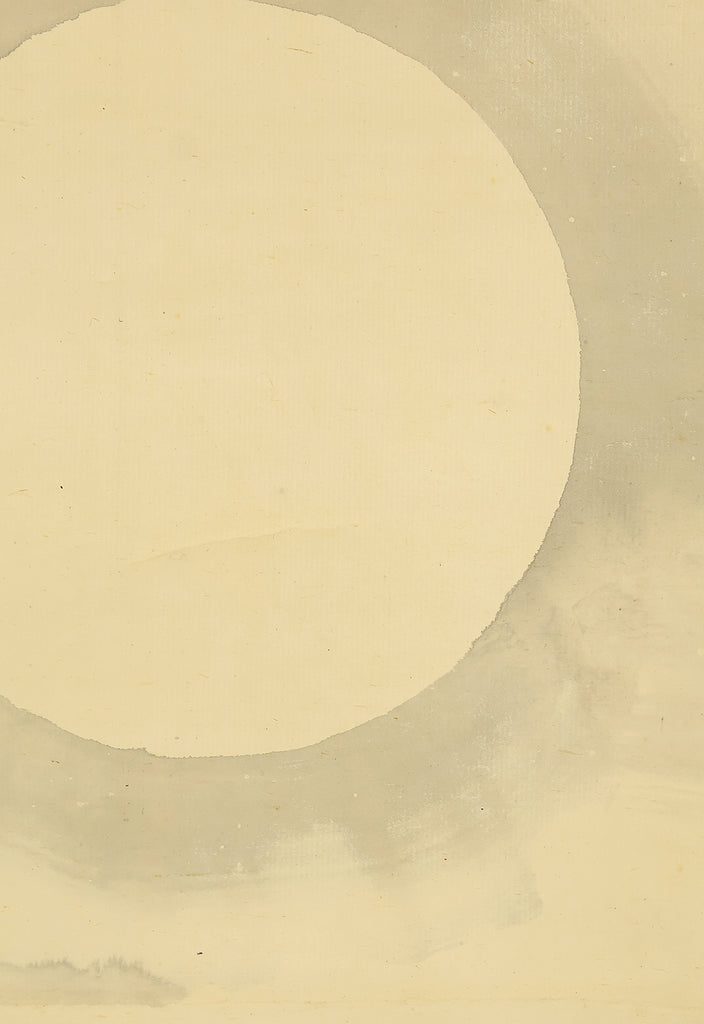 This elegant pair of hanging scrolls presents a refined dialogue between the rising sun and the moon, rendered with remarkable restraint and sensitivity by Furuichi Kinga, whose mature style favors atmosphere and balance over overt narrative. Each scroll is devoted to a single celestial presence, suspended in a vast, softly toned expanse that emphasizes stillness and temporal rhythm rather than physical landscape, allowing the viewer to experience dawn and night as complementary states rather than opposites. The subtle gradations of pigment and the generous use of empty space reflect Kinga’s absorption of both Shijō naturalism and later Nanga sensibilities, where suggestion carries more weight than description. When displayed together, the pair creates a quiet cyclical movement—day yielding to night, night returning to day—embodying harmony, continuity, and contemplative calm. The work is accompanied by a fitted storage box, ensuring proper preservation, while the restrained composition and measured brushwork reveal an artist deeply attuned to poetic abstraction and the passage of time.