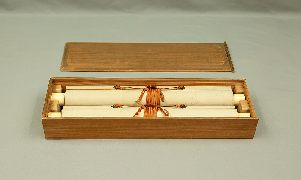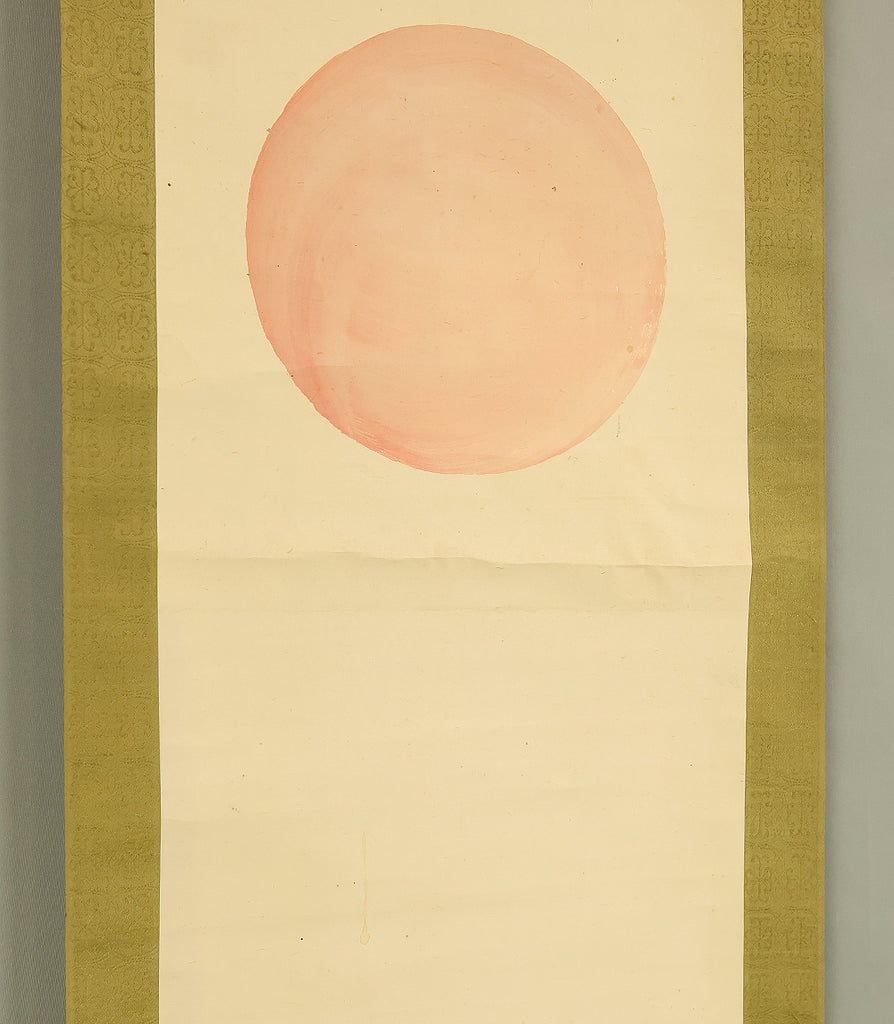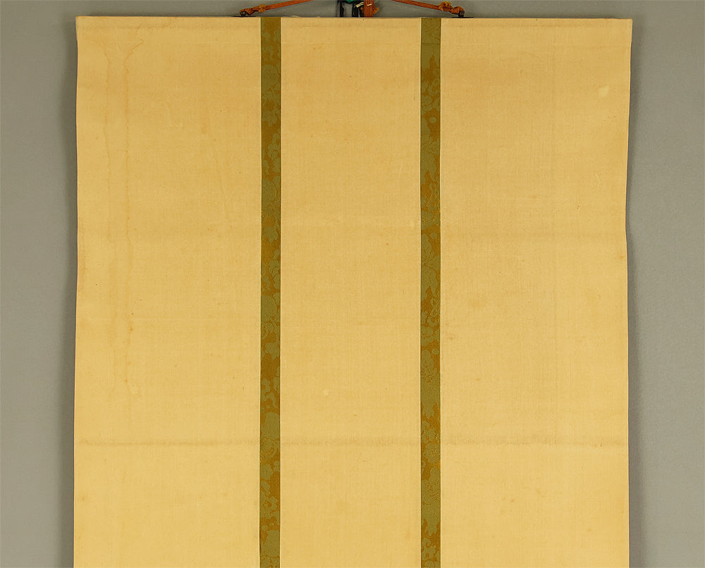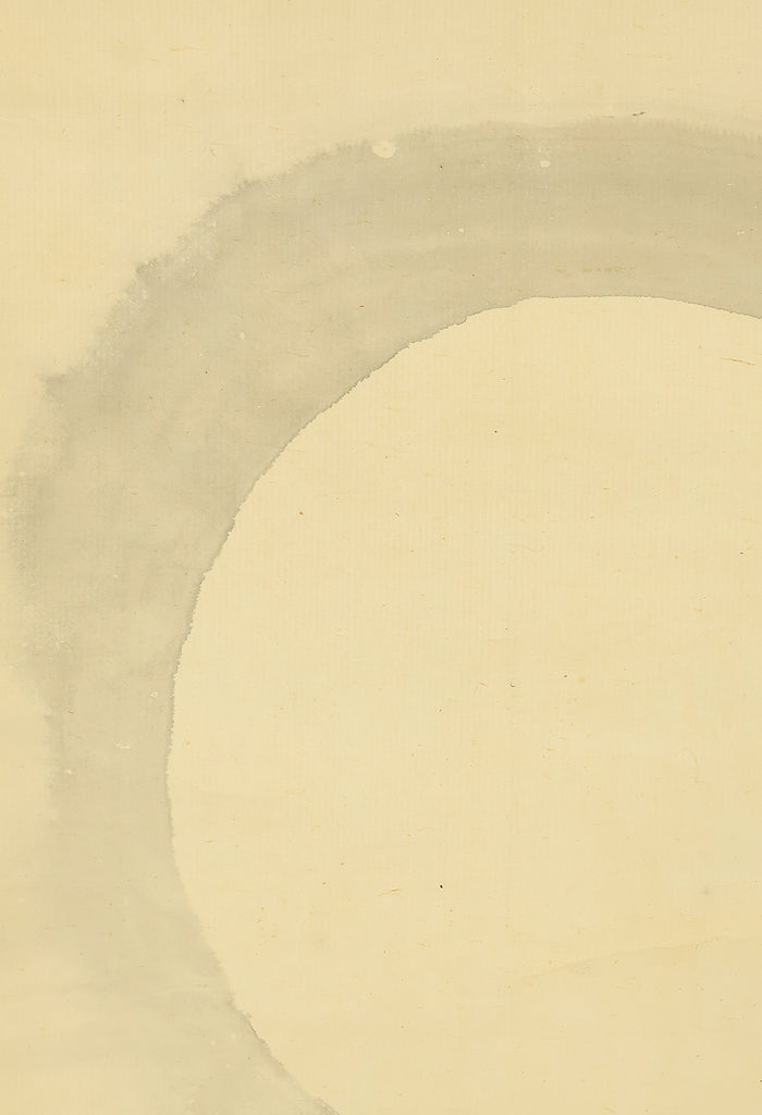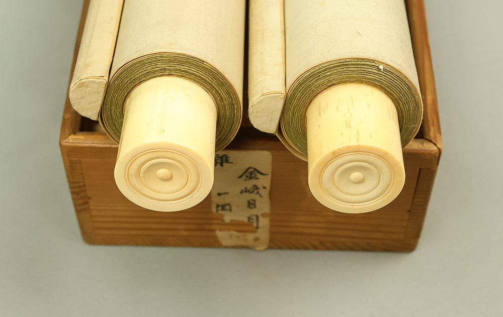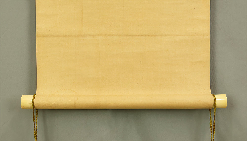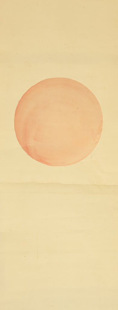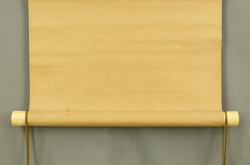 This elegant pair of hanging scrolls presents a refined dialogue between the rising sun and the moon, rendered with remarkable restraint and sensitivity by Furuichi Kinga, whose mature style favors atmosphere and balance over overt narrative. Each scroll is devoted to a single celestial presence, suspended in a vast, softly toned expanse that emphasizes stillness and temporal rhythm rather than physical landscape, allowing the viewer to experience dawn and night as complementary states rather than opposites. The subtle gradations of pigment and the generous use of empty space reflect Kinga’s absorption of both Shijō naturalism and later Nanga sensibilities, where suggestion carries more weight than description. When displayed together, the pair creates a quiet cyclical movement—day yielding to night, night returning to day—embodying harmony, continuity, and contemplative calm. The work is accompanied by a fitted storage box, ensuring proper preservation, while the restrained composition and measured brushwork reveal an artist deeply attuned to poetic abstraction and the passage of time.