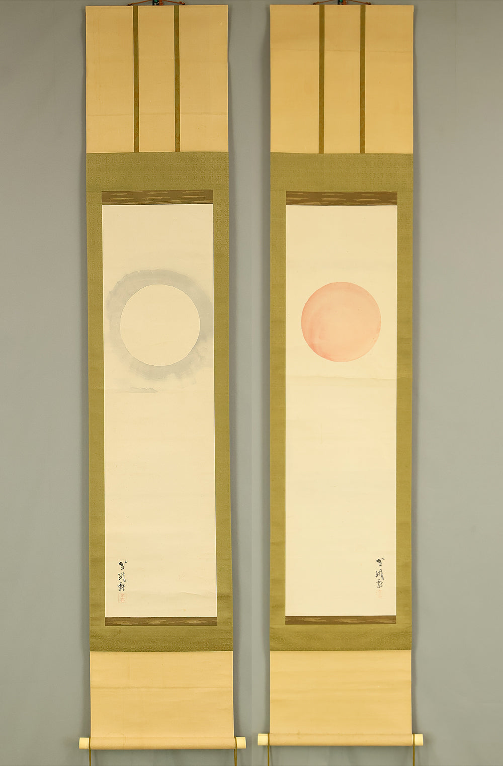 古市金峨 Furuichi Kinga (1805-1880) Japanese art Paired kakejiku kakemono wall hanging scrolls / Rising Sun and Moon with Box RE398