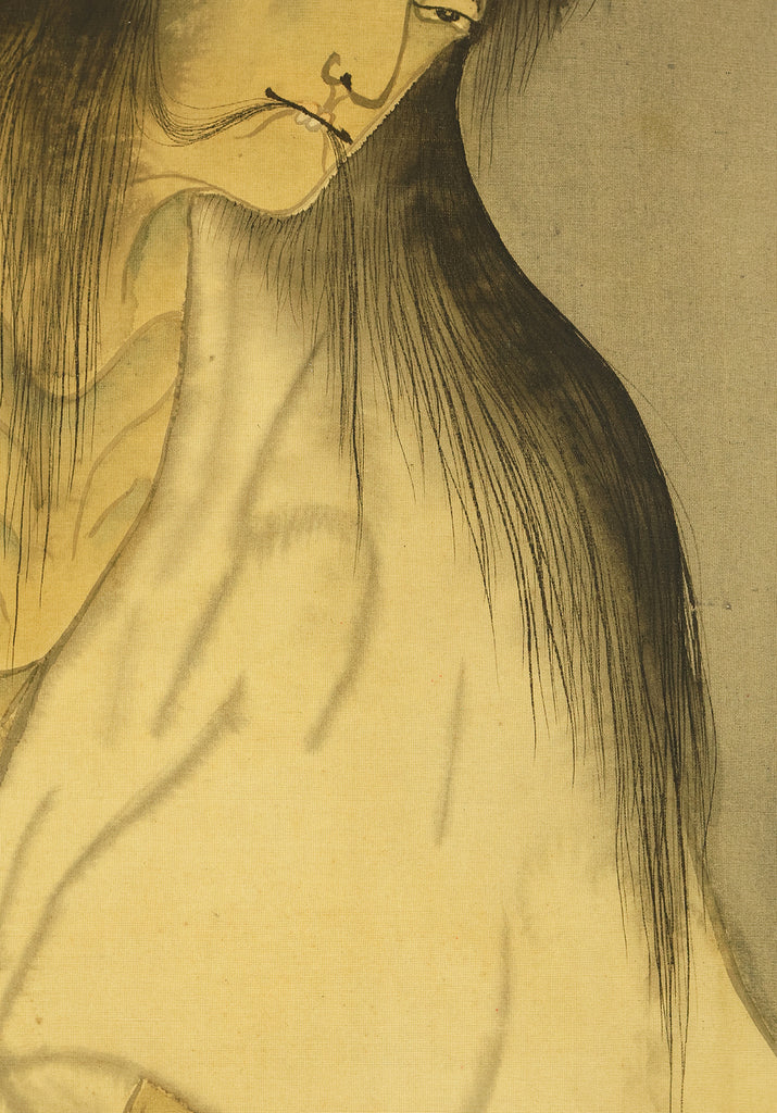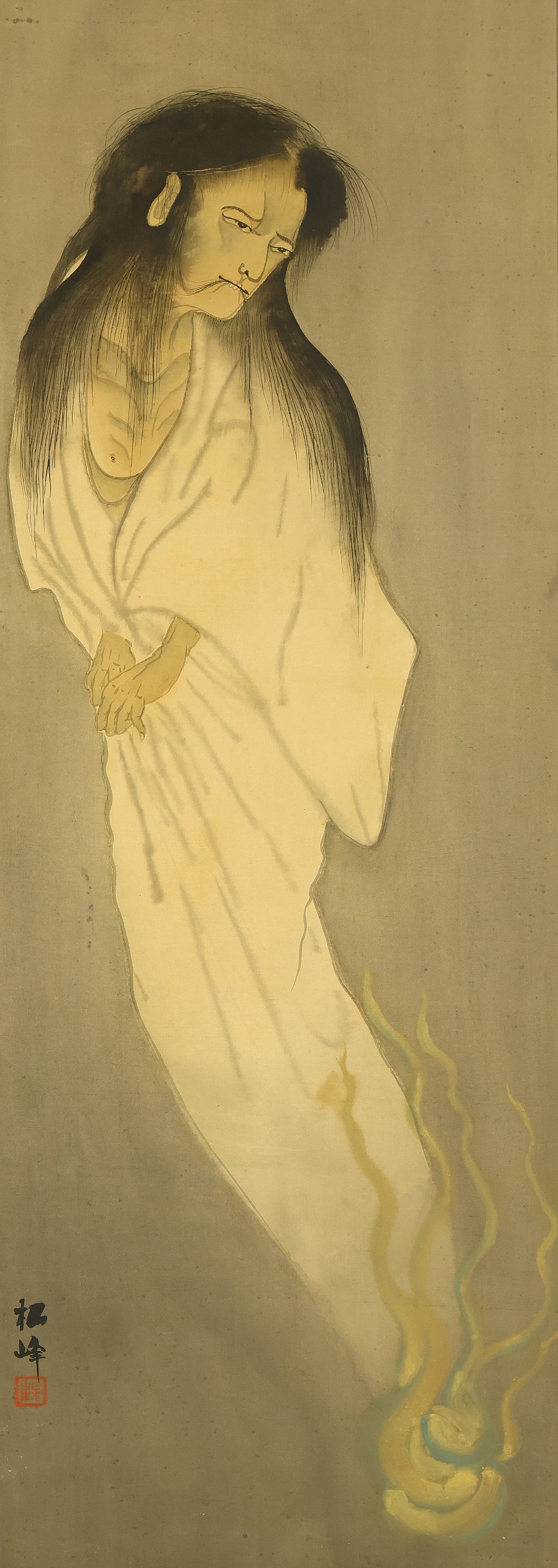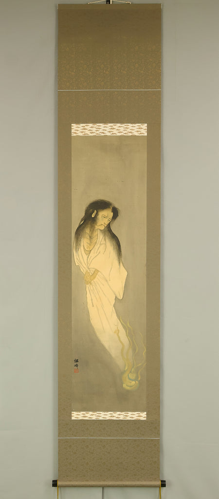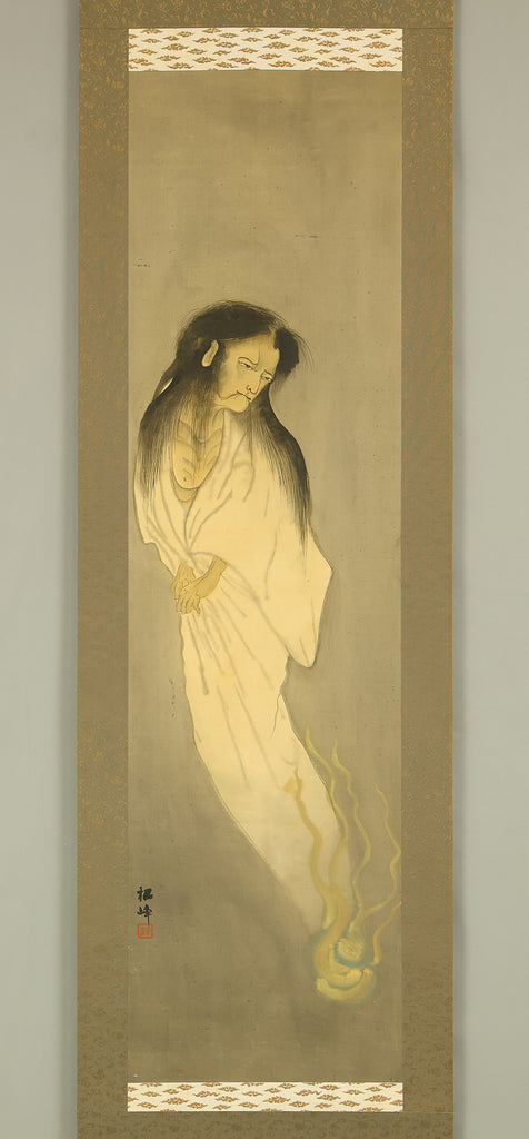 This rare Japanese hanging scroll (kakejiku) features a ghostly female figure (yūrei), depicted in the classical style with flowing black hair, a white kimono, and no visible feet—hallmarks of traditional ghost paintings from the Edo period. Signed and sealed by the artist Shoho (松峰), the work reflects the aesthetics and symbolism of supernatural art in Japanese folklore. Such ghost paintings (yūrei-ga) were created not only to evoke fear, but also to honor spirits, offer spiritual protection, and reflect on impermanence and human emotion. They gained popularity in the 18th and 19th centuries, with artists like Maruyama Ōkyo, Katsushika Hokusai, and Tsukioka Yoshitoshi contributing to the genre. These scrolls were sometimes used in rituals, rain invocation, or as moral reminders—making them both artistic and spiritual artifacts. The delicate brushwork and ethereal composition in this scroll suggest a reverence for the unseen world, making it a compelling piece for collectors of Japanese folklore and supernatural art. The scroll is accompanied by a wooden storage box, which helps protect the work and enhances its value as a preserved piece of traditional Japanese art.