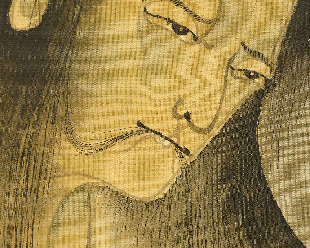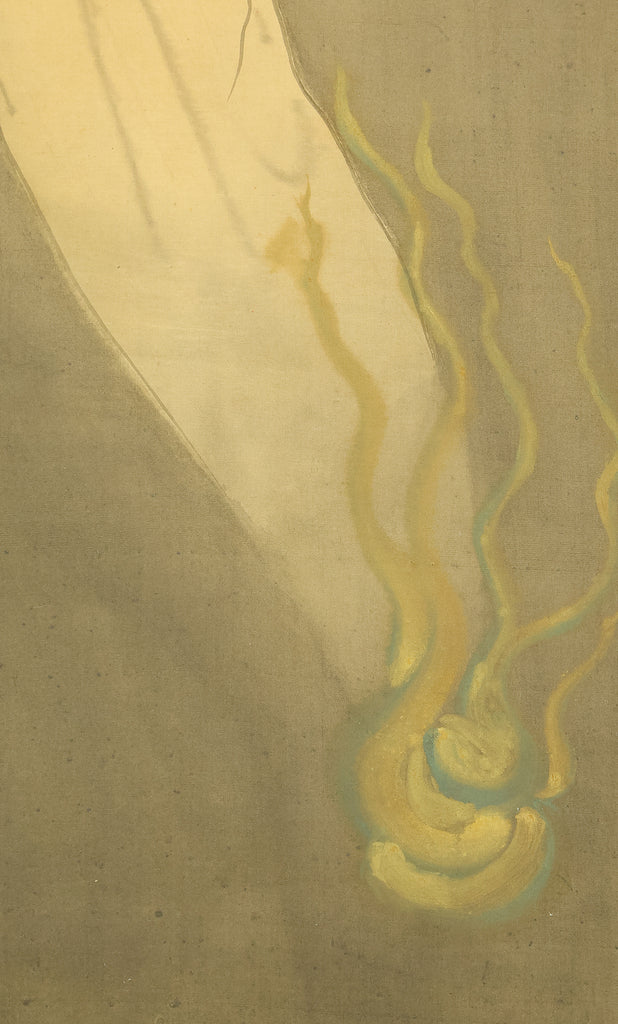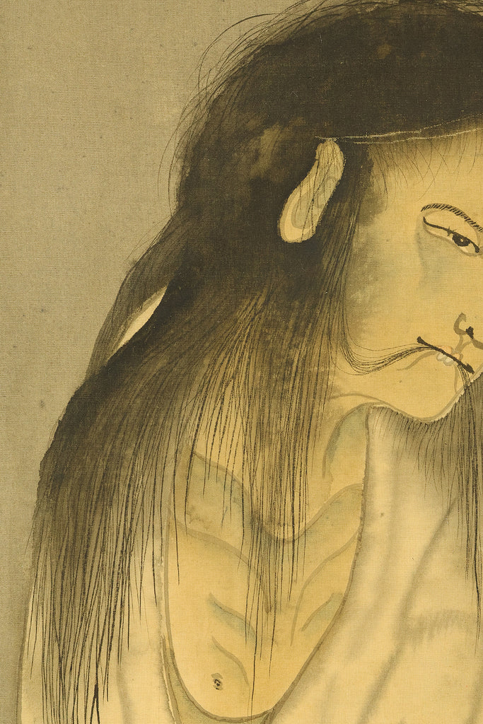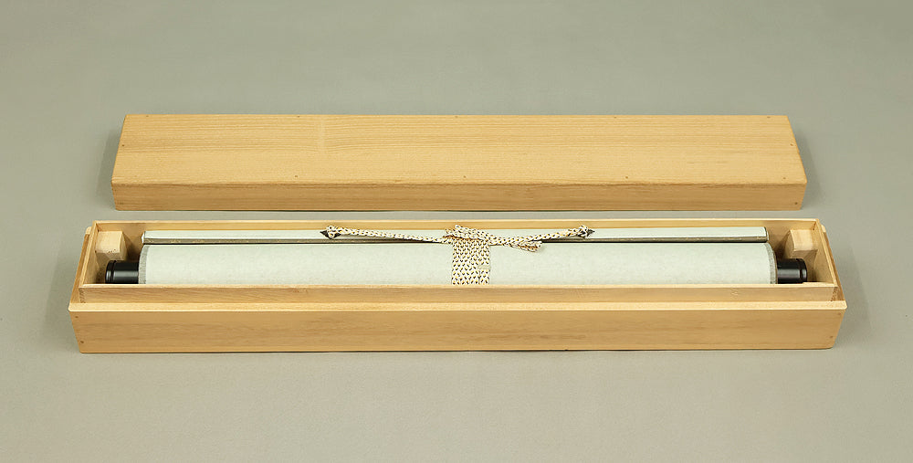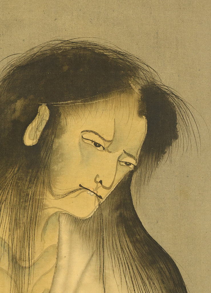 This rare Japanese hanging scroll (kakejiku) features a ghostly female figure (yūrei), depicted in the classical style with flowing black hair, a white kimono, and no visible feet—hallmarks of traditional ghost paintings from the Edo period. Signed and sealed by the artist Shoho (松峰), the work reflects the aesthetics and symbolism of supernatural art in Japanese folklore. Such ghost paintings (yūrei-ga) were created not only to evoke fear, but also to honor spirits, offer spiritual protection, and reflect on impermanence and human emotion. They gained popularity in the 18th and 19th centuries, with artists like Maruyama Ōkyo, Katsushika Hokusai, and Tsukioka Yoshitoshi contributing to the genre. These scrolls were sometimes used in rituals, rain invocation, or as moral reminders—making them both artistic and spiritual artifacts. The delicate brushwork and ethereal composition in this scroll suggest a reverence for the unseen world, making it a compelling piece for collectors of Japanese folklore and supernatural art. The scroll is accompanied by a wooden storage box, which helps protect the work and enhances its value as a preserved piece of traditional Japanese art.