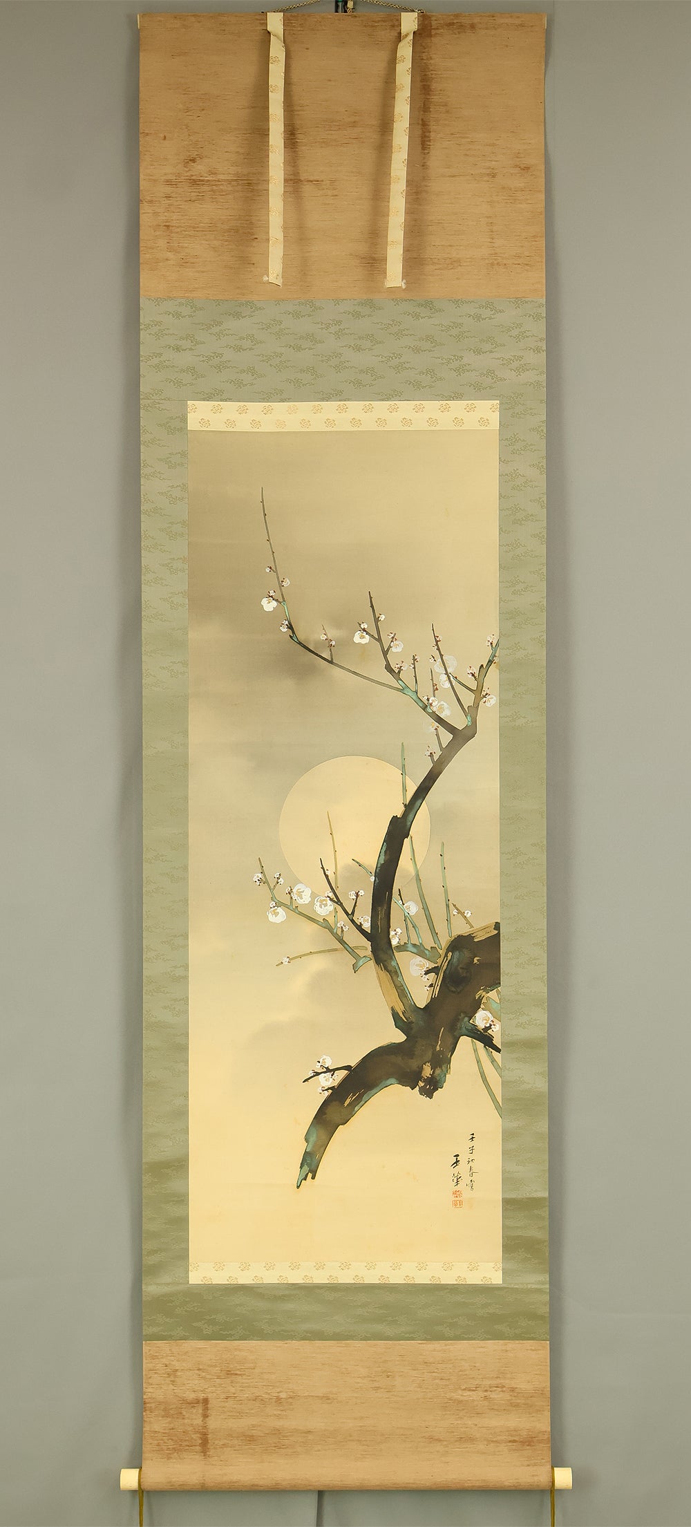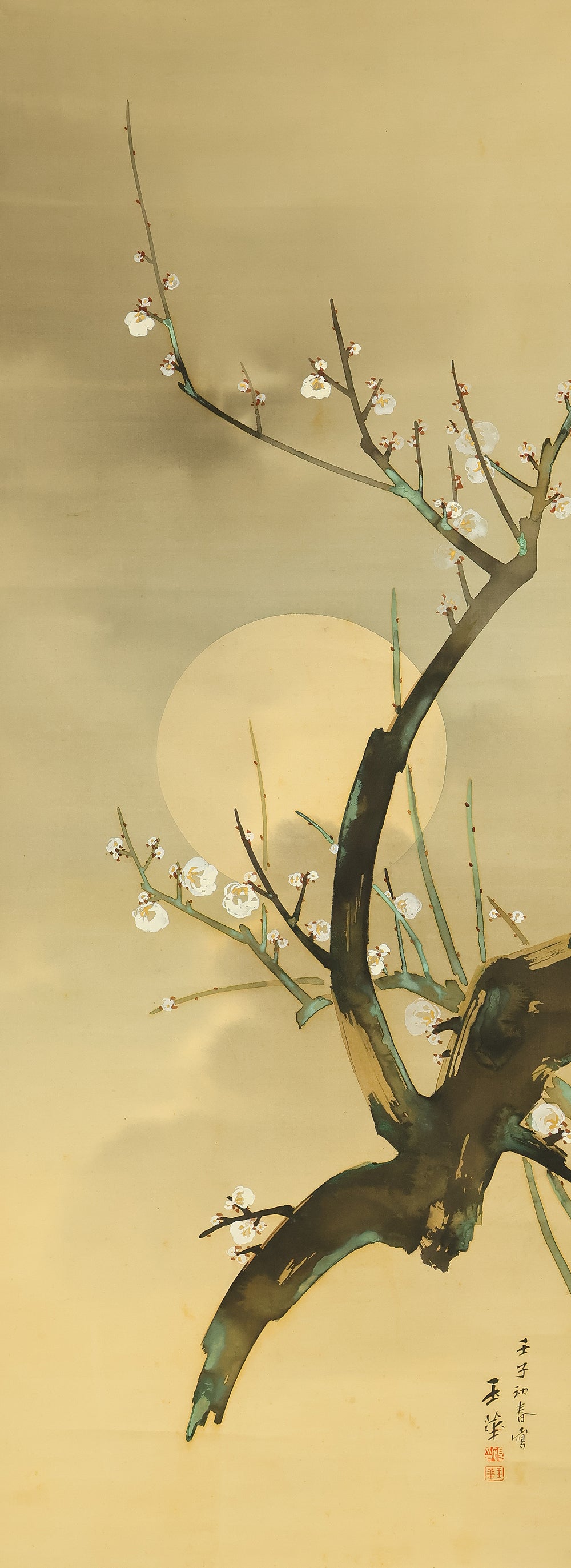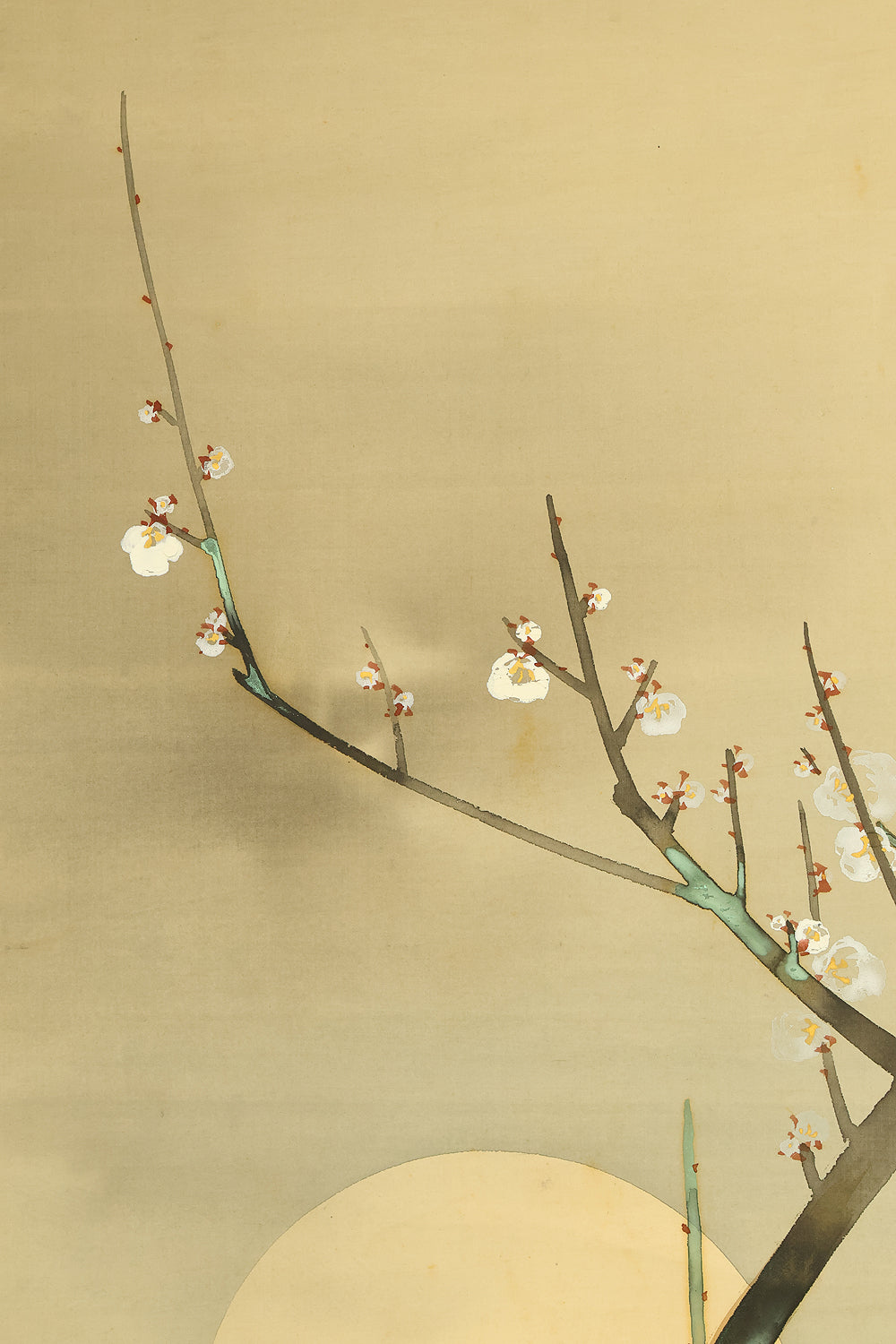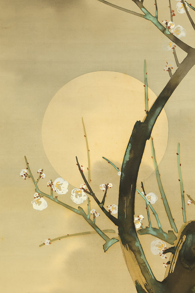 A quiet branch of white plum emerges beneath the soft glow of a full moon in this early‑spring work by Tabira Gyokka (1878–1923), a Shimane‑born painter trained under Kawabata Gyokushō. The blossoms open with a gentle clarity, each petal shaped by Gyokka’s precise yet unforced brushwork, while the pale circular moon behind them creates a depth that feels serene and quietly luminous. The slender branch arcs lightly across the surface, giving the composition a sense of breath and early‑spring freshness, as if the air itself were beginning to warm. Signed “Gyokka” with his seals and dated to the first spring of 1912, the painting reflects the refined sensitivity that defined his short but graceful career. Accompanied by its box, the scroll brings a subtle shift to the atmosphere of a room: its calm interplay of moonlight and plum blossoms introduces a sense of renewal and clarity, encouraging a slower rhythm and a more centered state of mind. Over time, it becomes less a seasonal image and more a quiet reminder of beginnings, resilience, and the gentle optimism that rises when one pauses long enough to notice it.