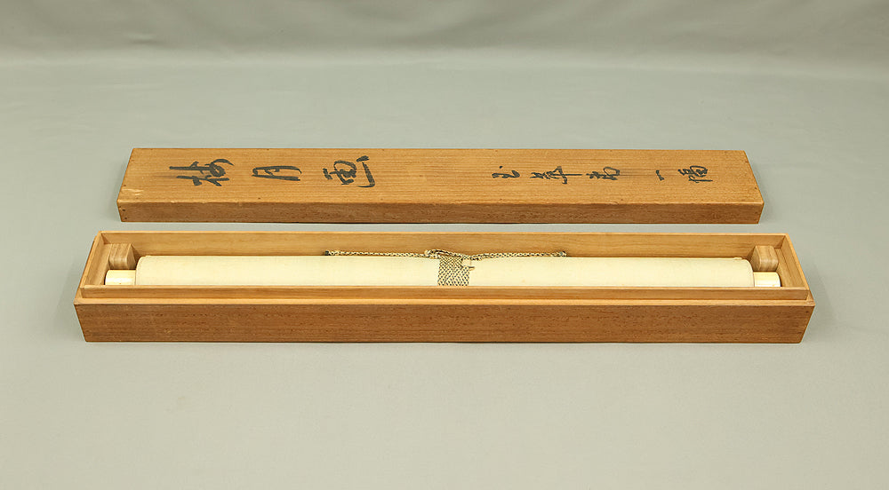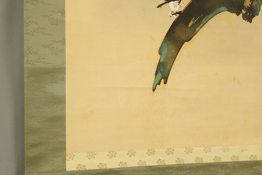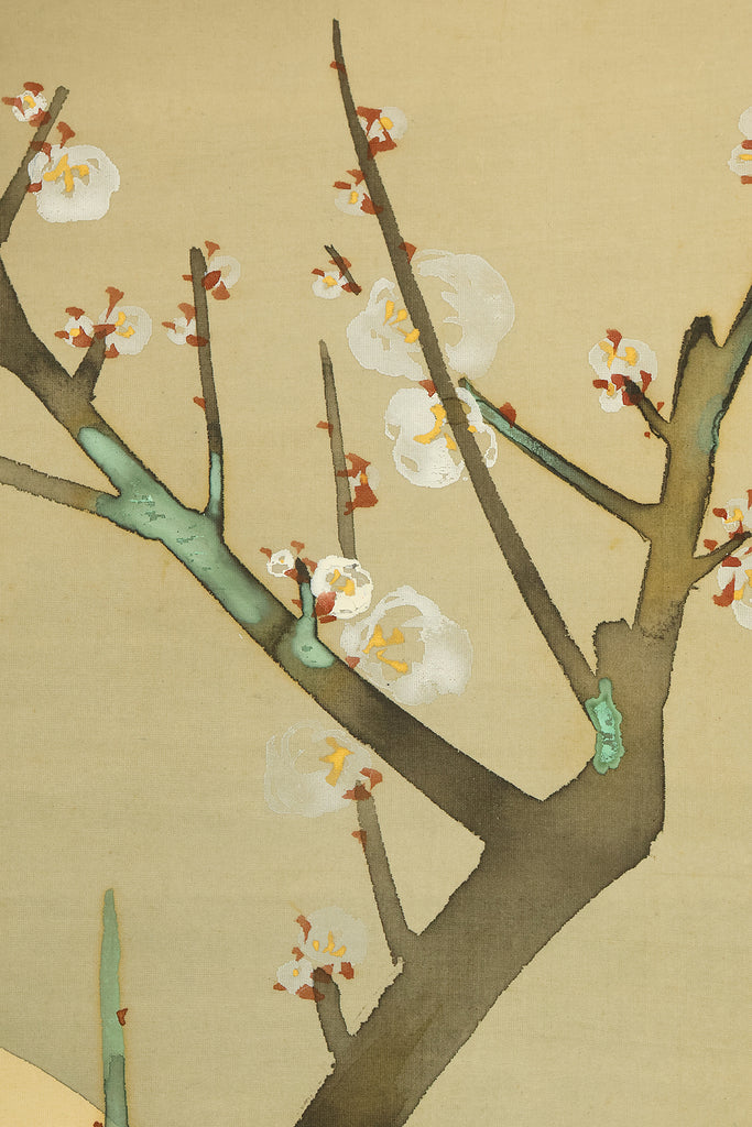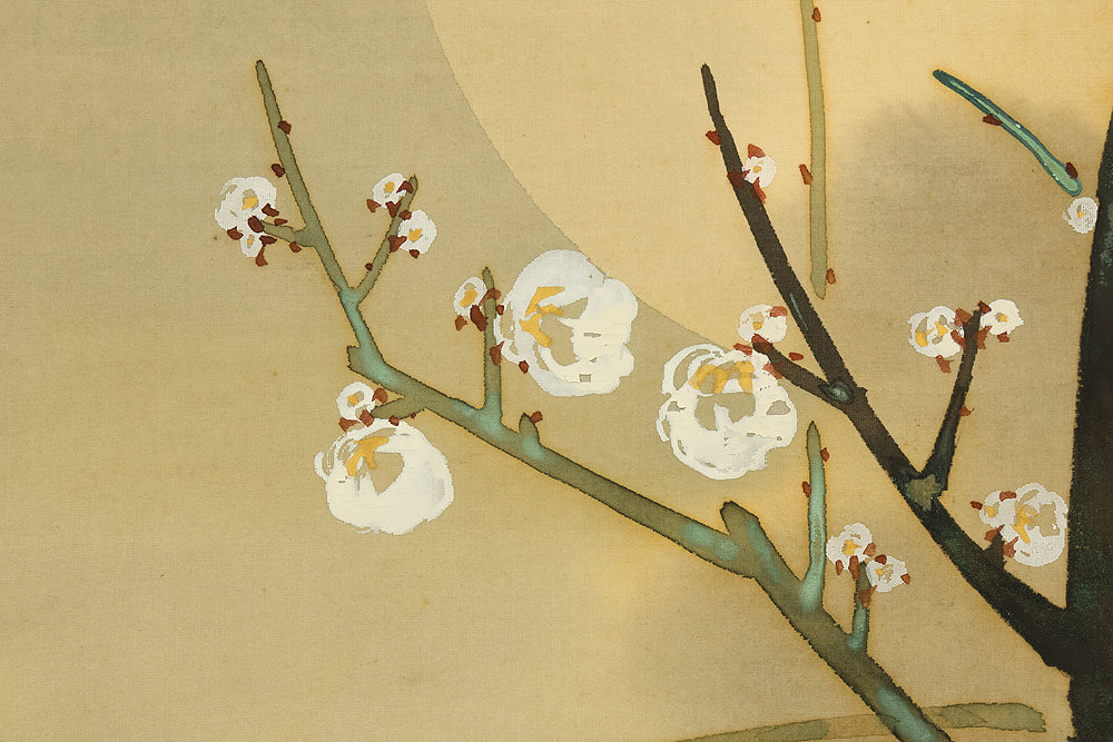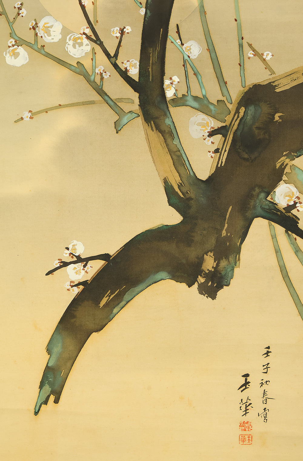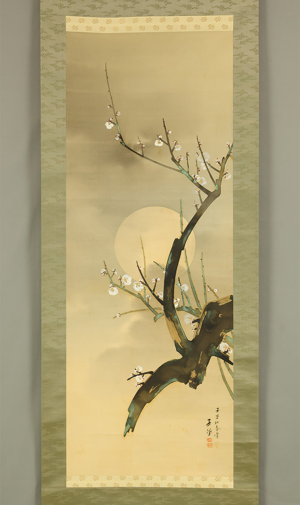 A quiet branch of white plum emerges beneath the soft glow of a full moon in this early‑spring work by Tabira Gyokka (1878–1923), a Shimane‑born painter trained under Kawabata Gyokushō. The blossoms open with a gentle clarity, each petal shaped by Gyokka’s precise yet unforced brushwork, while the pale circular moon behind them creates a depth that feels serene and quietly luminous. The slender branch arcs lightly across the surface, giving the composition a sense of breath and early‑spring freshness, as if the air itself were beginning to warm. Signed “Gyokka” with his seals and dated to the first spring of 1912, the painting reflects the refined sensitivity that defined his short but graceful career. Accompanied by its box, the scroll brings a subtle shift to the atmosphere of a room: its calm interplay of moonlight and plum blossoms introduces a sense of renewal and clarity, encouraging a slower rhythm and a more centered state of mind. Over time, it becomes less a seasonal image and more a quiet reminder of beginnings, resilience, and the gentle optimism that rises when one pauses long enough to notice it.