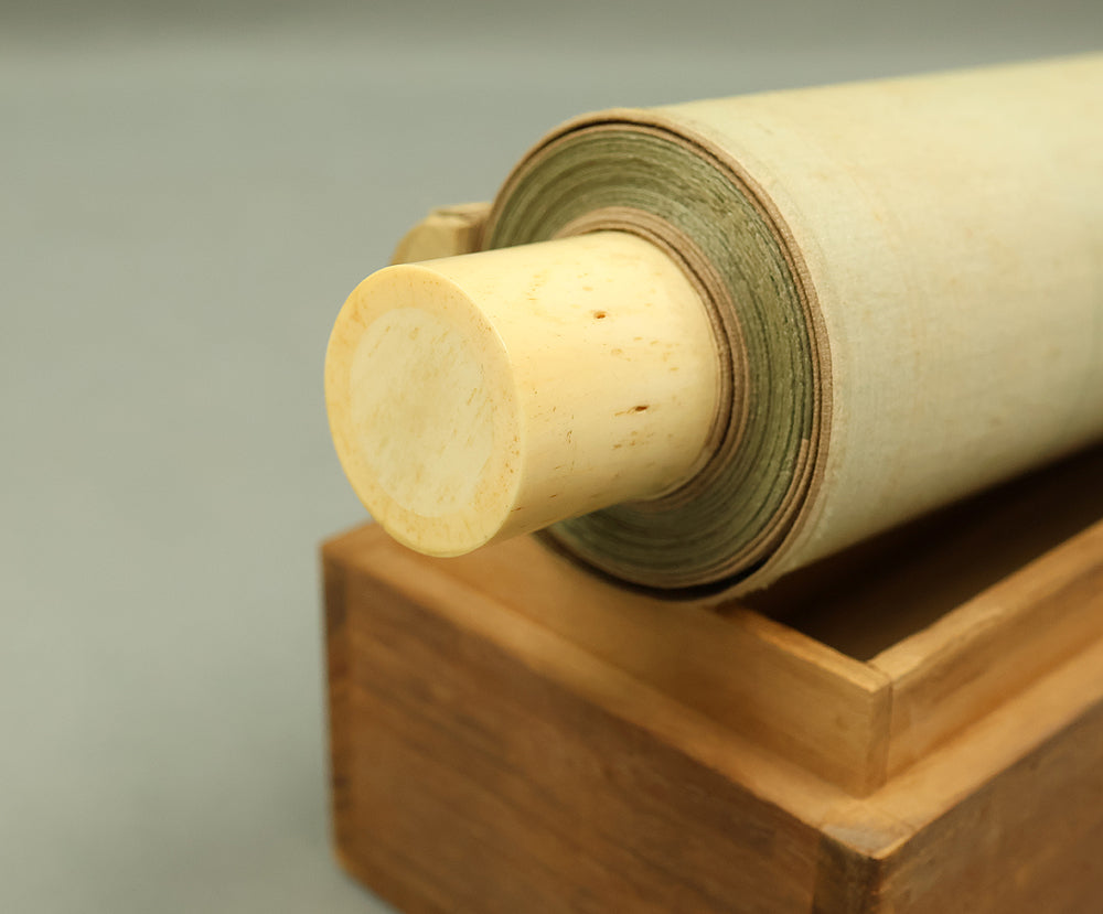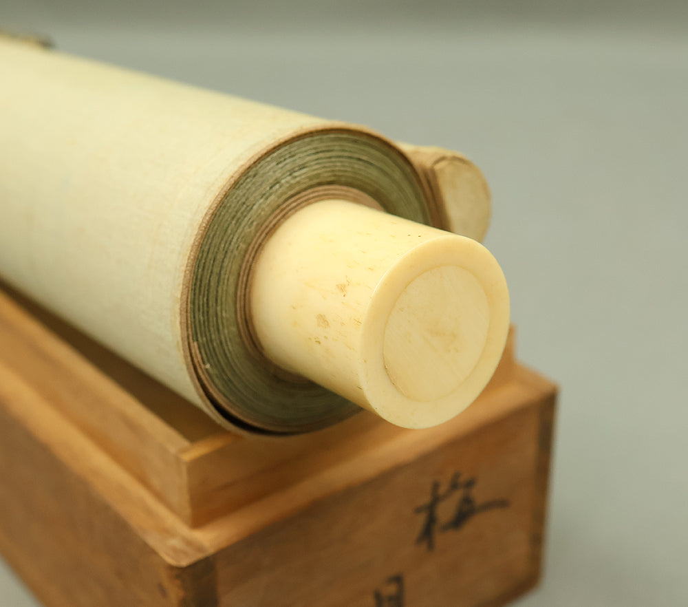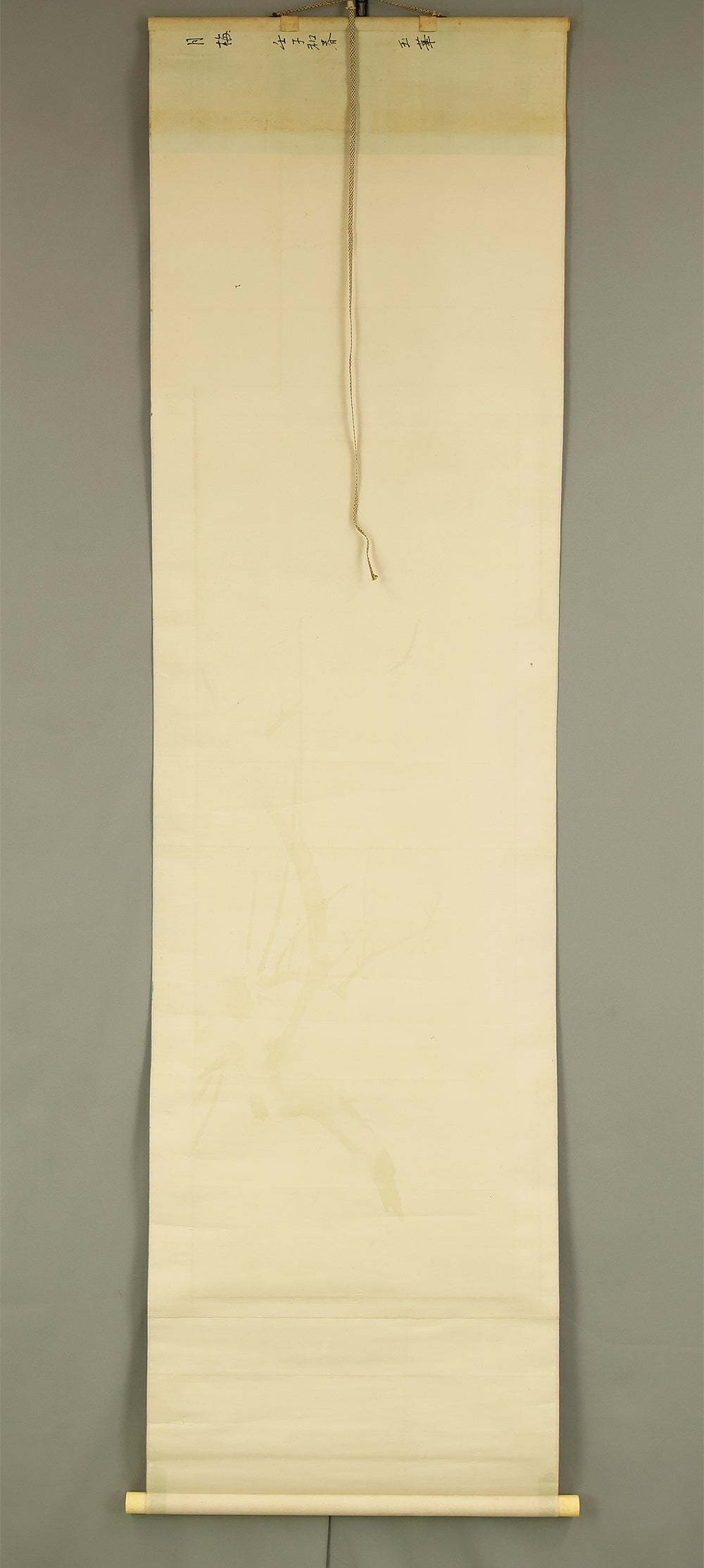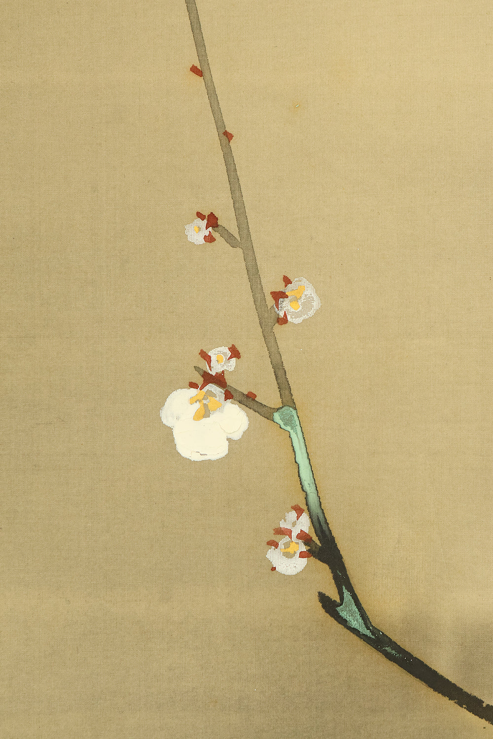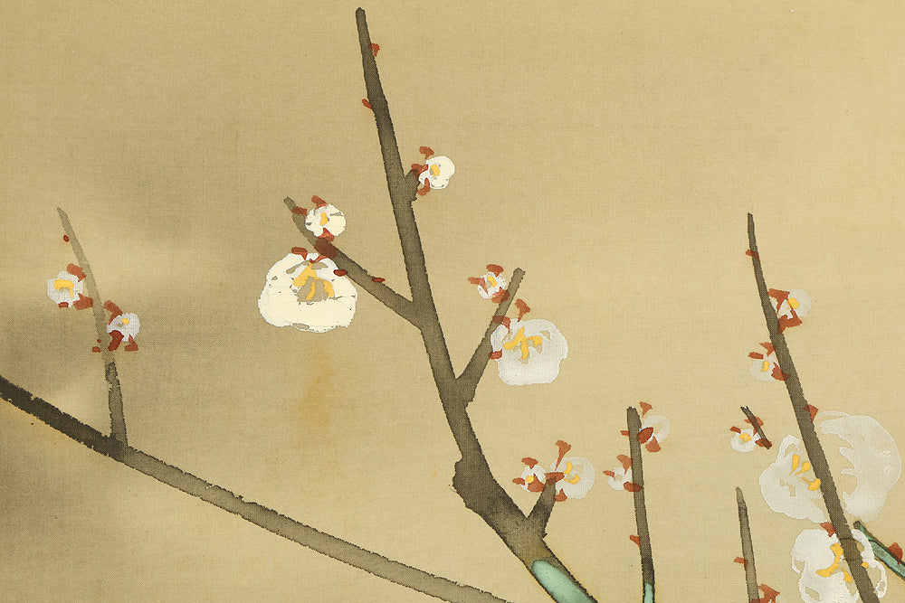 A quiet branch of white plum emerges beneath the soft glow of a full moon in this early‑spring work by Tabira Gyokka (1878–1923), a Shimane‑born painter trained under Kawabata Gyokushō. The blossoms open with a gentle clarity, each petal shaped by Gyokka’s precise yet unforced brushwork, while the pale circular moon behind them creates a depth that feels serene and quietly luminous. The slender branch arcs lightly across the surface, giving the composition a sense of breath and early‑spring freshness, as if the air itself were beginning to warm. Signed “Gyokka” with his seals and dated to the first spring of 1912, the painting reflects the refined sensitivity that defined his short but graceful career. Accompanied by its box, the scroll brings a subtle shift to the atmosphere of a room: its calm interplay of moonlight and plum blossoms introduces a sense of renewal and clarity, encouraging a slower rhythm and a more centered state of mind. Over time, it becomes less a seasonal image and more a quiet reminder of beginnings, resilience, and the gentle optimism that rises when one pauses long enough to notice it.
