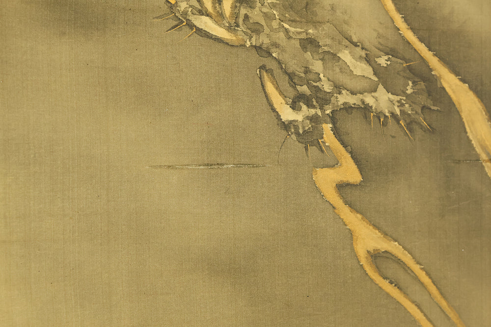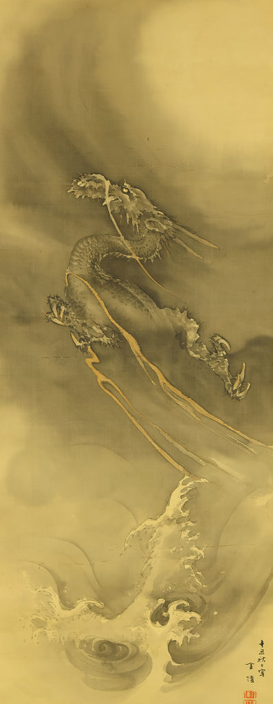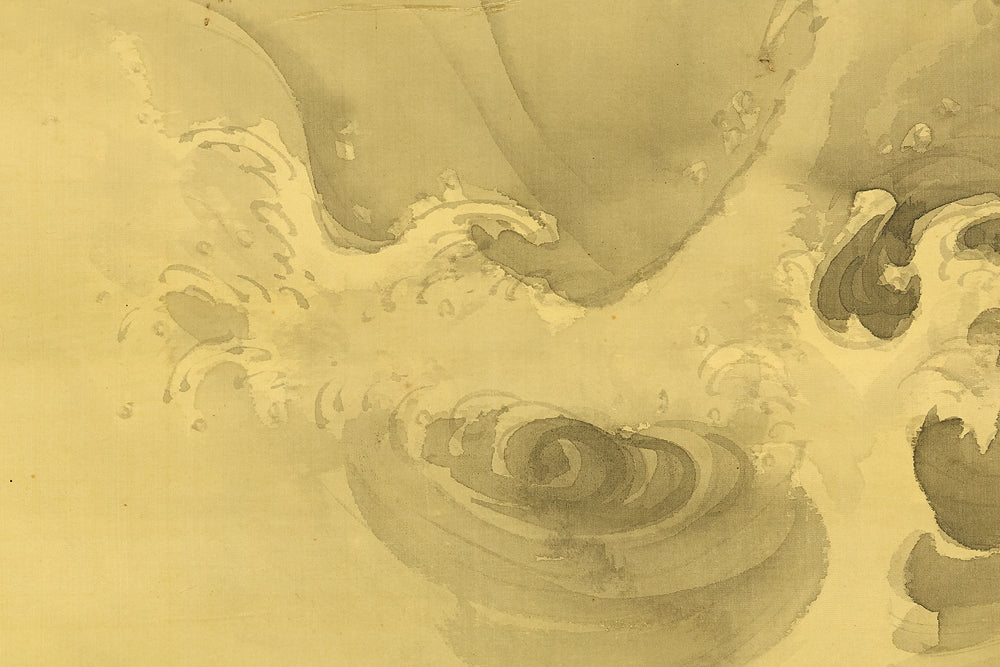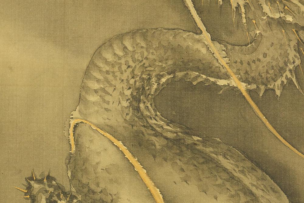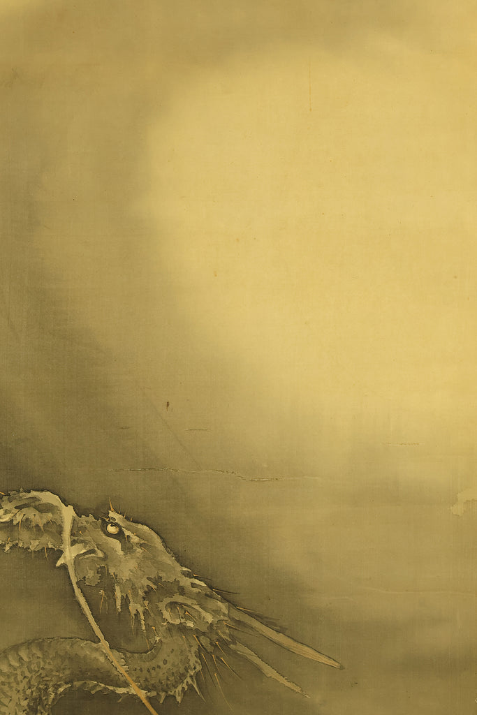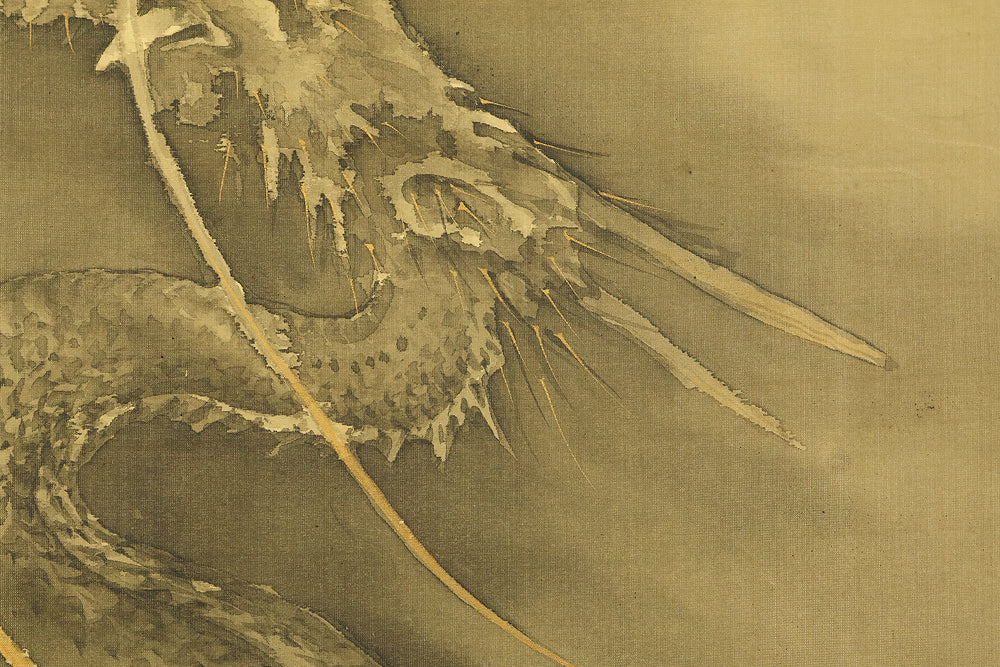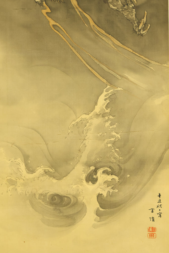 This hanging scroll by Ishii Kinryo, created in 1901, presents a dramatic vision of a dragon rising through swirling clouds above a restless sea, a theme traditionally associated with power, transformation, and auspicious force. Active during the transition from the late Edo into the Meiji period, Ishii Kinryo worked within the classical ink-painting tradition while bringing a heightened sense of movement and atmospheric depth to his compositions. In this work, the dragon’s elongated form emerges dynamically from mist and waves, its upward motion reinforced by the vertical format and fluid ink washes. The contrast between the turbulent waters below and the expansive, drifting clouds above creates a strong sense of depth and momentum, guiding the viewer’s gaze upward through the scene. Executed at the beginning of the twentieth century and accompanied by a fitted storage box, the scroll reflects both the continuity of traditional imagery and the confident expressive energy characteristic of the Meiji era, resulting in a composition that is commanding, refined, and visually compelling.