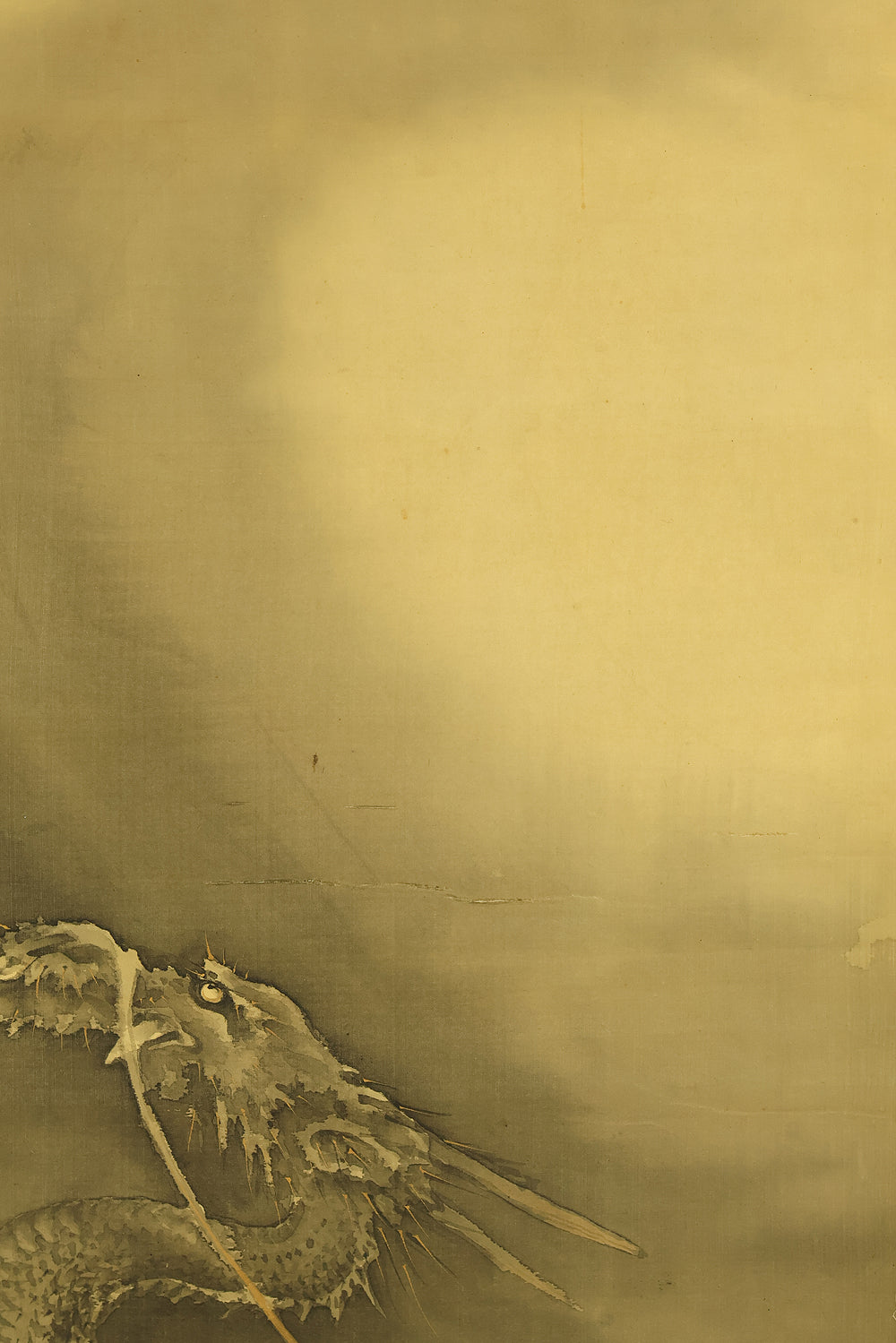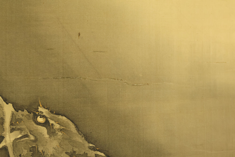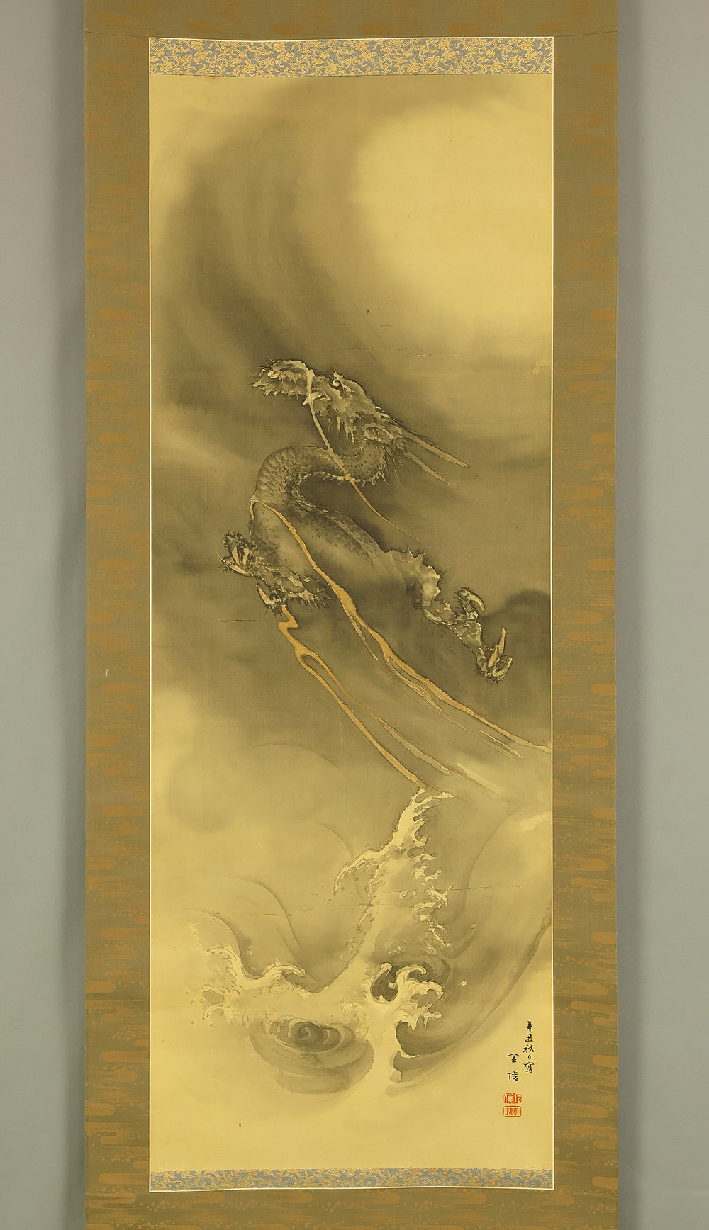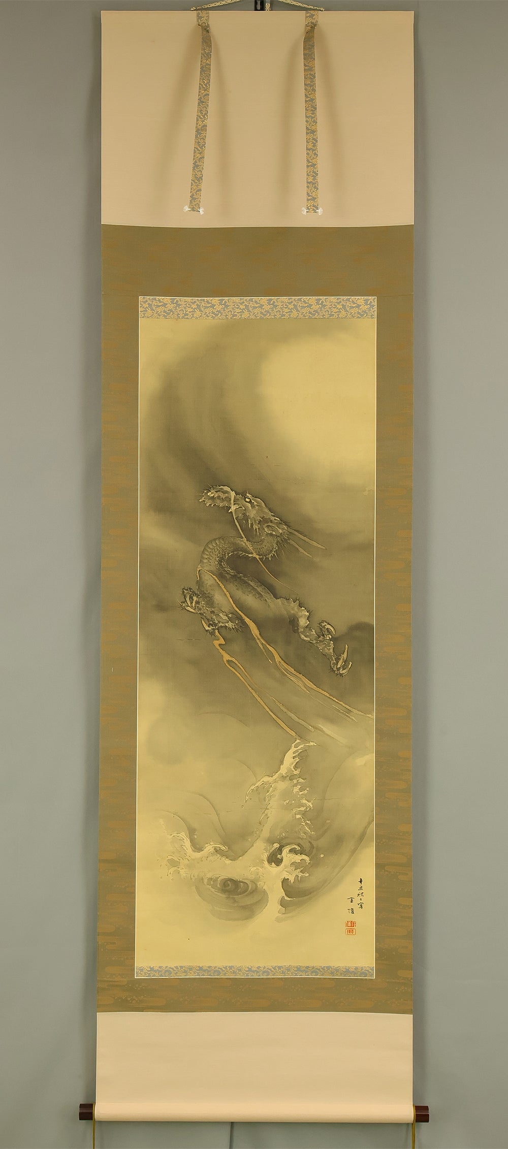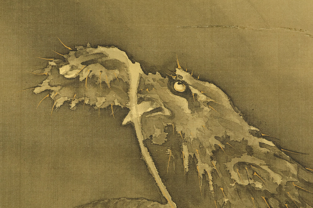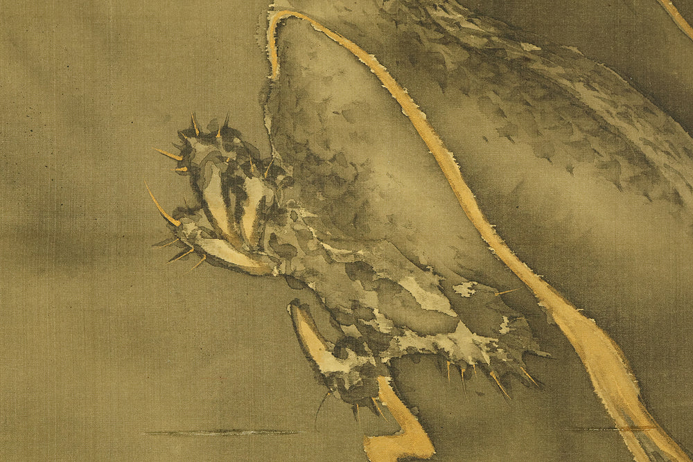 This hanging scroll by Ishii Kinryo, created in 1901, presents a dramatic vision of a dragon rising through swirling clouds above a restless sea, a theme traditionally associated with power, transformation, and auspicious force. Active during the transition from the late Edo into the Meiji period, Ishii Kinryo worked within the classical ink-painting tradition while bringing a heightened sense of movement and atmospheric depth to his compositions. In this work, the dragon’s elongated form emerges dynamically from mist and waves, its upward motion reinforced by the vertical format and fluid ink washes. The contrast between the turbulent waters below and the expansive, drifting clouds above creates a strong sense of depth and momentum, guiding the viewer’s gaze upward through the scene. Executed at the beginning of the twentieth century and accompanied by a fitted storage box, the scroll reflects both the continuity of traditional imagery and the confident expressive energy characteristic of the Meiji era, resulting in a composition that is commanding, refined, and visually compelling.