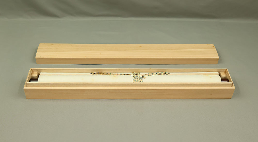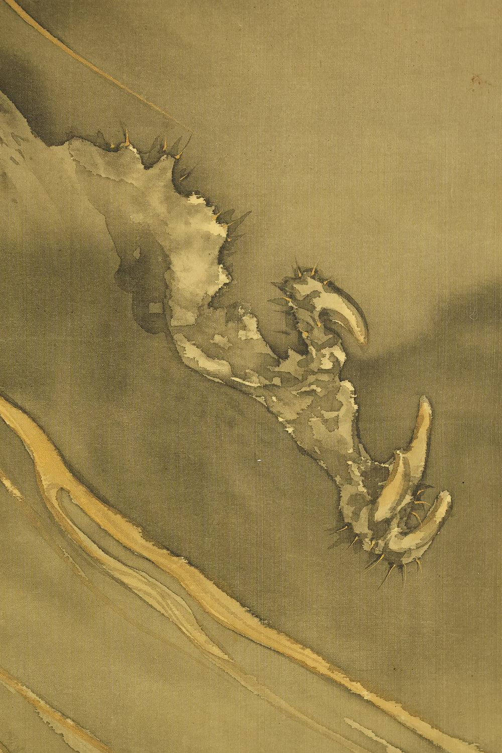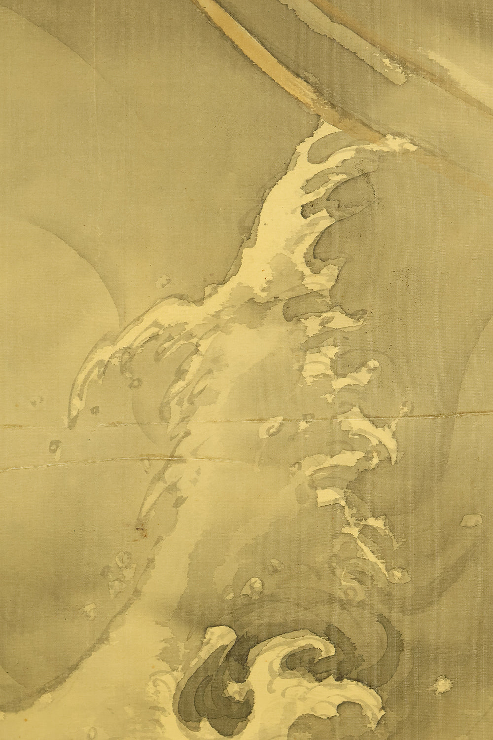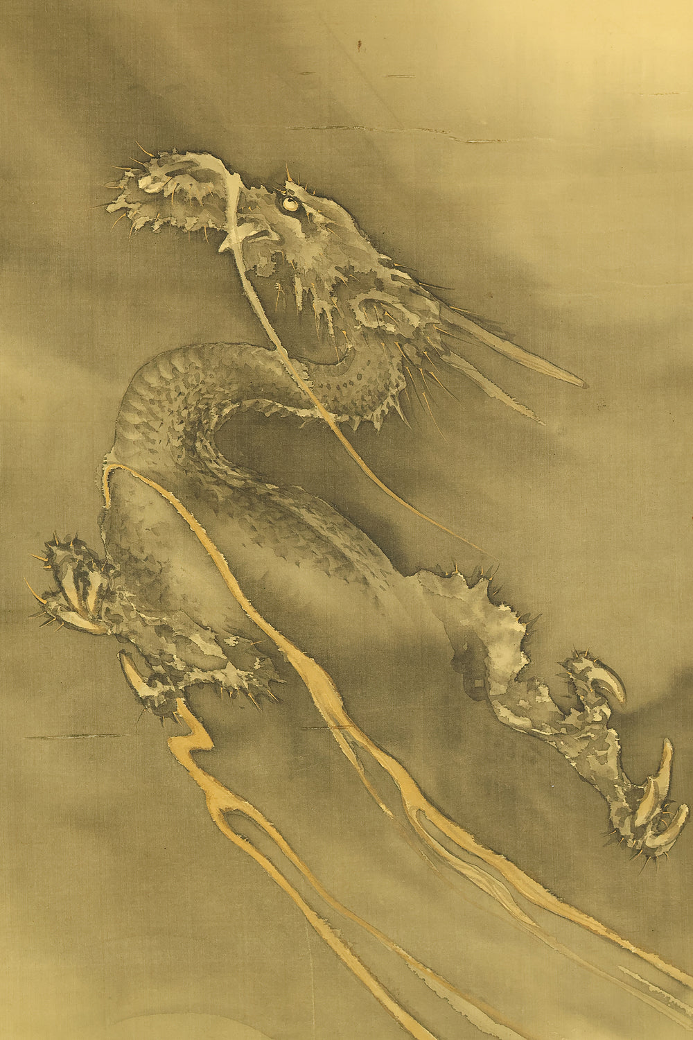This hanging scroll by Ishii Kinryo, created in 1901, presents a dramatic vision of a dragon rising through swirling clouds above a restless sea, a theme traditionally associated with power, transformation, and auspicious force. Active during the transition from the late Edo into the Meiji period, Ishii Kinryo worked within the classical ink-painting tradition while bringing a heightened sense of movement and atmospheric depth to his compositions. In this work, the dragon’s elongated form emerges dynamically from mist and waves, its upward motion reinforced by the vertical format and fluid ink washes. The contrast between the turbulent waters below and the expansive, drifting clouds above creates a strong sense of depth and momentum, guiding the viewer’s gaze upward through the scene. Executed at the beginning of the twentieth century and accompanied by a fitted storage box, the scroll reflects both the continuity of traditional imagery and the confident expressive energy characteristic of the Meiji era, resulting in a composition that is commanding, refined, and visually compelling.