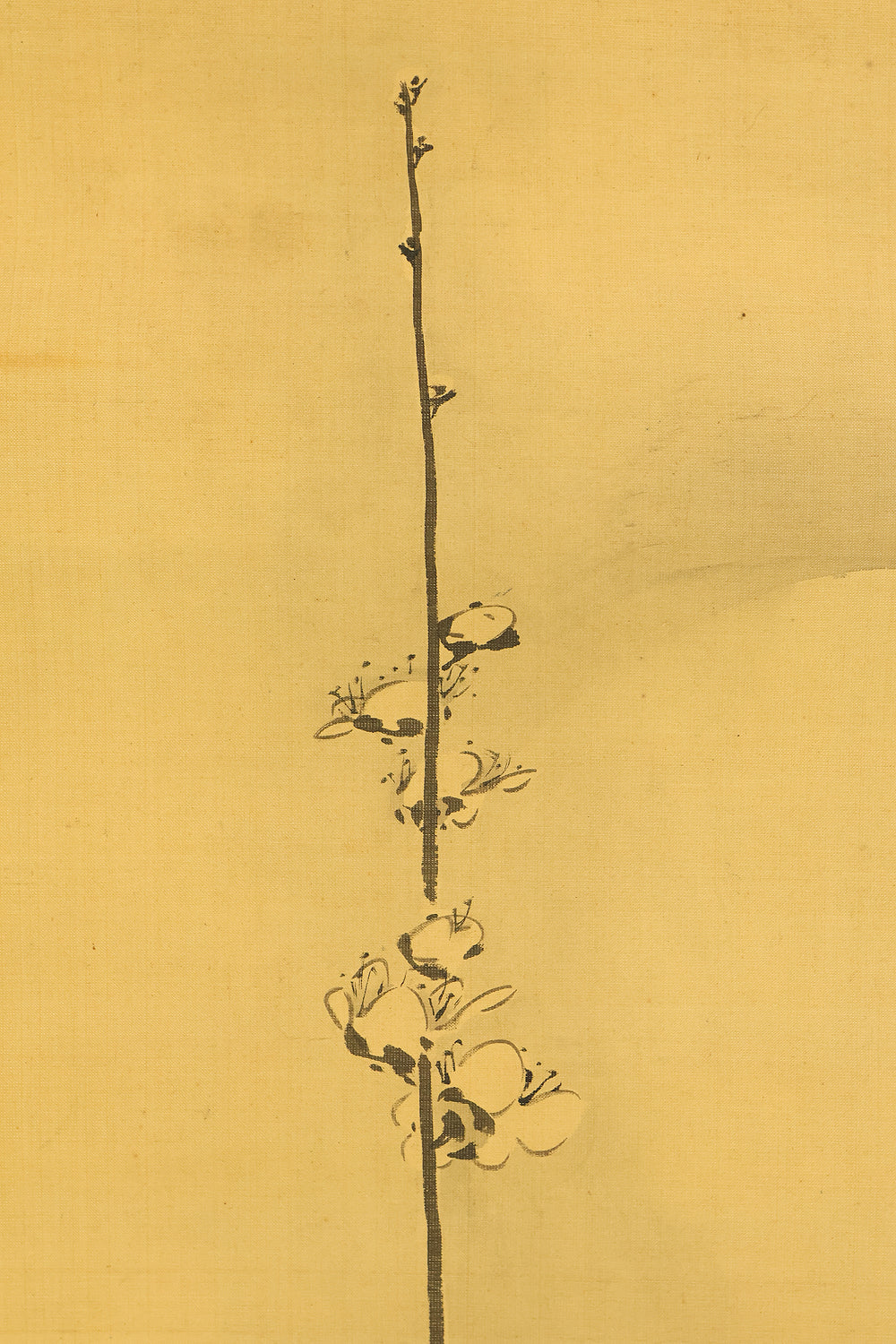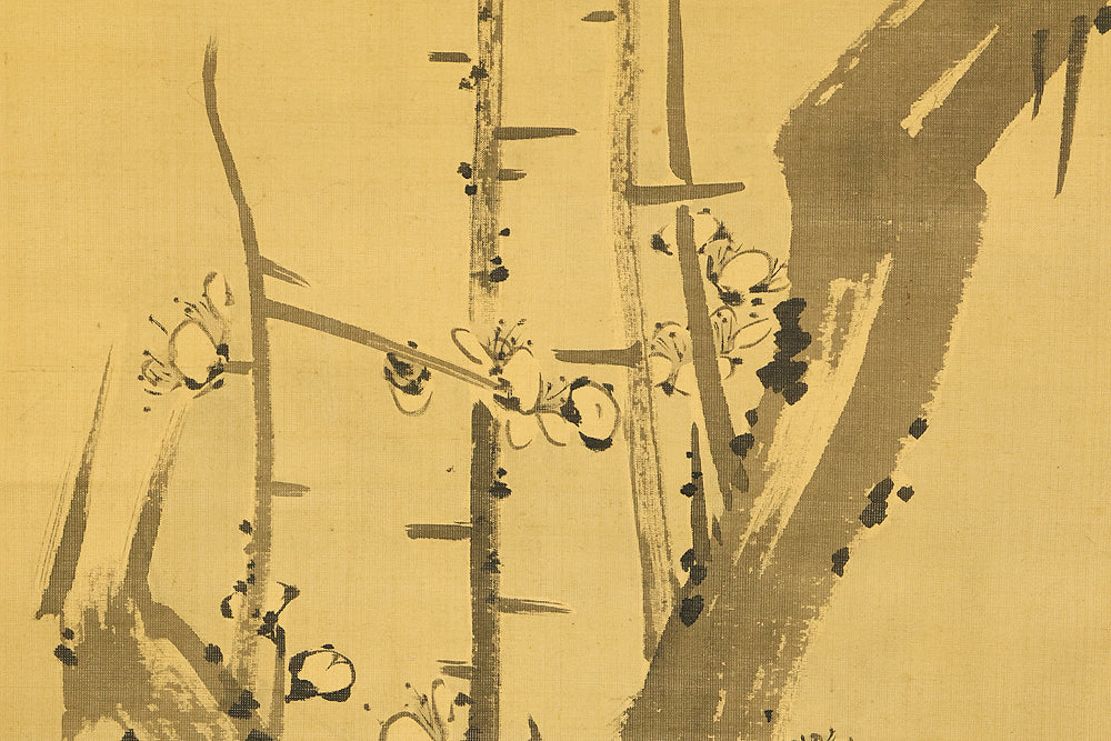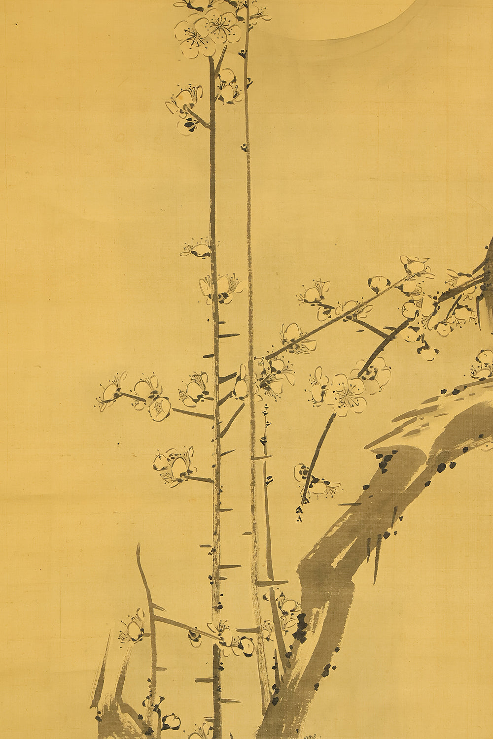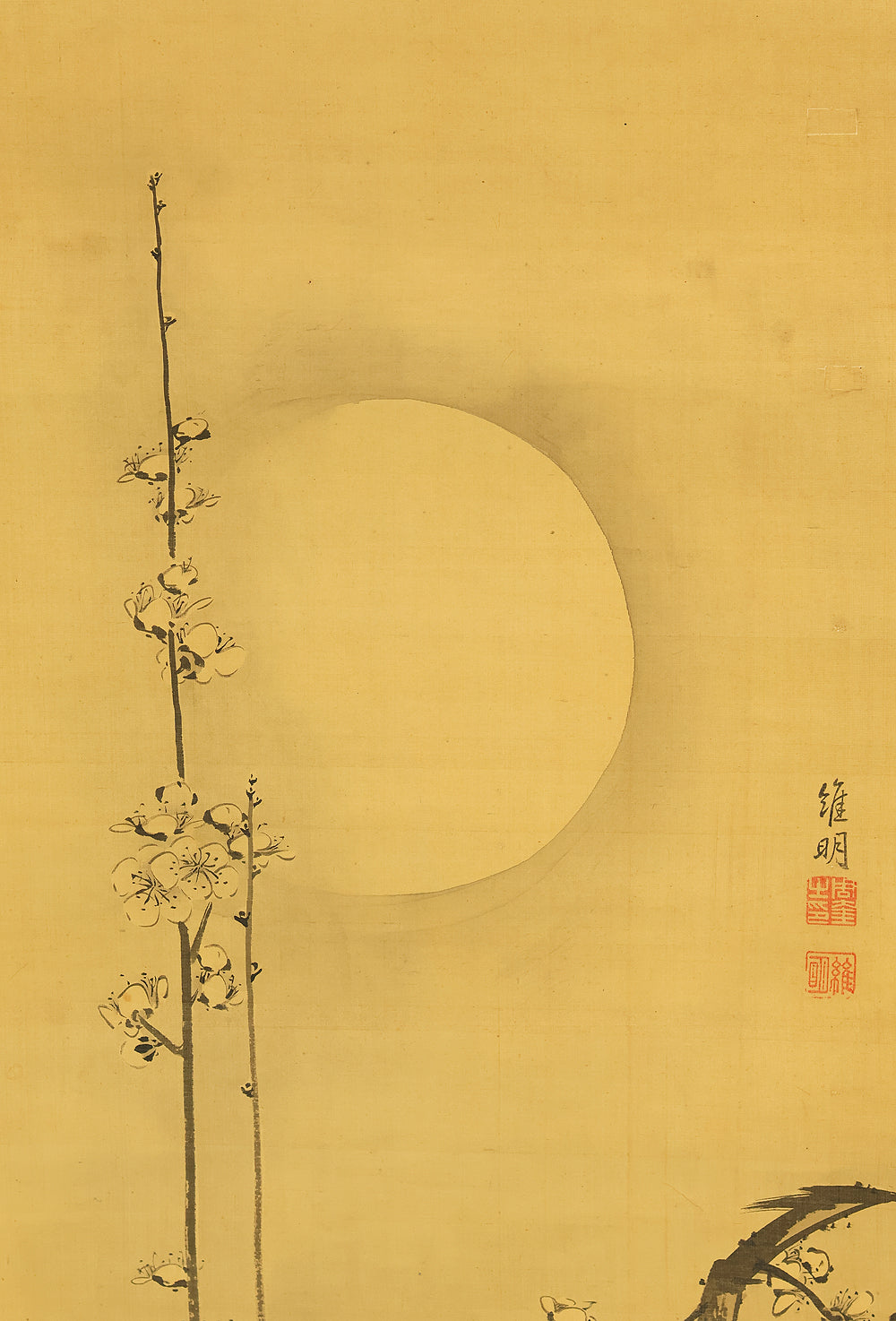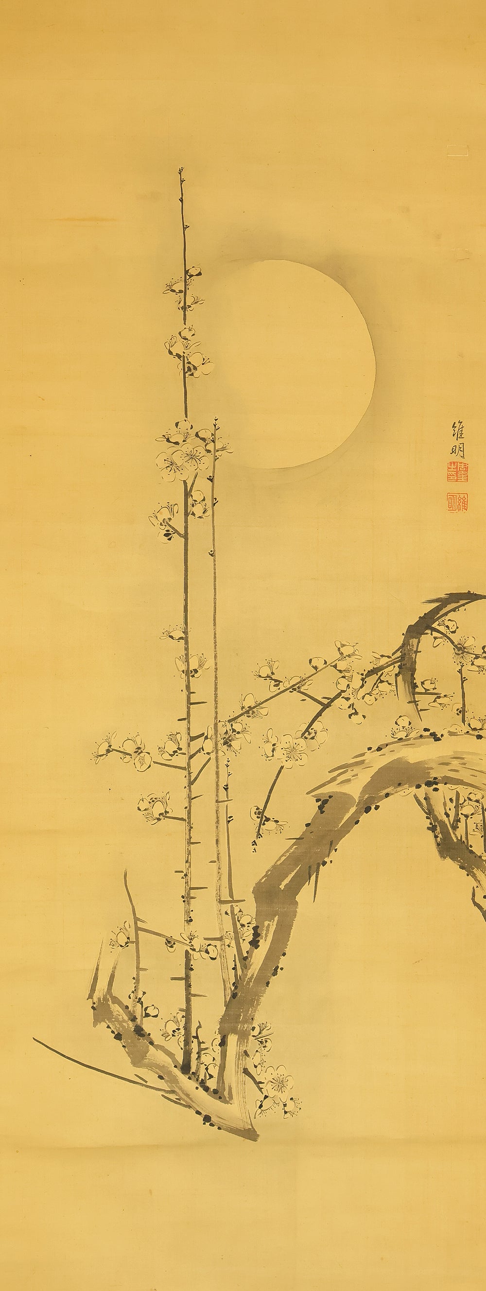 Quietly illuminated by a pale moon, this hanging scroll by Imei Shukei (1731–1808) presents a refined ink depiction of plum blossoms rising against the night sky. Shukei, a Rinzai‑sect monk of the Shōkoku‑ji lineage and a pupil of Ito Jakuchu, channels both spiritual clarity and painterly discipline into the delicate interplay of branches, blossoms, and atmospheric light. The restrained brushwork allows the moon to emerge softly from the surrounding ink wash, while the plum—one of Shukei’s most celebrated subjects—appears with a balance of elegance and vitality. Signed “Imei” and sealed with “Shukei no in” and “Imei,” the work reflects the contemplative sensibility of a monk‑painter whose mastery bridged religious practice and artistic expression. Accompanied by its storage box, the scroll embodies the poetic serenity characteristic of mid‑Edo Zen painting.