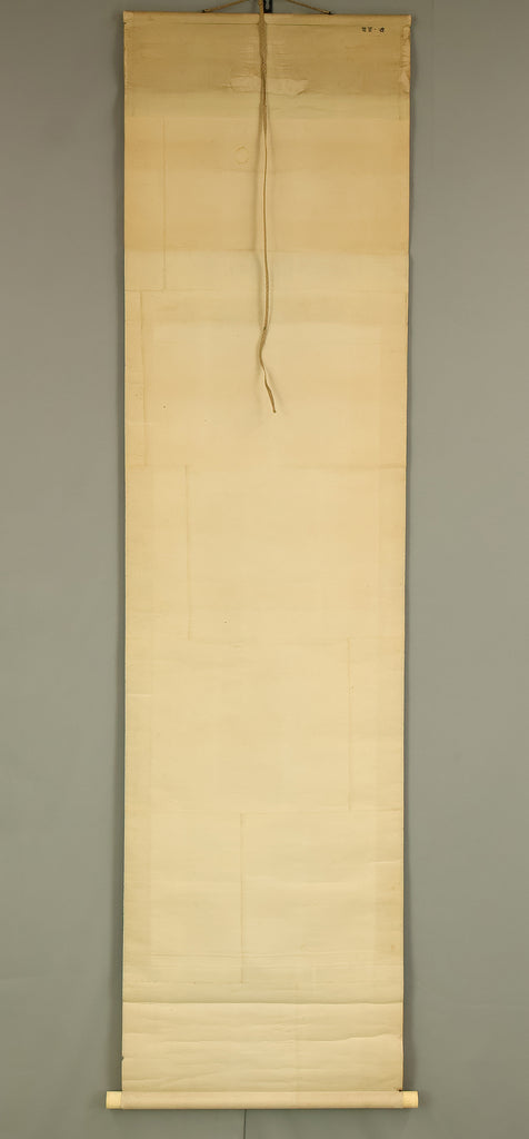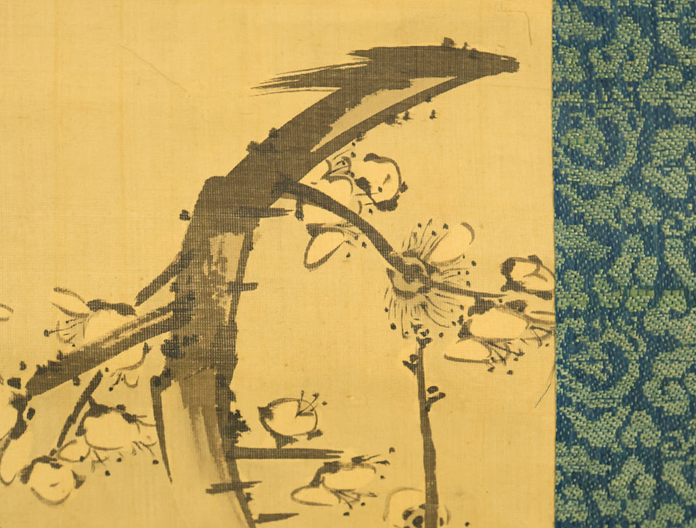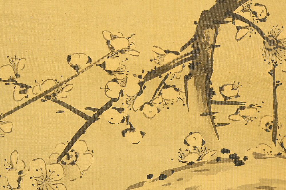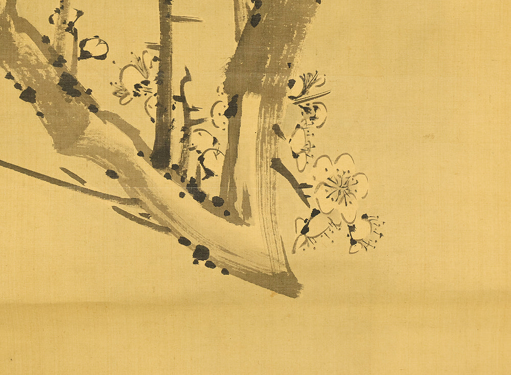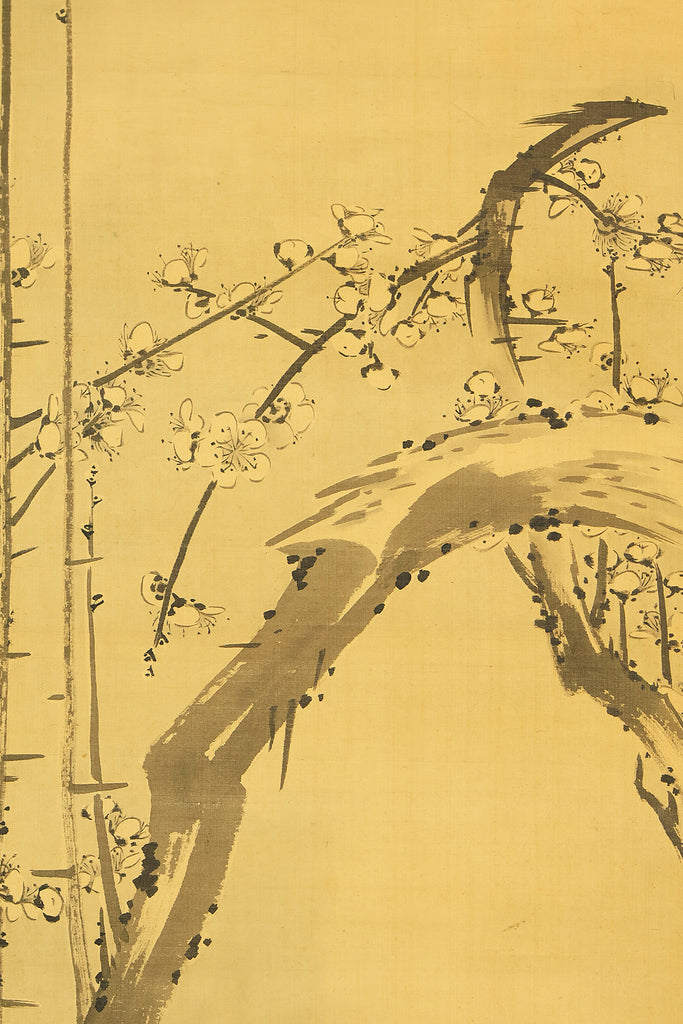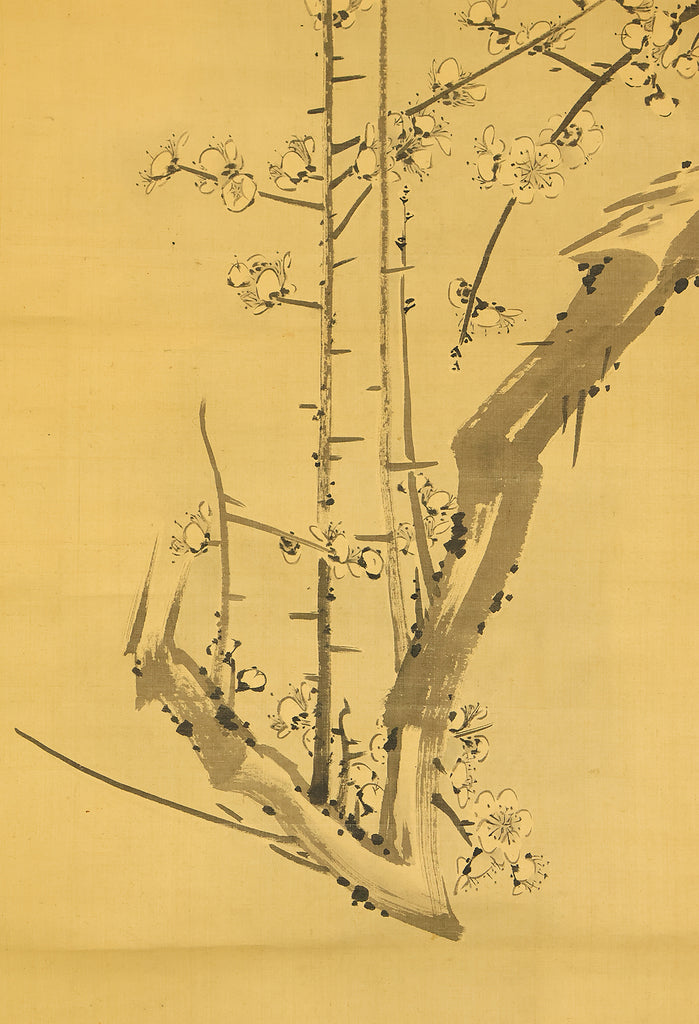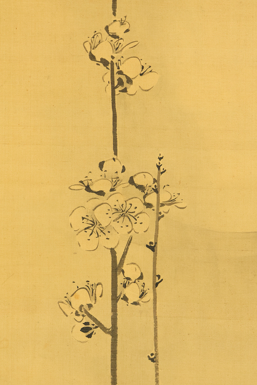 Quietly illuminated by a pale moon, this hanging scroll by Imei Shukei (1731–1808) presents a refined ink depiction of plum blossoms rising against the night sky. Shukei, a Rinzai‑sect monk of the Shōkoku‑ji lineage and a pupil of Ito Jakuchu, channels both spiritual clarity and painterly discipline into the delicate interplay of branches, blossoms, and atmospheric light. The restrained brushwork allows the moon to emerge softly from the surrounding ink wash, while the plum—one of Shukei’s most celebrated subjects—appears with a balance of elegance and vitality. Signed “Imei” and sealed with “Shukei no in” and “Imei,” the work reflects the contemplative sensibility of a monk‑painter whose mastery bridged religious practice and artistic expression. Accompanied by its storage box, the scroll embodies the poetic serenity characteristic of mid‑Edo Zen painting.