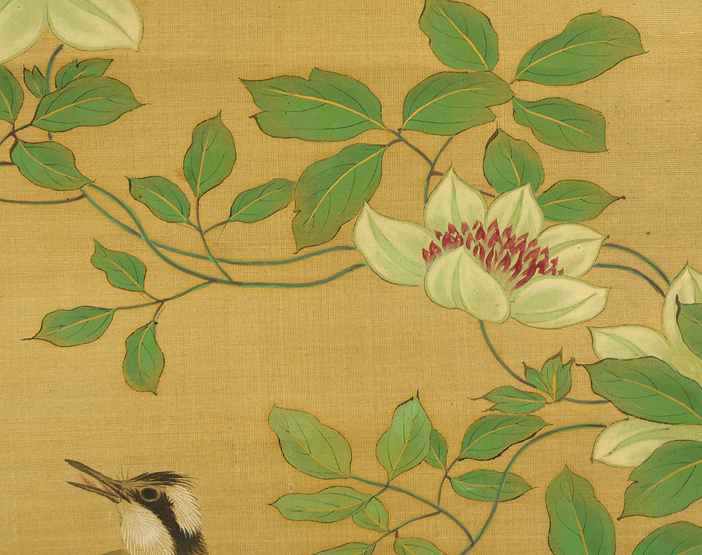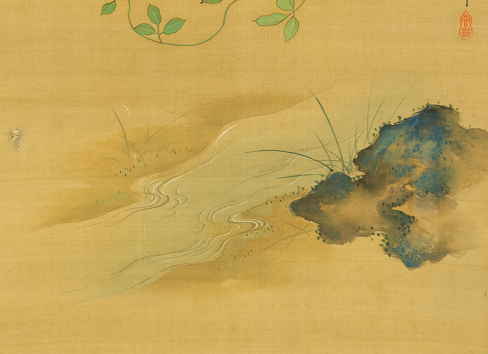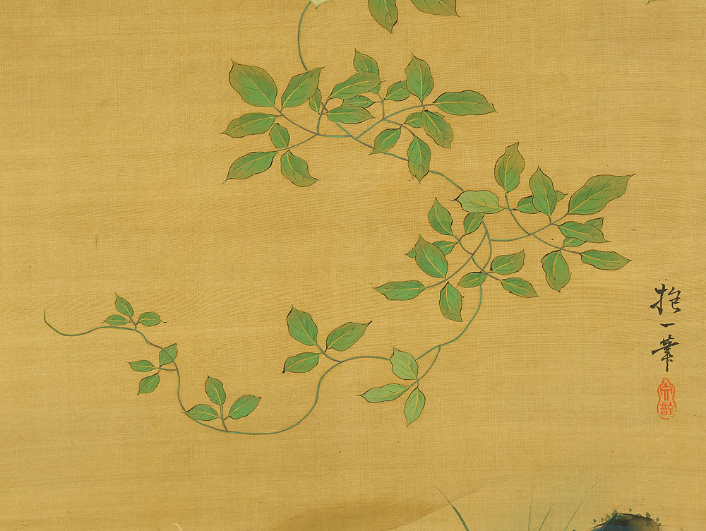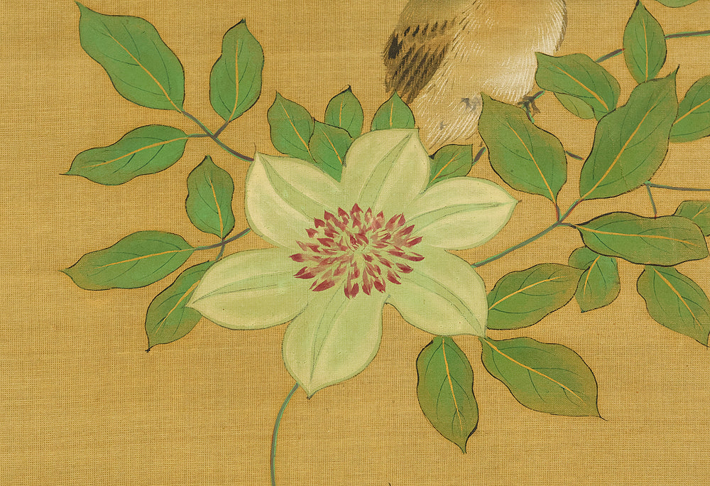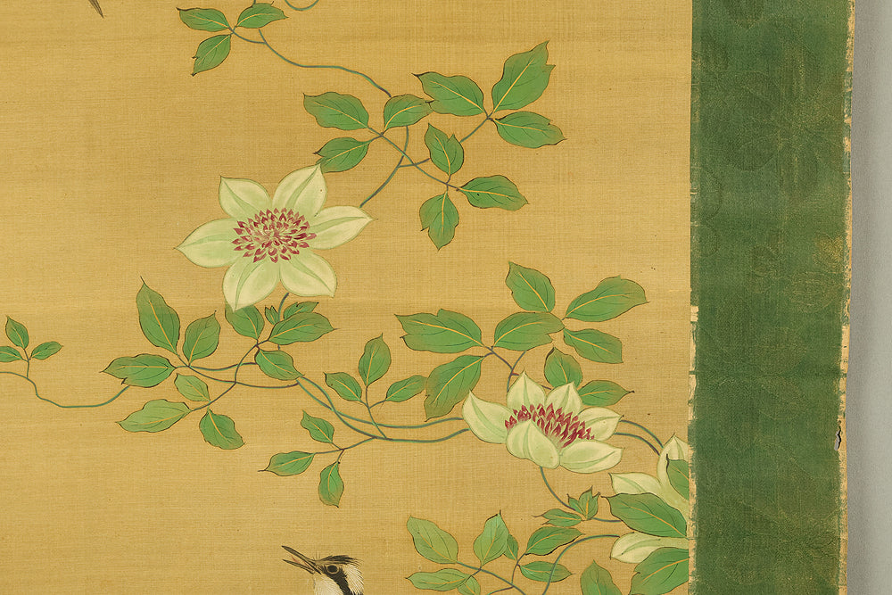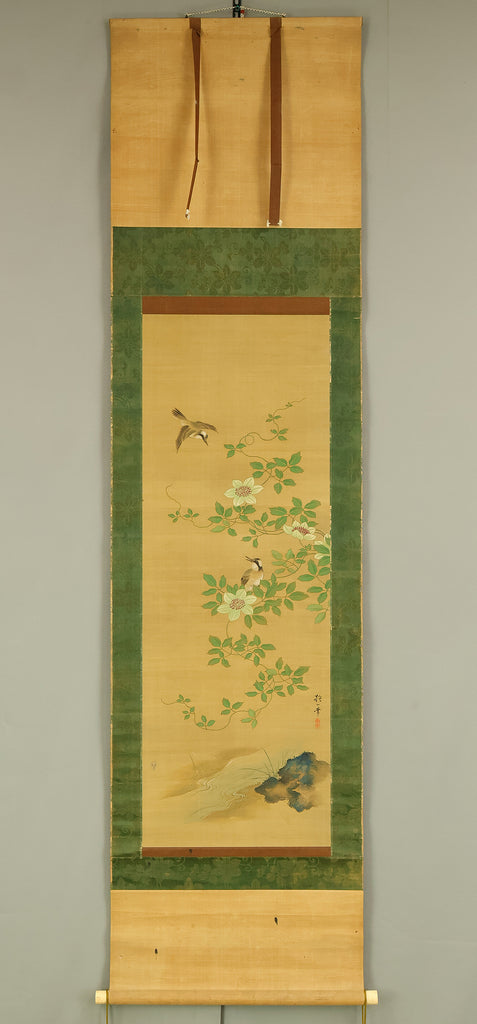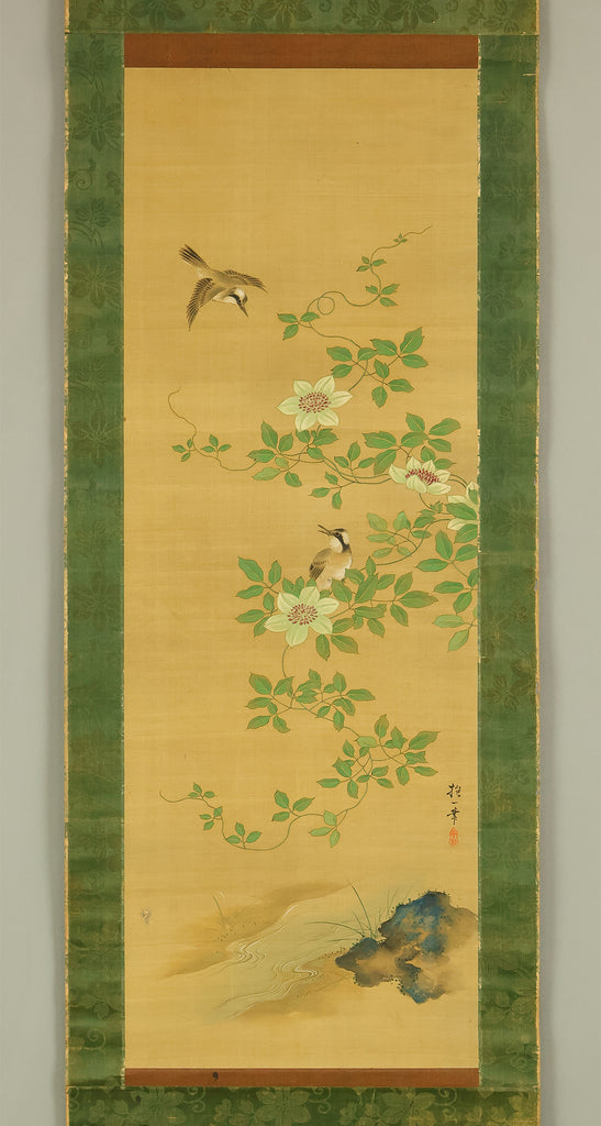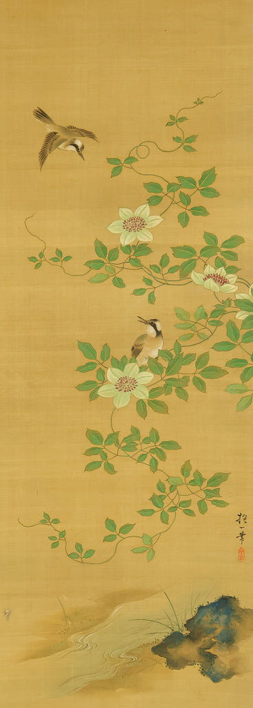 A refined hanging scroll by Sakai Hōitsu, founder of the Edo Rimpa school and one of the most celebrated painters of the late Edo period. The composition features a flowering cretimus vine entwined with delicate foliage, accompanied by two small birds in gentle interaction—an elegant rendering of seasonal vitality and poetic charm. Signed Hoitsu hitsu (抱一 筆) and sealed Bunsen (文詮), the work exemplifies Hōitsu’s mastery of decorative rhythm, lyrical brushwork, and naturalistic detail. Having studied multiple schools—including Kano, Ukiyo-e, Shin Nanpin, Maruyama, and Tosa—Hōitsu ultimately embraced and revitalized the Rinpa tradition of Ogata Kōrin and Ogata Kenzan. This scroll offers a graceful synthesis of classical refinement and Edo-period innovation, ideal for collectors of Rimpa and literati-inspired bird-and-flower painting